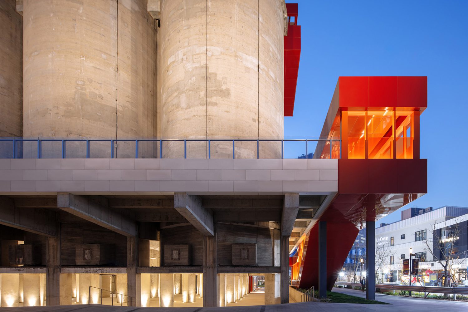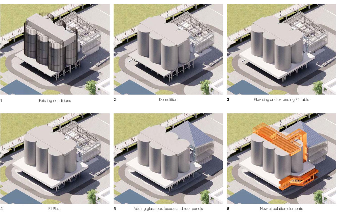 ส่วนกลุ่มอาคารที่สองที่สำคัญในโครงการ GATE M Dream Center คืออาคารไซโลเดิม ซึ่งก็ได้ถูกปรับปรุงเปลี่ยนแปลงใหม่ให้เป็นพื้นที่สำหรับการปีนผาจำลอง โดยทาง MVRDV ยังคงใช้รูปแบบทางเดินสีส้มสีสดใสเหมือนกันกับอาคาร M FACTORY รัดรอบตัวอาคาร เพื่อเชื้อเชิญให้ผู้คนที่เข้ามาในโครงการสามารถเดินเข้าไปชมรอบๆ ของตัวอาคารไซโลได้ พร้อมมีพื้นที่ชั้น 1 ซึ่งเป็นระเบียงขนาดใหญ่เพื่อการใช้งานอเนกประสงค์ และเป็นส่วน core ลิฟต์เพื่อเชื่อมต่อไปยังดาดฟ้าของอาคารไซโล ที่ถูกจัดไว้สำหรับชมวิวมุมสูงของแม่น้ำหวงผู่หรือใช้ไว้จัดกิจกรรมอื่นๆ ได้เช่นกัน