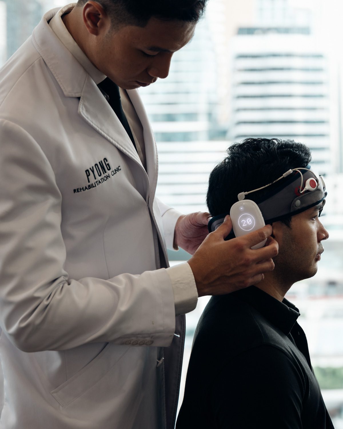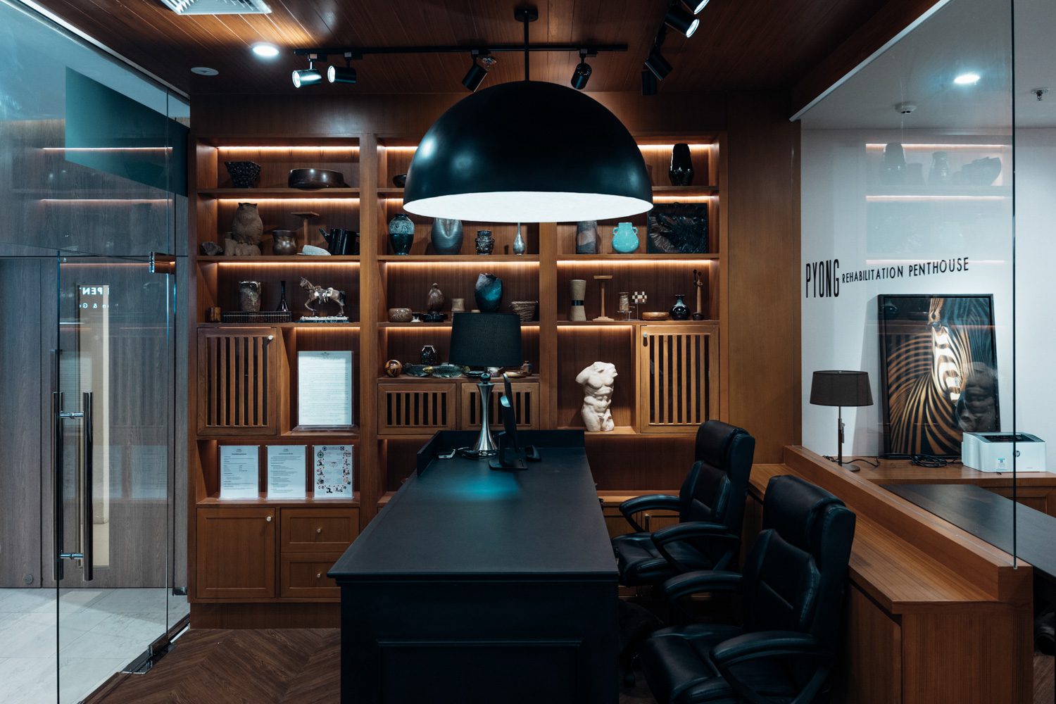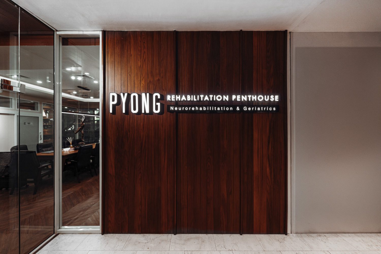 PYONG Rehabilitation Penthouse เป็นคลินิกเวชกรรมฟื้นฟูระบบประสาทและสมองในผู้ป่วยรุ่นใหญ่ด้วยระบบบริการแบบครบวงจร คลินิกแห่งนี้ตั้งอยู่บนชั้น 11 ของตึกเกษร ทาวเวอร์ อาคารที่รายล้อมไปด้วยความคึกคักของย่านราชประสงค์ แต่ภายใน ‘penthouse’ แห่งนี้กลับสงบและได้ยินเสียงแผ่วๆ จากแผ่นเสียง และกลิ่นหอมอ่อนๆ ของดอกไม้อวลอยู่ในมวลอากาศ
