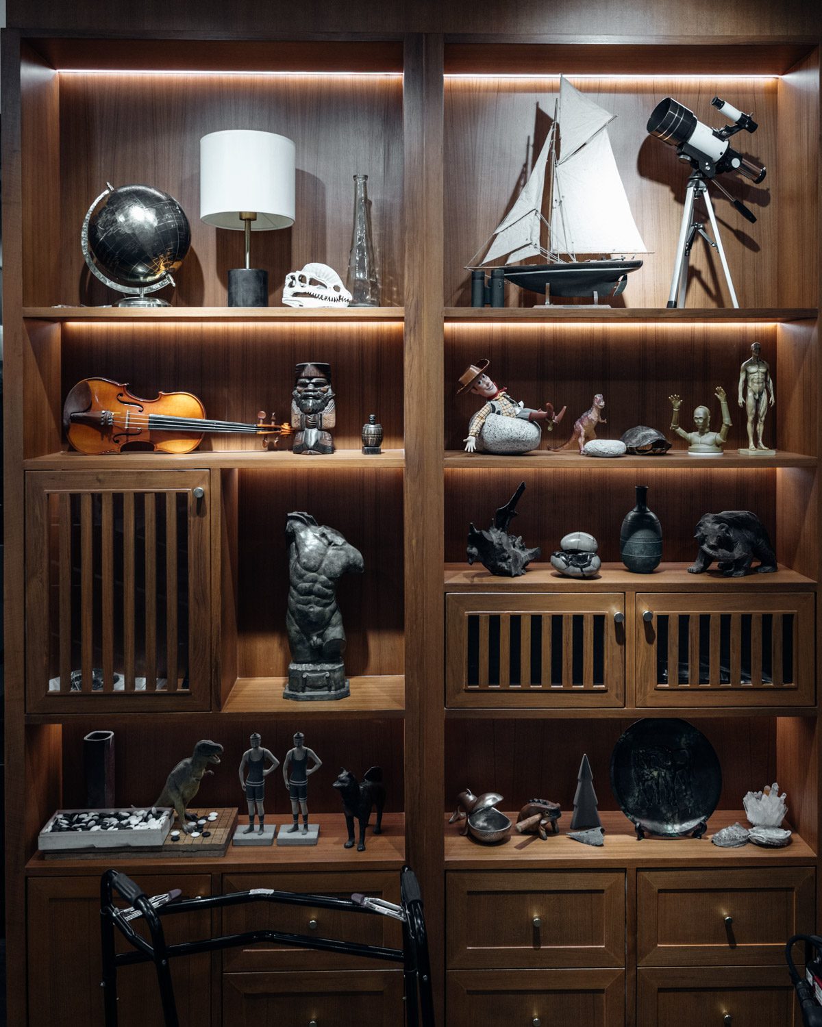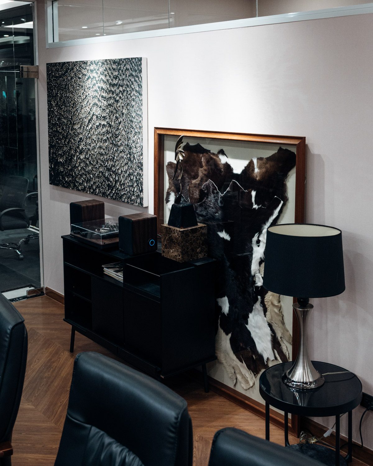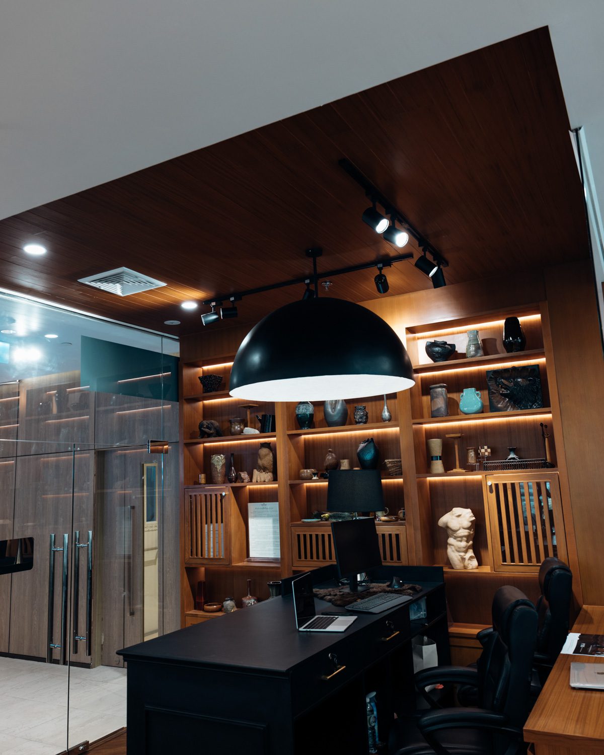 KT: ไม่รู้สบายใจไหมเพราะเป็นวิวตึกสูง แต่นี่คือความรู้สึกในตอนที่เราเห็นสถานที่นี้ครั้งแรก (ชั้น 11 ตึกเกษร ทาวเวอร์) เราเห็นตึกนี้ตั้งแต่เป็นห้องเปล่า ตอนที่ห้องนี้ยังไม่มีอะไรเลย และเราเห็นว่ามุมนี้เหมือน penthouse ที่เราเห็นในนิตยสาร ในโทรทัศน์ เราเลยตั้งชื่อแบบนี้ เช่นเดียวกับการตกแต่งที่มีความ classy masculine การใช้หนัง ไม้ กระจก ซึ่งเป็นภาพจำของ penthouse ในนิวยอร์กเลย