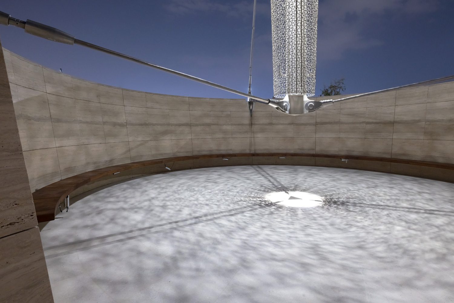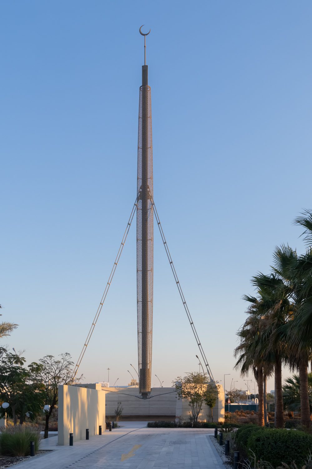เสียงเรียกละหมาดถูกป่าวประกาศผ่านลำโพงบนหอคอยมินาเร็ต (Minaret) ที่ถูกคิดใหม่ เป็นหอคอยตาข่ายเหล็กโครงสร้าง Tensegrity ที่สูงถึง 39 เมตร ลวดลายตาข่ายเหล็กคล้ายคลึงกับลวดลายฉลุบนองค์ประกอบ mashrabiya หรือระเบียงไม้ในสถาปัตยกรรมโลกอิสลาม เมื่อถึงเวลา ลำโพงที่ติดตั้งภายในจะไต่ขึ้นไปสู่ยอดโดยอัตโนมัติ เปล่งเสียงประกาศให้แผ่วก้องทั่วภูมิทัศน์ที่โอบล้อมด้วยพันธุ์ไม้และเนินทรายที่สร้างความเป็นส่วนตัว กันเสียงรบกวนจากภายนอก