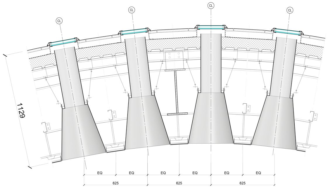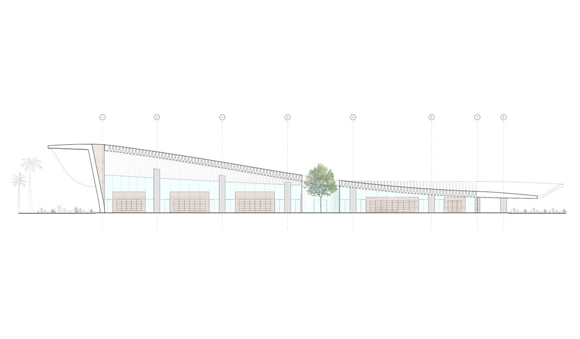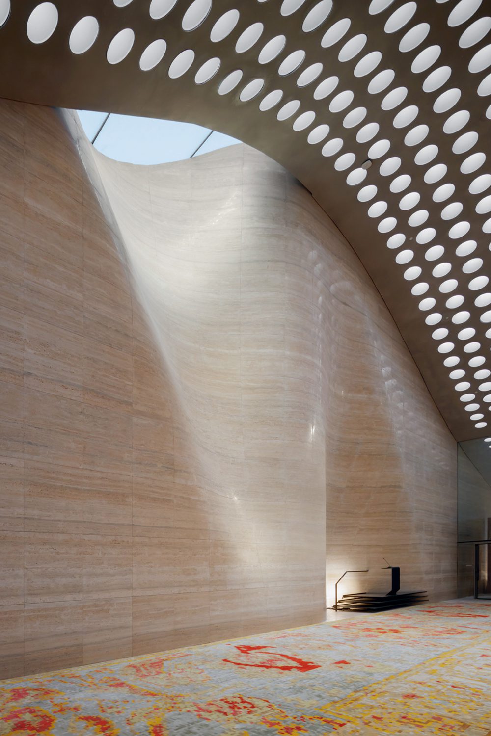แม้ไม่มีโดมเฉกเช่นมัสยิดทั่วไป แต่อาคารสานต่อความเป็นมัสยิดอย่างแยบยลด้วยผืนหลังคาลูกคลื่นที่ยกตัวขึ้นสูงบริเวณโถงละหมาด และค่อยๆ ลาดลงสู่ห้องสมุดในอีกฝั่ง เกิดเอฟเฟ็กต์ของสเปซโถงละหมาดที่โปร่งโล่ง เหมาะกับการจุคนจำนวนมาก และห้องสมุดที่อบอุ่นเป็นกันเอง บนผืนหลังคาเต็มไปด้วยช่องแสงวงกลมกว่า 5,000 ช่อง ที่ช่องกระจายแสงธรรมชาติเข้าไปภายในอย่างทั่วถึง นุ่มนวล แต่ในขณะเดียวกันก็ลดความร้อนไม่ให้ส่องผ่านจนเกินไป