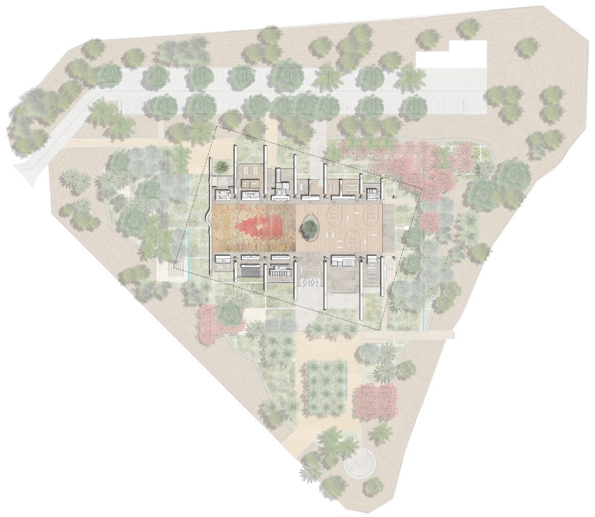 โถงละหมาดและห้องสมุดคือพื้นที่แกนหลักของอาคาร ที่เกาะเกี่ยวโดยรอบคือพื้นที่อื่นๆ เช่น ห้องเรียน คาเฟ่ ตอบเจตนารมณ์การก่อตั้งมัสยิดที่ไม่ต้องการเป็นเพียงศาสนสถาน แต่เป็นแหล่งการศึกษาและพัฒนาศักยภาพของสตรีมุสลิม ผนังหินทราเวอร์ทีนที่แบ่งกั้นห้องนอกจากจะสร้างบรรยากาศอันผ่อนคลาย ยังทำให้อาคารดูกลมกลืนลงตัวไปกับสภาพภูมิประเทศทะเลทรายด้านนอก