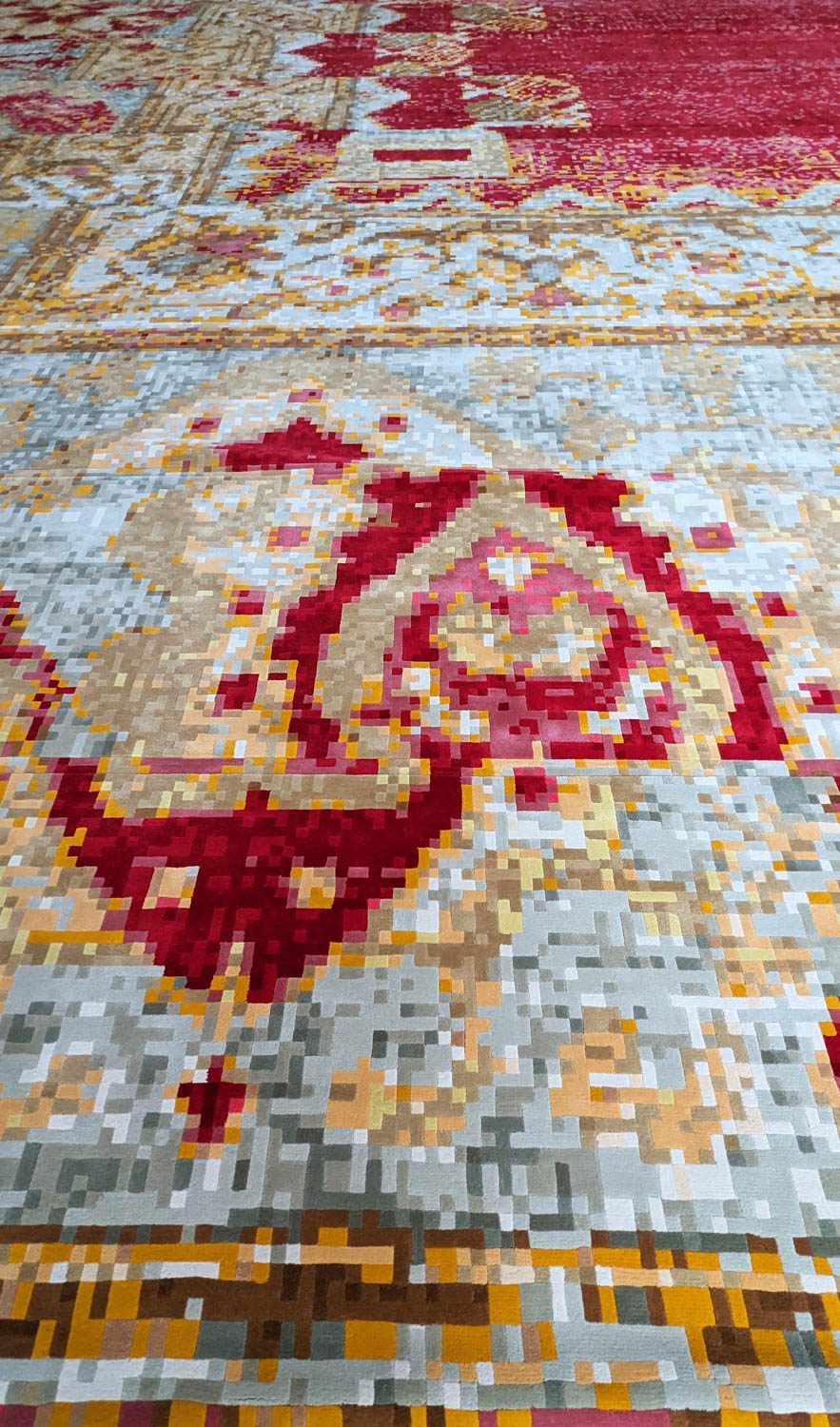 โถงละหมาดมีขนาดใหญ่กว่า 875 ตารางเมตร และรองรับผู้ใช้งานได้มากถึง 1,300 คน ปลายตาคือกำแพงหินทราเวอร์ทีนที่มีแนวเว้าสะดุดตาสองแนว ส่วนเว้าหนึ่งคือตำแหน่งของมิมบัร (Minbar) หรือแท่นเทศน์ที่ลดทอนเป็นแผ่นเหล็กสีดำบางเฉียบ อีกแนวเว้าหนึ่งคือมิหร็อบ (Mihrab) ที่ระบุทิศกิบลัต ในขณะที่มัสยิดตามแบบแผนจะประดับประดามิหร็อบให้รุ่มรวยด้วยรายละเอียด ซุ้มมิหร็อบของที่นี่กลับเรียบง่าย แต่ทรงพลังด้วยการเผยอหลังคาเปิดช่องให้แสงธรรมชาติอาบผนังหินอย่างงดงาม พื้นโถงปกคลุมด้วยพรมผืนใหญ่ที่ถักทอด้วยขนแกะนิวซีแลนด์ ลายของพรมเกิดจากการนำลายพรมละหมาดตุรกีมาขยายใหญ่ สร้างจุดพิกเซลเล็กน้อยที่ทำให้พื้นที่อันกว้างขวางไม่เวิ้งว้างจนเกินไป