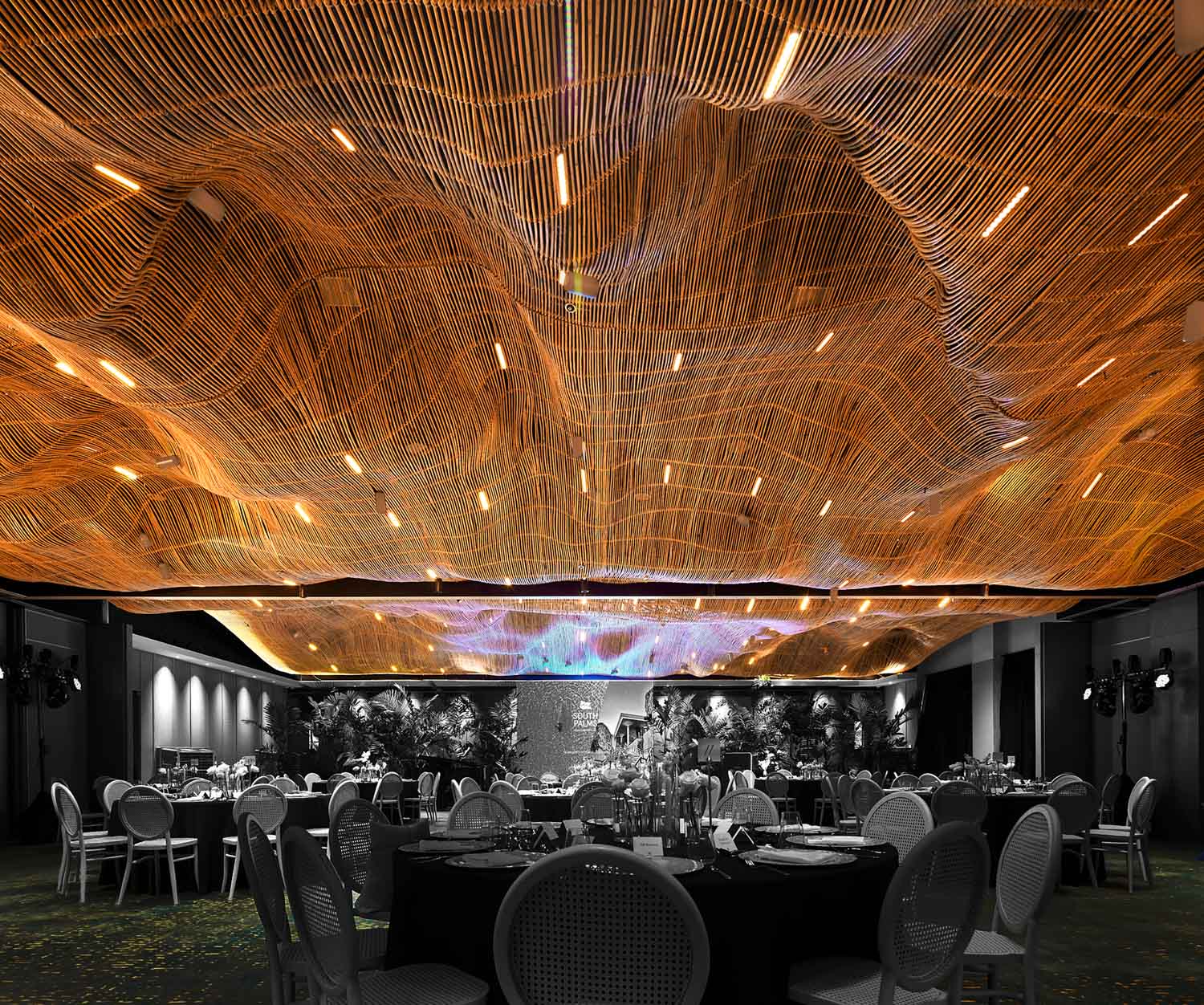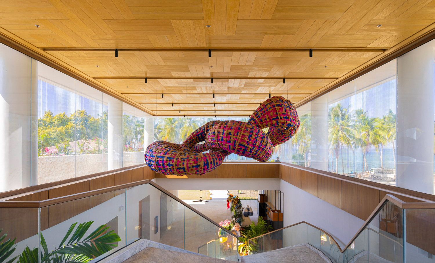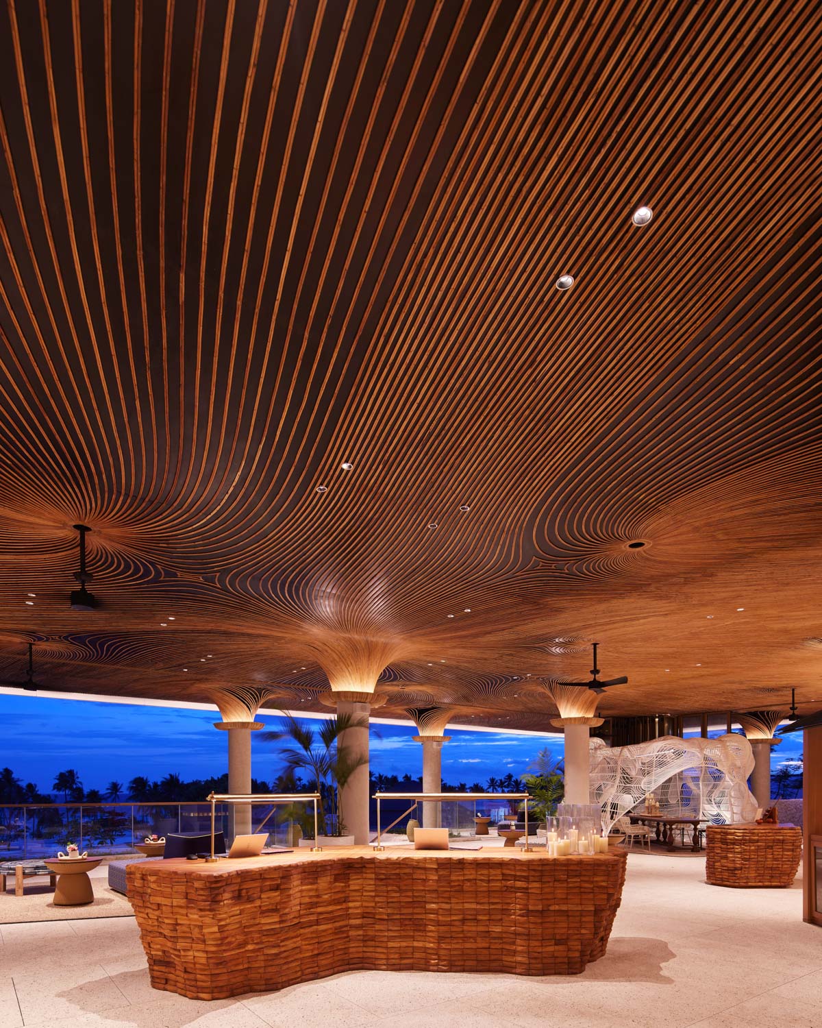 เมื่อเข้ามาด้านในล็อบบี้ เราจะพบเอกลักษณ์ของรีสอร์ทได้อย่างชัดเจน จาก ‘ฝ้าไม้’ ที่ Enter Projects Asia (EPA) ได้ออกแบบด้วยเส้นสายคดโค้ง ซึ่งมีความแข็งแรงแต่ดูบางเบาในเวลาเดียวกัน จุดที่น่าสนใจคือ เพดานของรีสอร์ทไม่ได้เป็นเพียงโครงสร้างทั่วไป แต่ถูกออกแบบให้เป็น ‘environment statement’ ที่สื่อสารถึงประเด็นสิ่งแวดล้อมของพื้นที่ซึ่งได้รับผลกระทบจากเศษพลาสติกในอุตสาหกรรมประมง EPA จึงสร้างจังหวะขึ้น–ลงของเพดานโดยได้แรงบันดาลใจจาก ‘กระแสน้ำวน’ ผ่านการจำลองด้วยระบบดิจิทัล เพดานทอดตัวยาวจากล็อบบี้ด้านหน้าไปจนถึงห้องประชุม นอกจากนั้น คลื่นของเพดานยังสอดคล้องกับประติมากรรมหวายสีขาวบริเวณล็อบบี้ และโคมไฟที่ถักจากวัสดุรีไซเคิล ทั้งสองชิ้นต่างออกแบบด้วยฟอร์มบิดเกลียวในลักษณะเดียวกัน