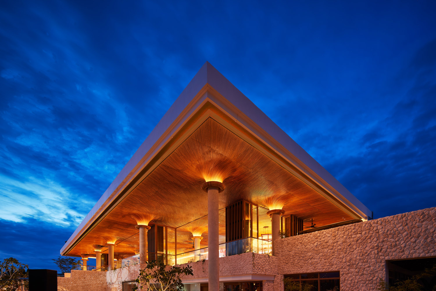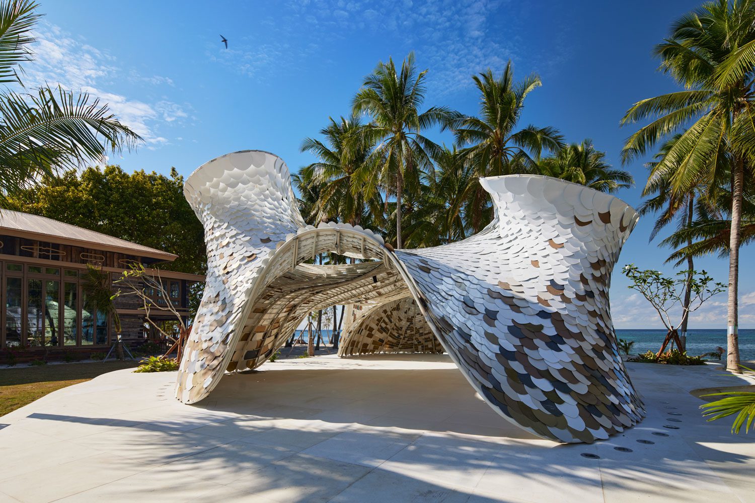 โดยองค์ประกอบที่เชื่อมโยงระหว่างมนุษย์ ธรรมชาติ และพื้นที่รีสอร์ทแห่งนี้ คือสะพานไม้ที่คดเคี้ยวทอดยาวอยู่ตามแนวของรีสอร์ทซึ่งสอดผสานไปกับแนวต้นไม้และพุ่มไม้รอบข้าง เส้นทางนี้พาเราไปสู่พาวิลเลียนสีขาวปะการังแซมด้วยเฉดสีทราย ขนาด 95 ตารางเมตร ที่ตั้งอยู่บริเวณด้านหน้าชายหาด โดยพาวิลเลียนหลังนี้ได้แรงบันดาลใจมาจาก ‘เปลือกหอย’ โดยการมุงหลังคาแบบเรียงซ้อน พร้อมบิดโค้งฟอร์มของพาวิลเลียนไปมา เกิดเป็นพาวิลเลียนที่เปิดรับลมทะเลเย็นสบายและนำเสนอทิวทัศน์ของต้นปาล์มที่เรียงรายอยู่บนชายหาดเบื้องหน้า
