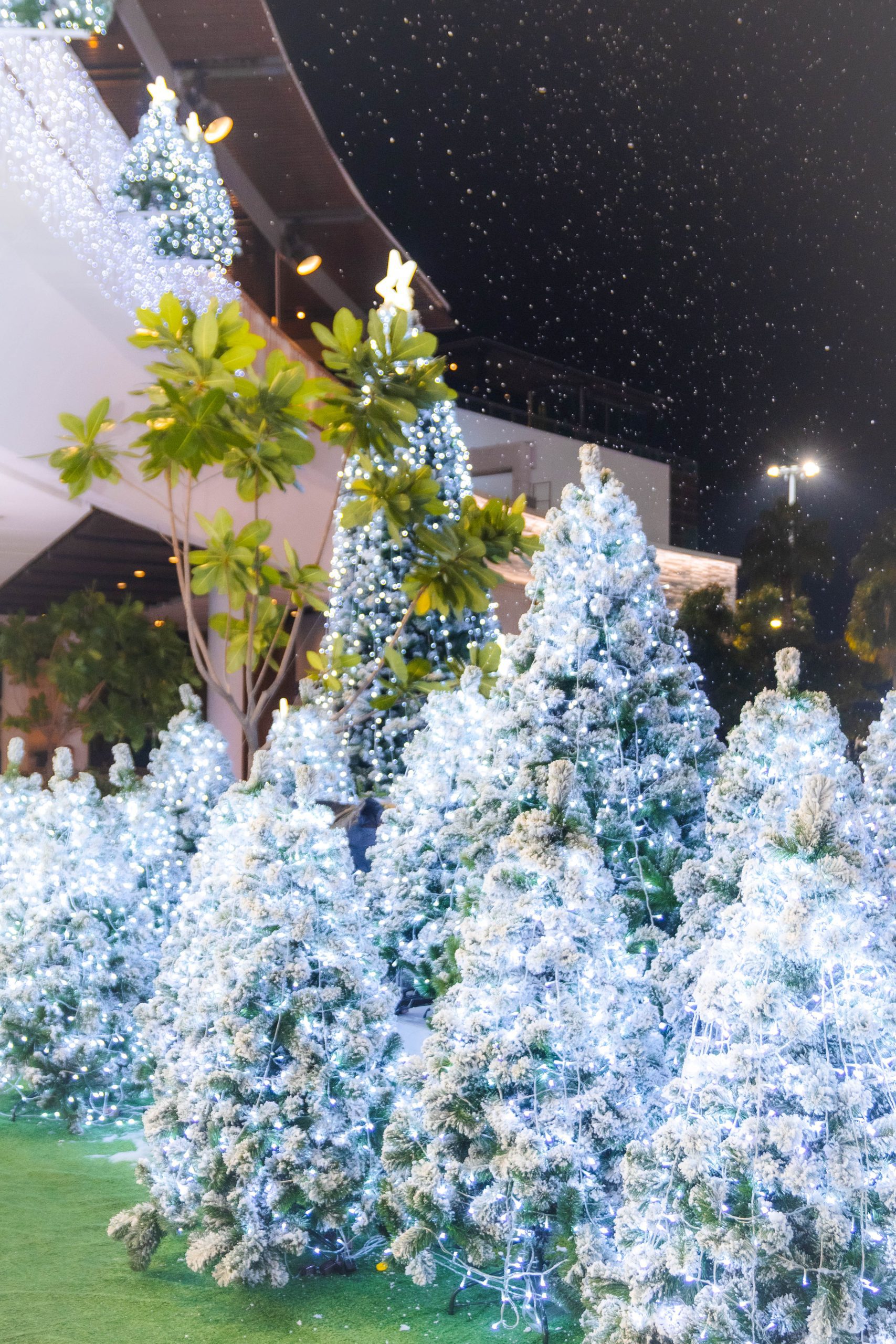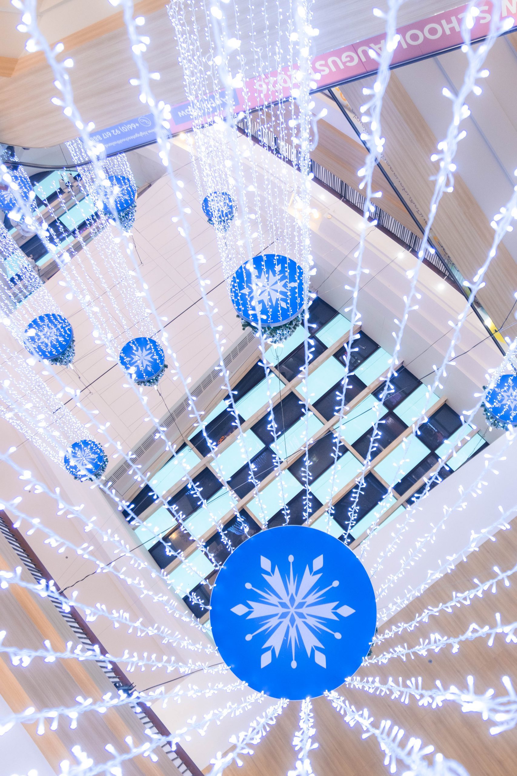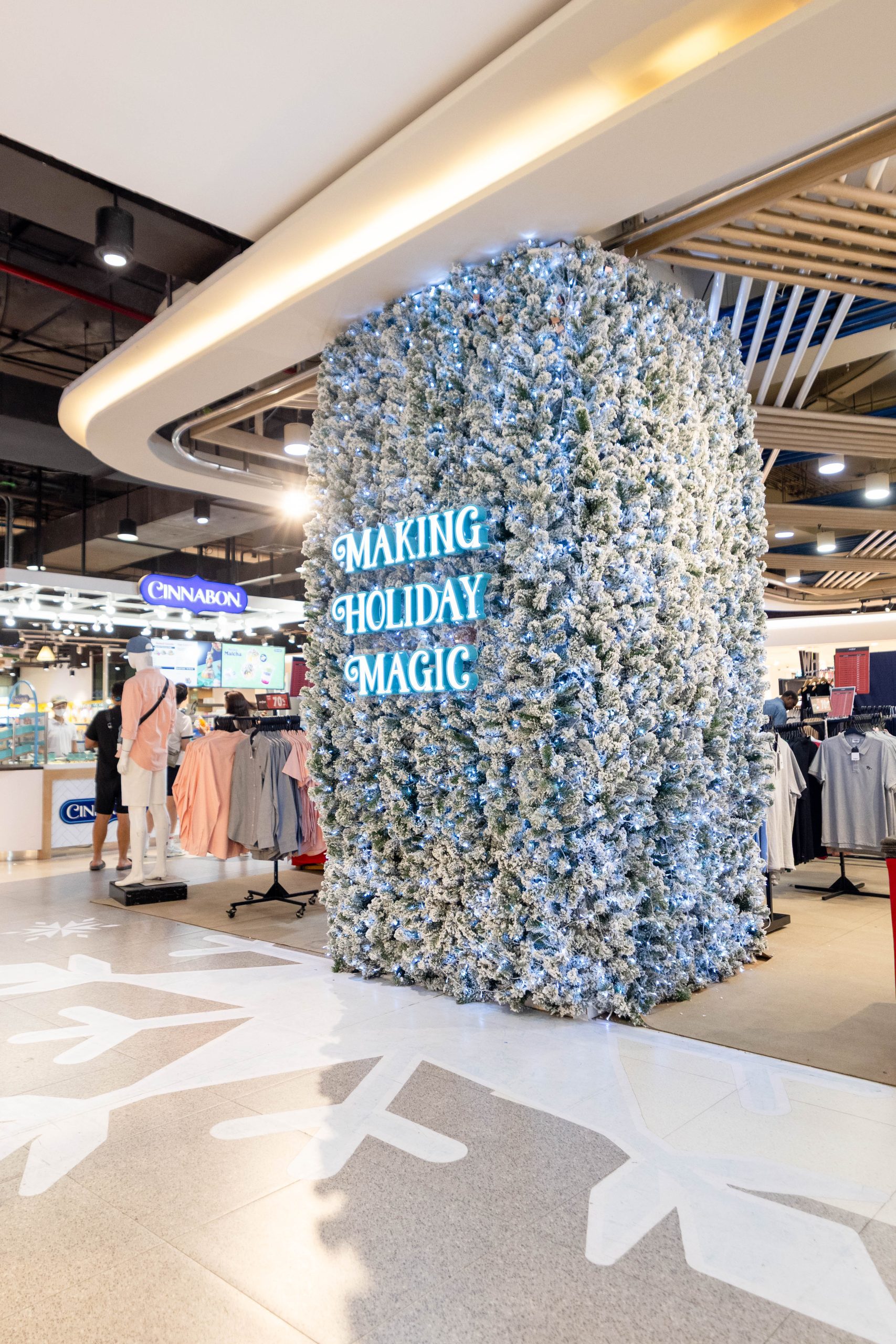 ความน่าสนใจอีกประการคือการสอดแทรกประสบการณ์ความเย็นลงไปในหลายพื้นที่ โดยมีการปรับเปลี่ยนให้เข้ากับบริบทของแต่ละจุดอย่างลงตัว เช่น บริเวณ Atrium กลางที่ถูกเนรมิตให้เป็นสวนสนลอยฟ้า พร้อมสายไฟ LED ที่ห้อยโรยลงมาดั่งหิมะโปรยปราย แม้แต่เสาอาคารก็ถูกพรางตาด้วยใบไม้เขียวชอุ่มจนกลายเป็นป่าสนเฉพาะกาล ช่วยเติมแต่งบรรยากาศภายในศูนย์การค้าให้ดูมีชีวิตชีวาและร่มรื่นไปพร้อมกัน