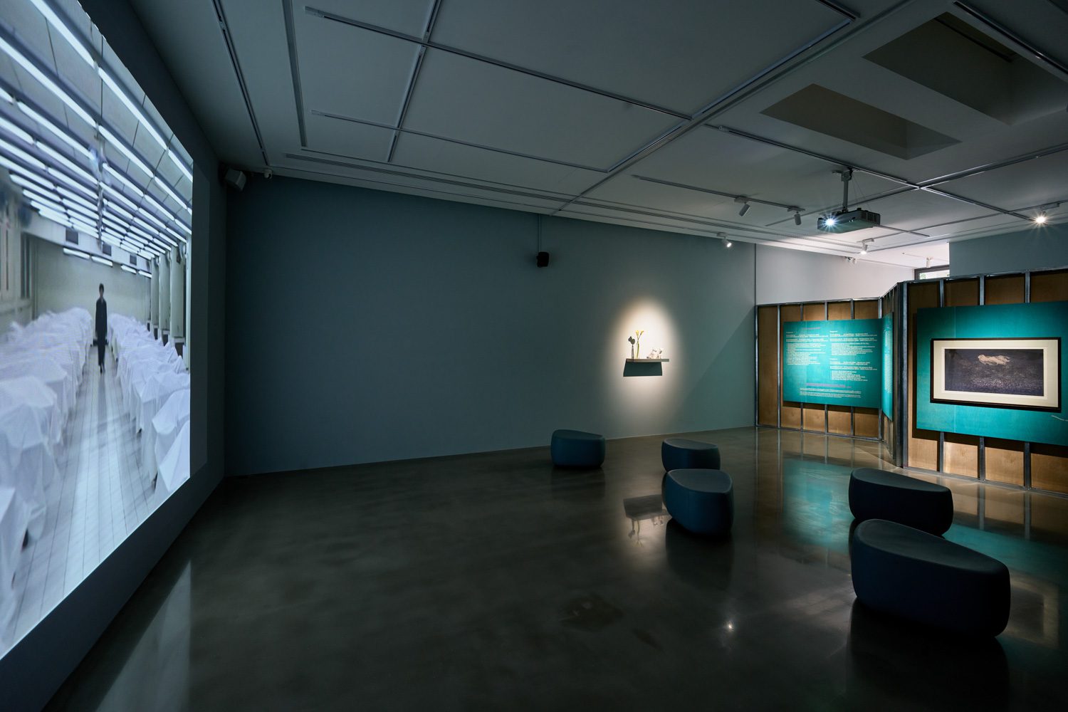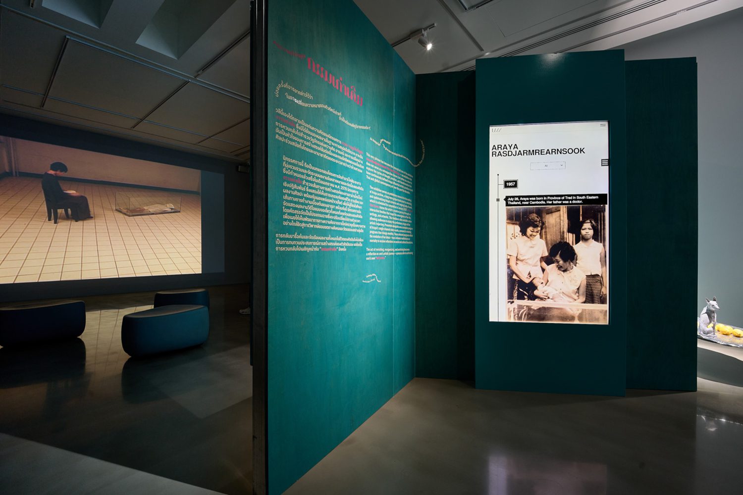 สิ่งที่น่าสนใจในนิทรรศการนี้ คือ พื้นที่ฉายผลงานวิดีโอที่พื้นที่กว่าครึ่งหนึ่งของห้องจัดแสดง โดยสุดทางของห้องเป็นจอขนาดใหญ่ใช้รับภาพจากโปรเจกเตอร์ พื้นที่ว่างกลายเป็นที่นั่งรับชมในห้องเย็นเยียบและเงียบงัน เสียงที่ดังมีแต่เสียงที่เปล่งจากลำโพง สิ่งที่เห็นก็มีแต่ภาพบนจอที่จัดเรียงทั้งหมด 3 โปรแกรม ซึ่งแตกต่างไปในแต่ละช่วงของนิทรรศการ อันสะท้อนถึงระยะเวลาการสร้างผลงานและความคิดของอารยาต่อโลก ศิลปะ และเนื้อเรื่องได้อย่างเข้มข้น