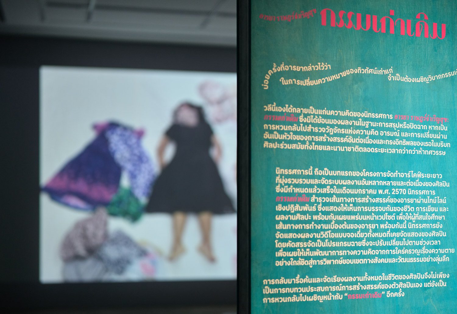 สิ่งที่ว่าด้วยการกระทำเหล่านั้นเองก็ได้ส่งผ่านลงมาเป็นชื่อนิทรรศการ กรรมเก่าเดิม นิทรรศการที่รวบรวมความเป็นไปของชีวิตและความเป็นมาของผลงานใน (ช่วง) ชีวิตที่แล้วแบบนิทรรศการย้อนหลัง (retrospective) ของอารยา ราษฎร์จำเริญสุข อาจารย์ศิลปะและศิลปินผู้รังสรรค์ผืนผ้าใบไปจนถึงปรากฏการณ์ต่อวงการศิลปะร่วมสมัยในประเทศไทยและระดับสากล