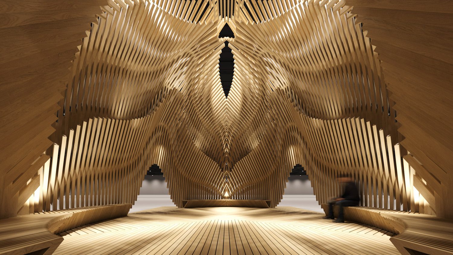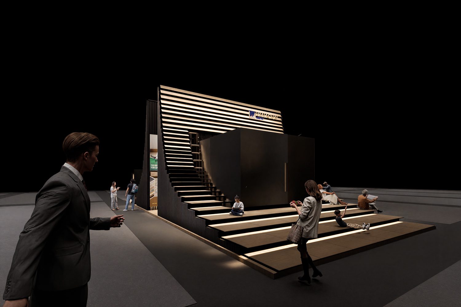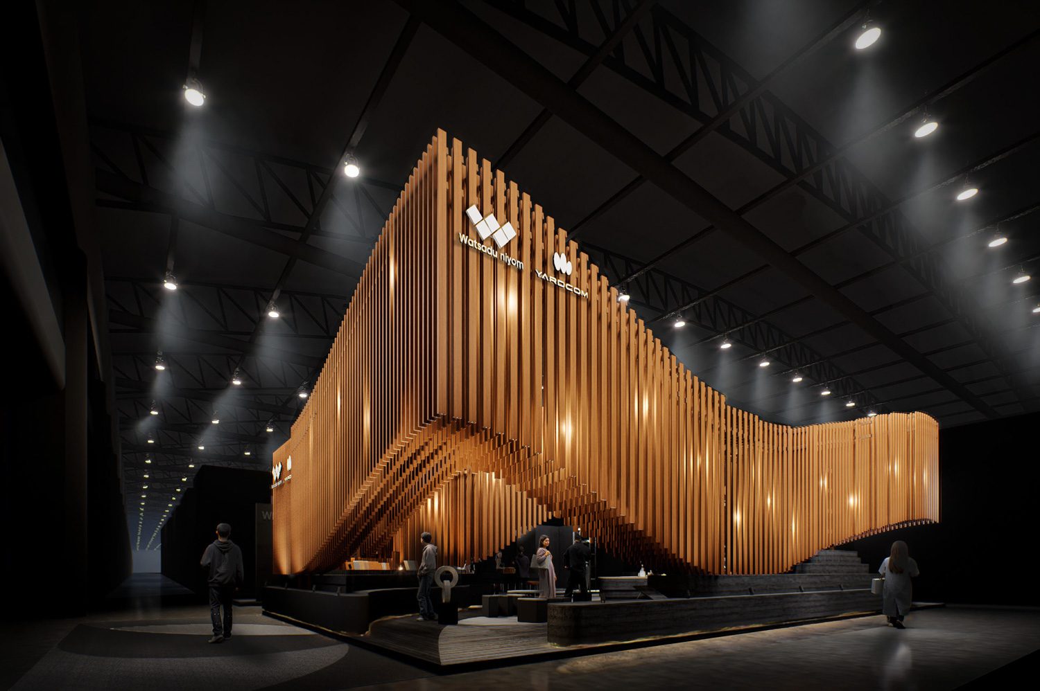 ความชั่วคราว ไม่จำเป็นต้องเท่ากับความสิ้นเปลือง และพาวิลเลียนกลายเป็นจุดจดจำทั้งในเชิงพื้นที่ และความรับผิดชอบที่มีต่อวัสดุเชิงระบบได้ในเวลาเดียวกัน จึงใช้รูปฟอร์มที่พลิ้วไหวของแสงออโรร่าบนท้องฟ้าที่สื่อถึงการเดินทางที่ไม่หยุดนิ่งของแบรนด์ Watsadu niyom จากวัสดุชินตาอย่างระแนงไม้เทียมที่นำมาตีความใหม่ในเชิงศิลปะและการจัดวางในพื้นที่ เปิดมุมมองใหม่ให้กับวัสดุ สื่อสารผ่านความงามของสิ่งแวดล้อมที่ตีความด้วยจิตสำนึกรักษ์โลกของวัสดุตลอดวงรอบการใช้งาน