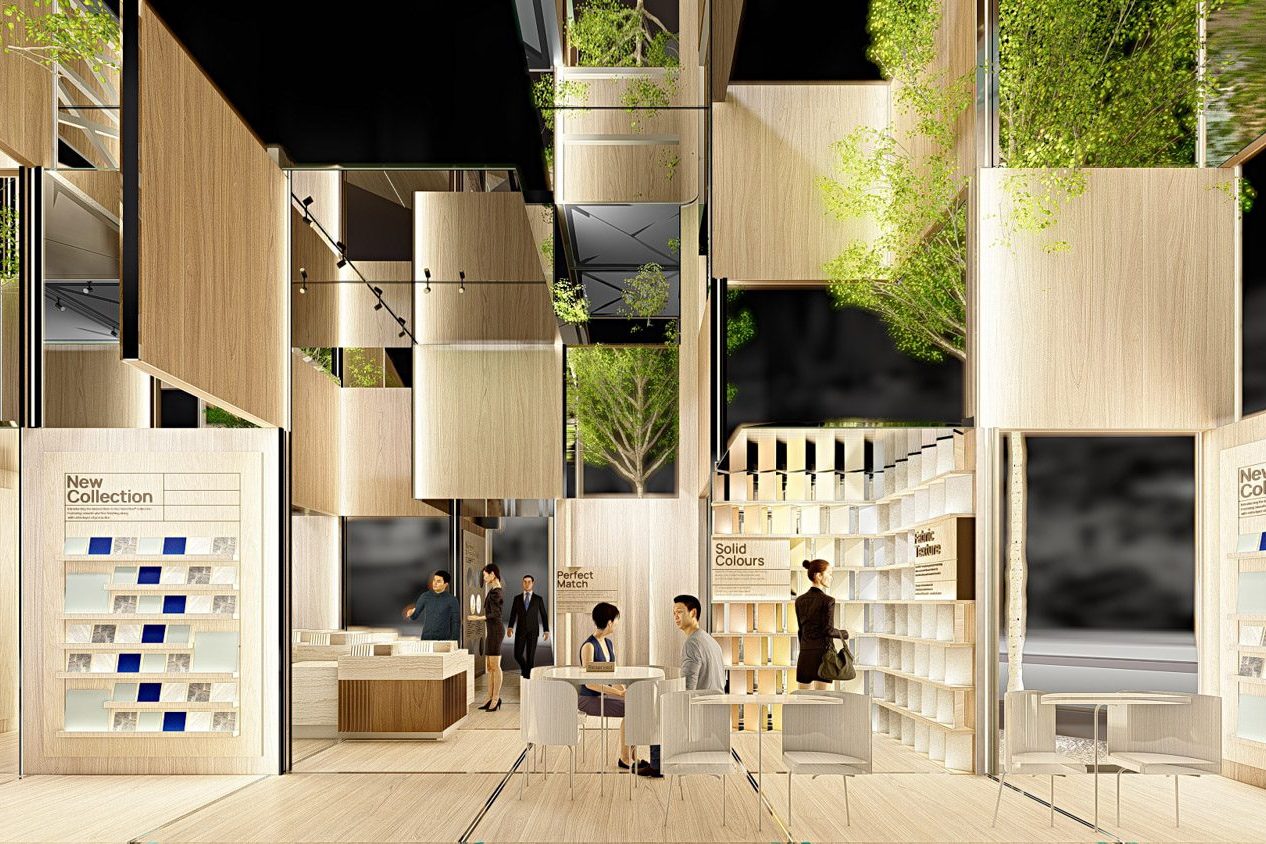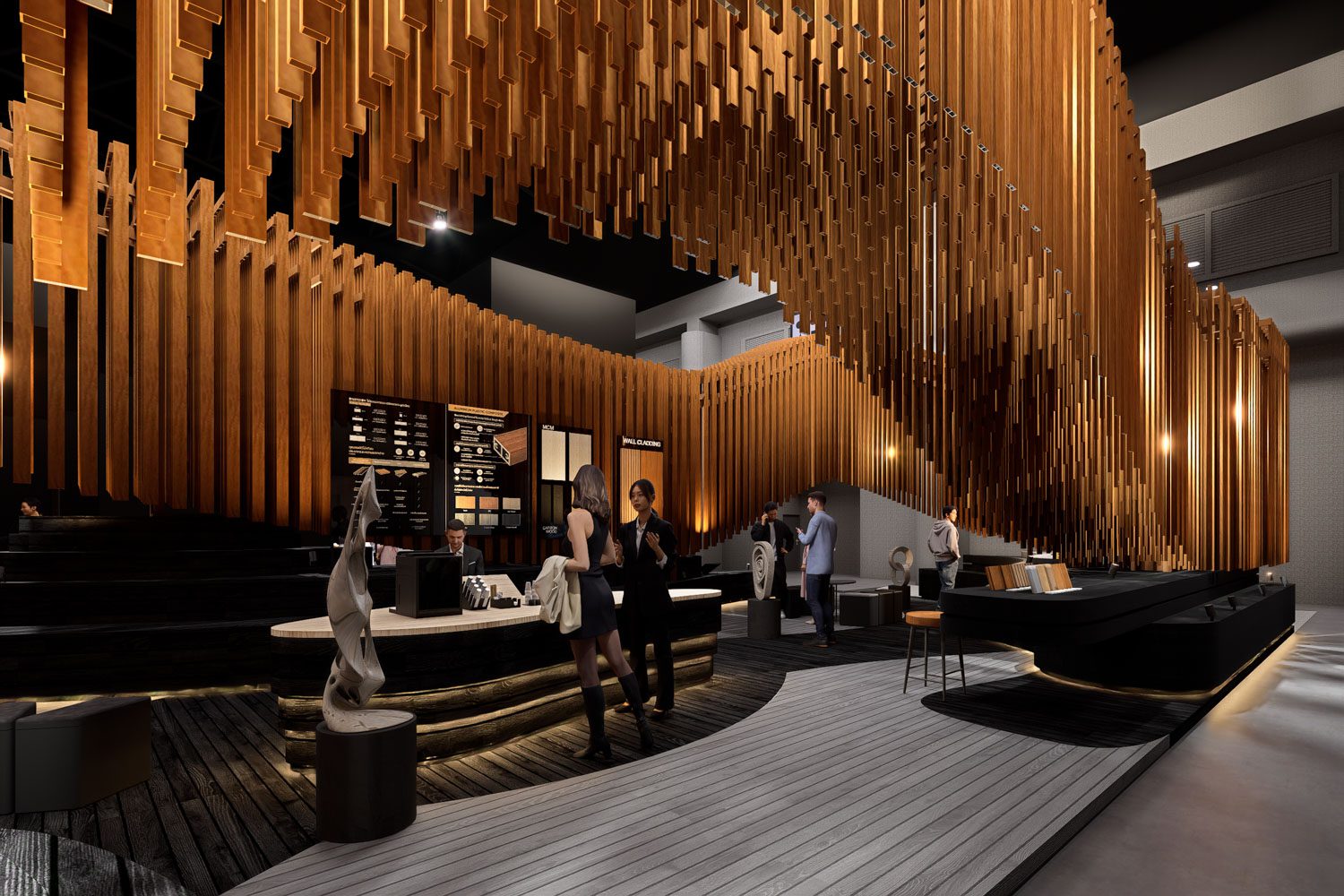ถ่ายทอดประสบการณ์การอยู่ท่ามกลางธรรมชาติ ราวกับรายล้อมด้วยสวนยางที่เรียงตัวอย่างเป็นระเบียบ ผสานความเป็นระบบของกริดในแนวคิดสถาปัตยกรรมเข้ากับความรู้สึกของป่าที่ไร้ขอบเขต โดยแปลงคุณค่าของวัสดุ Panel Plus ที่เป็นแผ่นไม้บอร์ดมาตรฐานด้านความยั่งยืน เข้ามาสร้างประสบการณ์เชิงสถาปัตยกรรม ไปพร้อมกับการแสดงให้เห็นคุณสมบัติของ Perfect Wood และ Perfect Match ที่ลวดลาย สี และขอบวัสดุต่อเนื่องเป็นหนึ่งเดียว