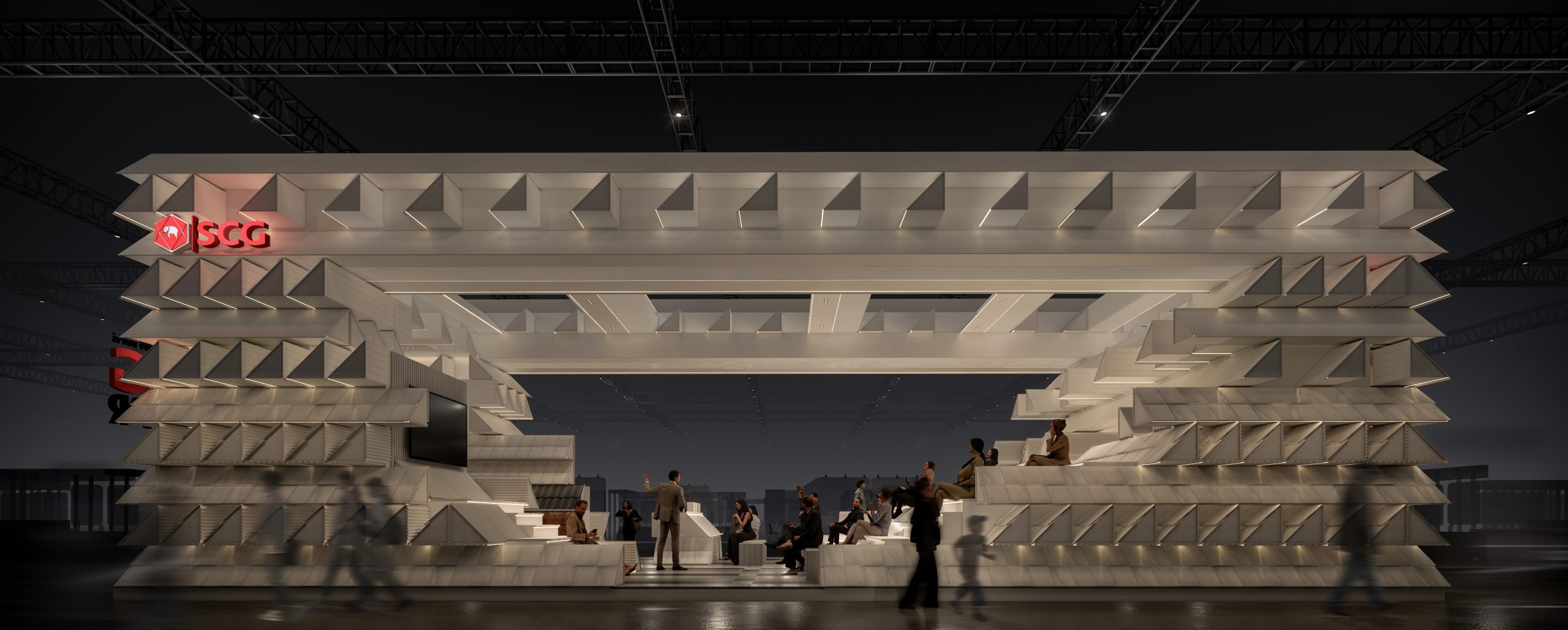 มาพร้อมกับ The Delta Stack Pavilion ซึ่งมาจากการตีความโจทย์ ‘Beyond Materials, Into Life’ โดยเริ่มต้นจากวัสดุเป็นผู้เล่นหลักของงาน พื้นที่ออกแบบในลักษณะถ้ำที่ผู้คนสามารถใช้งานกับอากัปกิริยาของตนเองในการสัมผัสกับวัสดุด้วยทุกส่วนของร่างกาย พร้อมกันกับการทำความเข้าใจวัสดุผ่านโครงสร้างสามเหลี่ยมซ้อนชั้นที่มาจากการจัดวางวัสดุหลักในมุมเอียง 45 องศา ร่วมกับวัสดุ DECAAR ที่ติดตั้งในแนว 90 องศา เพื่อสร้างจังหวะ โครงสร้าง และมิติของพื้นที่