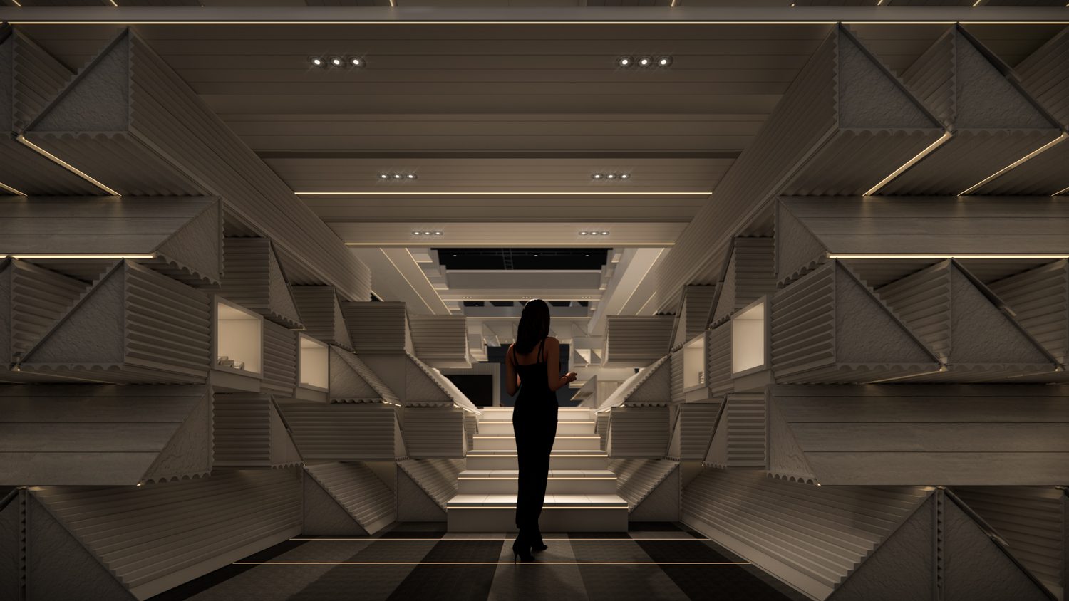 โครงสร้างสามเหลี่ยมที่คลี่ออกคล้ายพัด สร้างสรรค์เป็นเลเยอร์ทับซ้อนหลายชั้นราวกับวัสดุบนชั้นวางที่ถูกดึงออกมาสร้างสรรค์พื้นที่เชิงสถาปัตยกรรม โดยมีช่องว่างระหว่างชั้นทำหน้าที่กรองแสงและสร้างจังหวะของแสงเงาจากผู้คนที่เคลื่อนไหวตลอดเวลา พื้นผิวเกิดจากการนำหน้าตัดของอะลูมิเนียมมาเรียงต่อกันเป็นแพทเทิร์นเพื่อสร้างชีวิตให้กับวัสดุอุตสาหกรรม ร่วมกันกับระบบบานเลื่อนอะลูมิเนียมของ Aluframe ที่เชื่อมโยงงานออกแบบเชิงพื้นที่เข้ากับระบบวิศวกรรมอย่างลงตัว