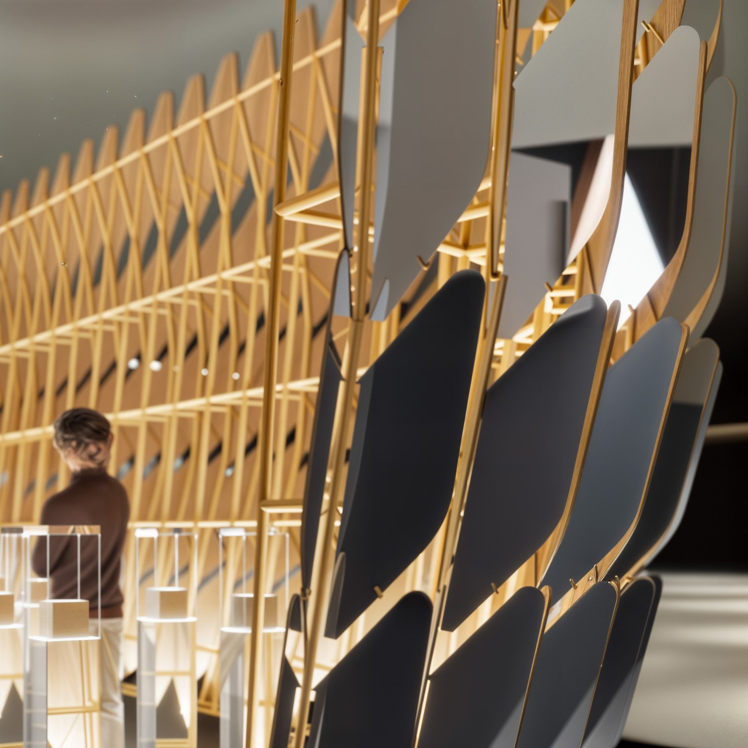 การวางผังในพาวิลเลียนซึ่งมีพื้นที่จำกัดจึงใช้แกนเฉียงกับสเปซที่ซับซ้อนเพื่อเพิ่มพื้นผิวของวัสดุและฟังก์ชันการใช้งาน พร้อมปลดล็อคศักยภาพของวัสดุให้เห็นว่า ผลิตภัณฑ์ไม้บอร์ดก็สามารถเป็นตัวตั้งต้นในการสร้างสรรค์ได้มากกว่าเดิมเช่นกัน ผ่านการผสมผสานพื้นผิวของวัสดุลายไม้และสี สลับกับแผ่นอะลูมิเนียมกระจก เพื่อสร้างเอฟเฟกต์ด้านการสะท้อนและความลึกของพื้นที่ และการออกแบบแสงที่ช่วยเน้นรายละเอียดของวัสดุด้วยประสาทสัมผัสของผู้ชมเอง