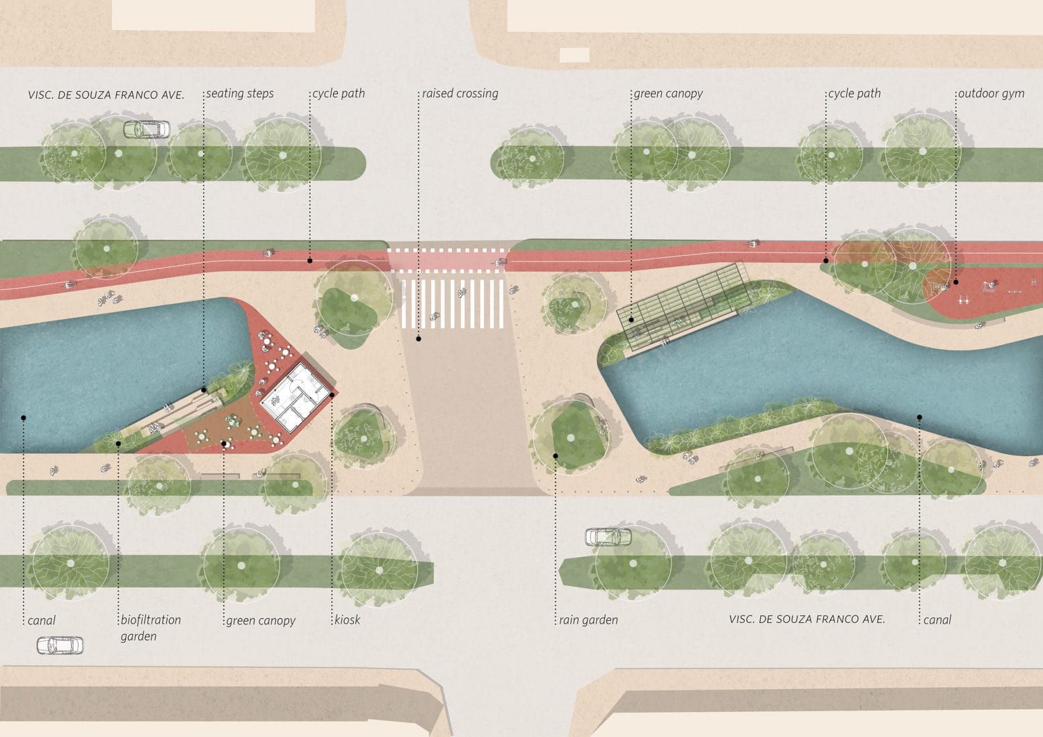 เช่นเดียวกับบริบทของเกาะกลางถนนวิสคอนเด เด ซูซา ฟรังโก เนื่องจากพื้นที่ธรรมชาติดั้งเดิมของสายน้ำหายไปตามการเติบโตของเมือง รถยนต์ และรถมอเตอร์ไซค์จำนวนมากของเมือง ตลอดจนสิ่งแวดล้อมที่แย่ลง ส่งผลให้พื้นที่สาธารณะของเมืองน้อยลงตามไป สถาปนิก Natureza Urbana จึงเลือกที่จะฟื้นฟูสายน้ำแหล่งนี้ให้กลับมาอีกครั้งเป็นพื้นที่นั่งเล่นใหม่ของเมือง โดยได้ความร่วมมือจากชุมชน โรงเรียน และกลุ่มผู้มีส่วนเกี่ยวข้อง เพื่อร่วมกันออกแบบพื้นที่ สร้างโปรแกรมให้เหมาะสมกับความต้องการ เพราะพื้นที่นี้จะครอบคลุมการใช้งานของผู้คนได้มากถึง 500,000 คน
