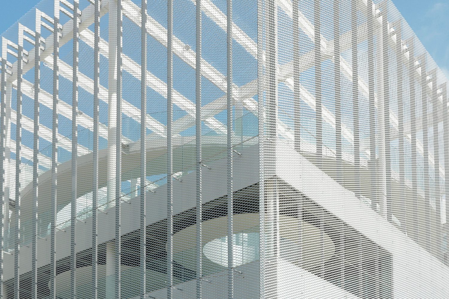 งานออกแบบภายนอกของตัวอาคาร SANAA ได้ออกแบบโครงสร้างภายนอกของตัวอาคารแบบเปลือกสองชั้น (double-layered envelope) โดยด้านนอกเลือกใช้เหล็กฉีกและใช้ผนังกระจก curtain wall ด้านในทำหน้าที่ให้ทั้งการป้องกันความร้อนและเปิดรับแสงธรรมชาติอย่างมีประสิทธิภาพ ขณะที่ชั้นโลหะด้านนอกอาศัยคุณสมบัติของวัสดุที่มีลักษณะโปร่งและมีช่องว่าง ช่วยลดความรู้สึกทึบ และทำให้อาคารดูเบา ละมุน และอ่อนตัวทางสายตามากยิ่งขึ้น