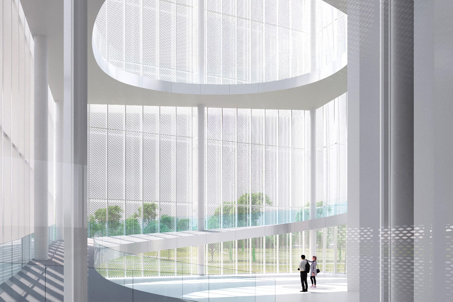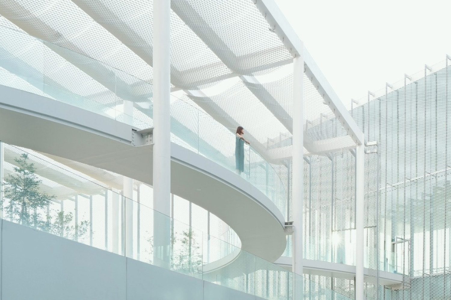 ห้องสมุดและพิพิธภัณฑ์ศิลปะไม่ได้แยกขาดจากกัน หากแต่เชื่อมโยงโดยสะพานทางเดินที่เชื่อมต่อระหว่างตึกและแต่ละชั้นเข้าไว้ด้วยกัน ยิ่งไปกว่านั้น พื้นที่กึ่งกลางแจ้งบนดาดฟ้าอย่าง ‘Cultural Forest’ ซึ่งใช้สะพานลอยรูปวงแหวนเชื่อมพิพิธภัณฑ์ศิลปะและห้องสมุด ภายนอกอาคารยังเลือกใช้ expanded metal แบบเดียวกับผนังภายนอกของอาคาร ทำให้ดูราวกับผ้าม่านที่ทอดตัวลงมาอย่างบางเบา เส้นทางแบบวงกลมนี้ไม่ได้กำหนดเส้นทางที่ตายตัว จึงทำให้ผู้มาเยือนสามารถเดินผ่านระหว่าง ศิลปะและการอ่านได้อย่างอิสระ