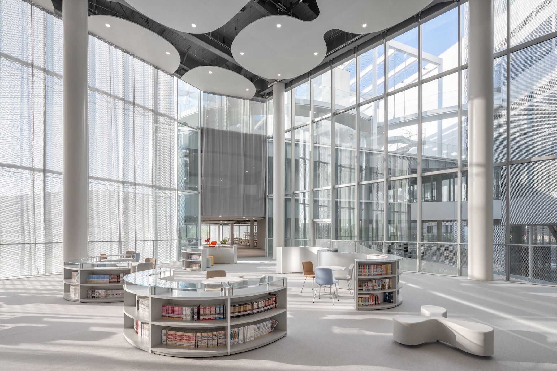 ในขณะที่ฝั่งห้องสมุดเลือกใช้แนวคิด ‘Fluidity’ เป็นหัวใจของการออกแบบ โดยโซนการอ่านถูกจัดวางแบบแบ่งตามช่วงวัย ภายในประกอบด้วย โถงห้องสมุดสูง 7 เมตร ที่เปิดโปร่งและมีเฟอร์นิเจอร์ทรงโค้งทำหน้าที่ราวกับกระแสน้ำที่คอยนำทาง และทำให้นักอ่านสามารถเดิน หยิบหนังสือ หรือหยุดนั่งอ่านได้อย่างเป็นธรรมชาติ