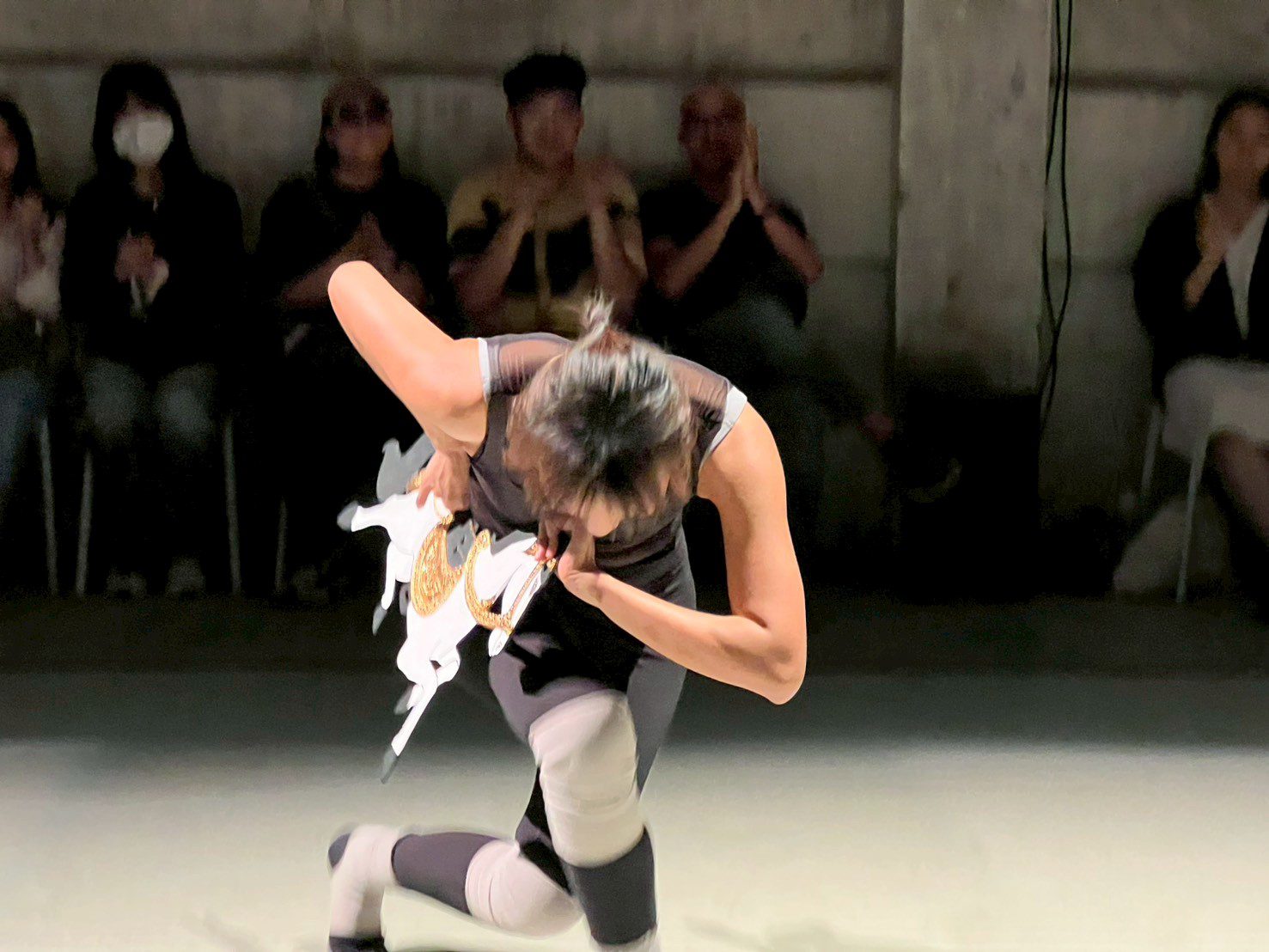 กรกาญจน์ หยิบเอาเรื่องราวการแสดงนี้มาจากบทสนทนาระหว่างเธอกับพ่อที่รายล้อมด้วยครอบครัวศิลปิน ‘นาฏดนตรี’ (ก็ลิเกนั่นแหละ) กรกาญจน์ได้นำจังหวะการวิ่ง กระโจน กระโดดเหยาะๆ ของม้าในการแสดงพลายชุมพลออกม้ามาค้นหาและพยายามซ้อนทับกับการขี่ม้าอย่างจริงๆ ที่มีขั้นตอน มีการทำให้เชื่อง มีการสู้กับการพยศของม้า มีการตอบแทนความเชื่อง เช่น การออกปากชมว่า ‘good girl!’, การเดาะปากเพื่อเรียกความสนใจจากม้า ซึ่งระหว่างการแสดงเราจะเริ่มรับรู้ว่าการฝึกม้า (Horse Training) กับการฝึกตัวเองให้กลายเป็นม้า (Training to Become Horse) เริ่มจะมีจังหวะบางอย่างที่ผสมผสานและเนียนเข้ากับข้อและมือที่บิดไปมา เท้าที่กระโดดหรือเดินอย่างเหยาะๆ เสียงของดนตรีไทยและเสียง ‘จิ๊ๆ’ จากการเดาะปาก กลายเป็นจังหวะที่ค่อนข้างจะลงตัว และกลายเป็นระบบระเบียบบางอย่างที่ทำให้คน-ผู้แสดงเป็นพลายชุมพล ได้กลายเป็นม้าไปอีกชั้นหนึ่ง
