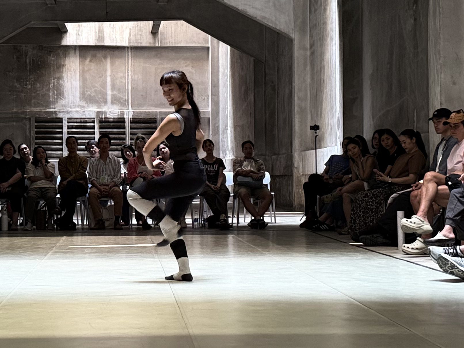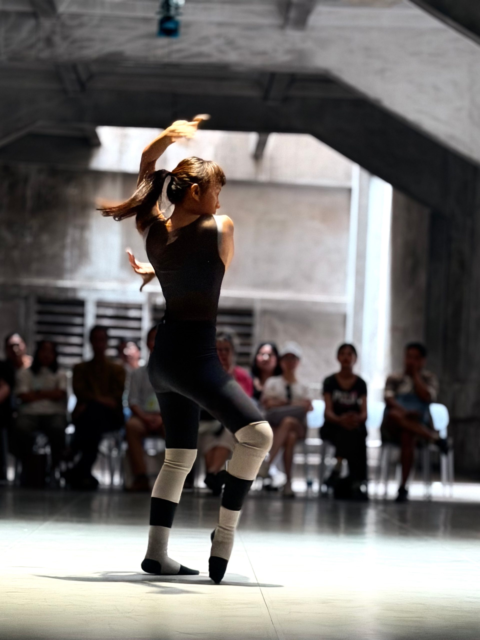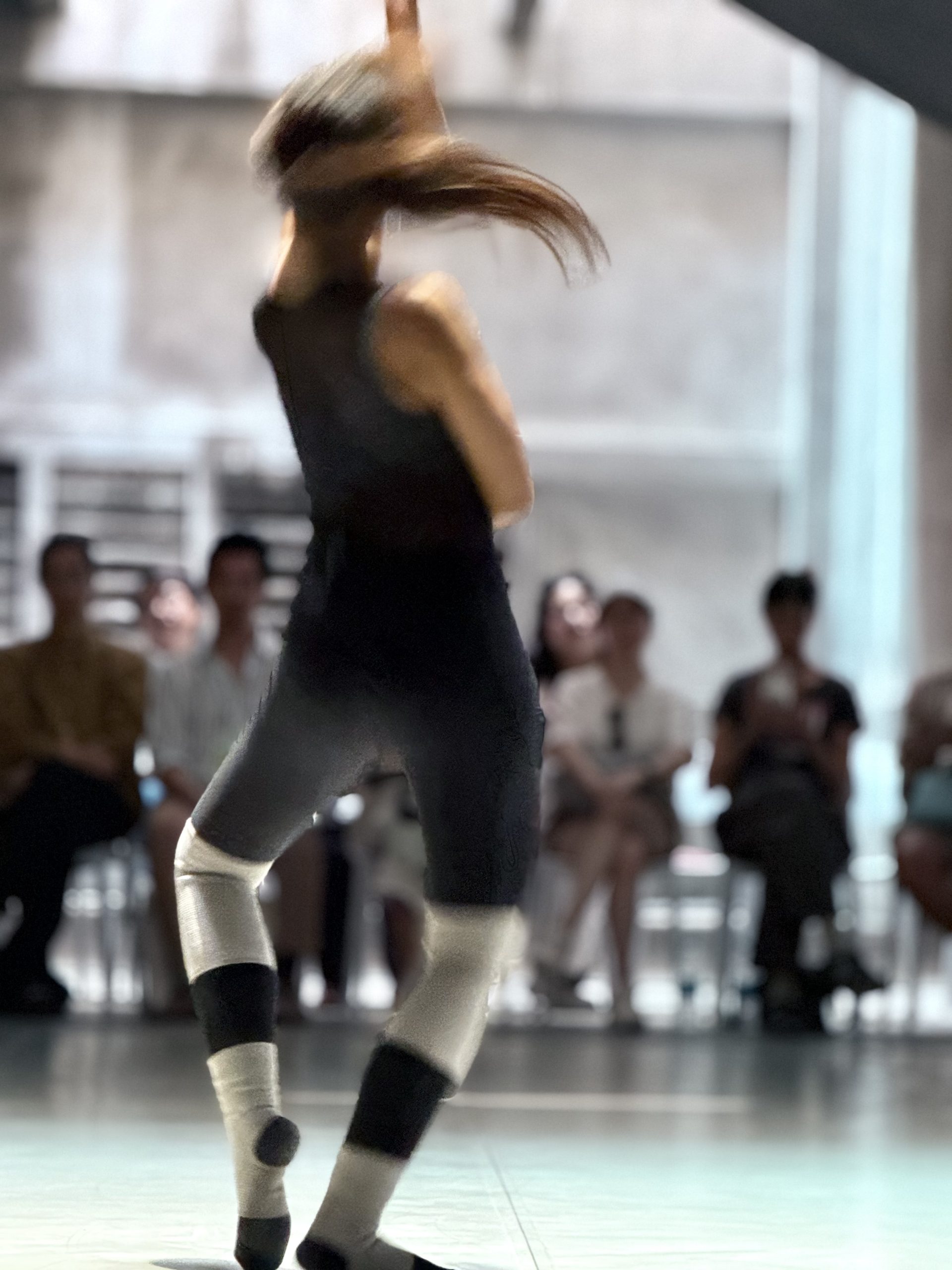เมื่อจบการแสดงของพิเชษฐ ก็มีเวลาเล็กน้อยในการขยับร่างและเคลื่อนกายไปยังห้อง C2 ที่มีขนาดยาวมากๆ ให้กลายเป็นพื้นที่เวทีแบบลานโล่งตรงกลาง และมีเก้าอี้หลายสิบตัวรายล้อมลานนั้นไว้ ซึ่งก็เข้าเค้ากับชื่อการแสดง Riding the Rhythm, a Work in Progress ของกรกาญจน์ รุ่งสว่าง ที่พยายามค้นหาจังหวะของการแสดงเป็นม้าของเธอเอง เพราะลานนั้นดูคลับคล้ายคลับคลากับลู่วิ่งม้าตามสนามม้าอย่างไรอย่างนั้น