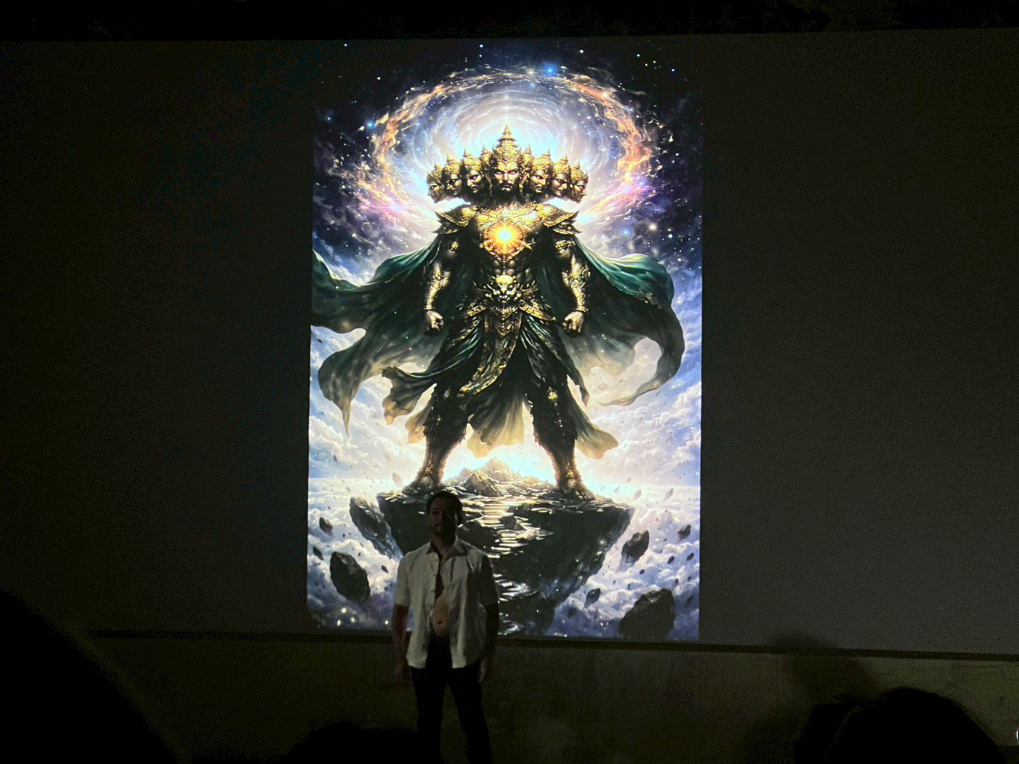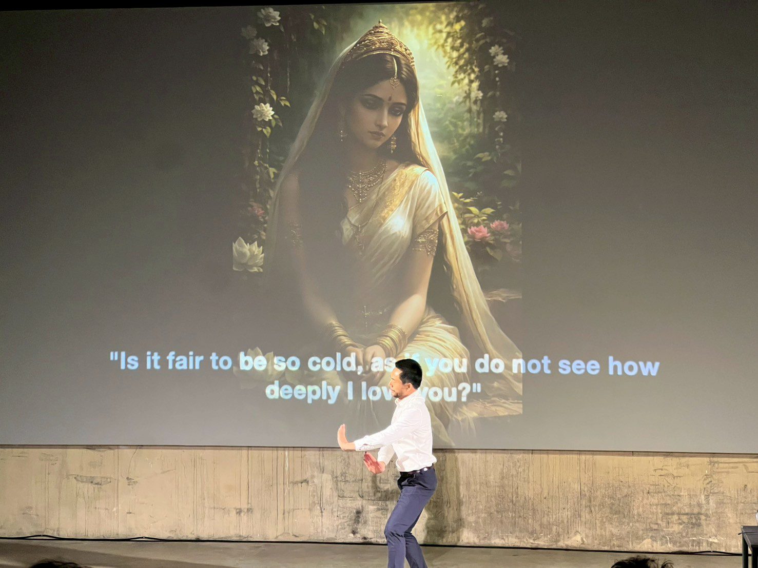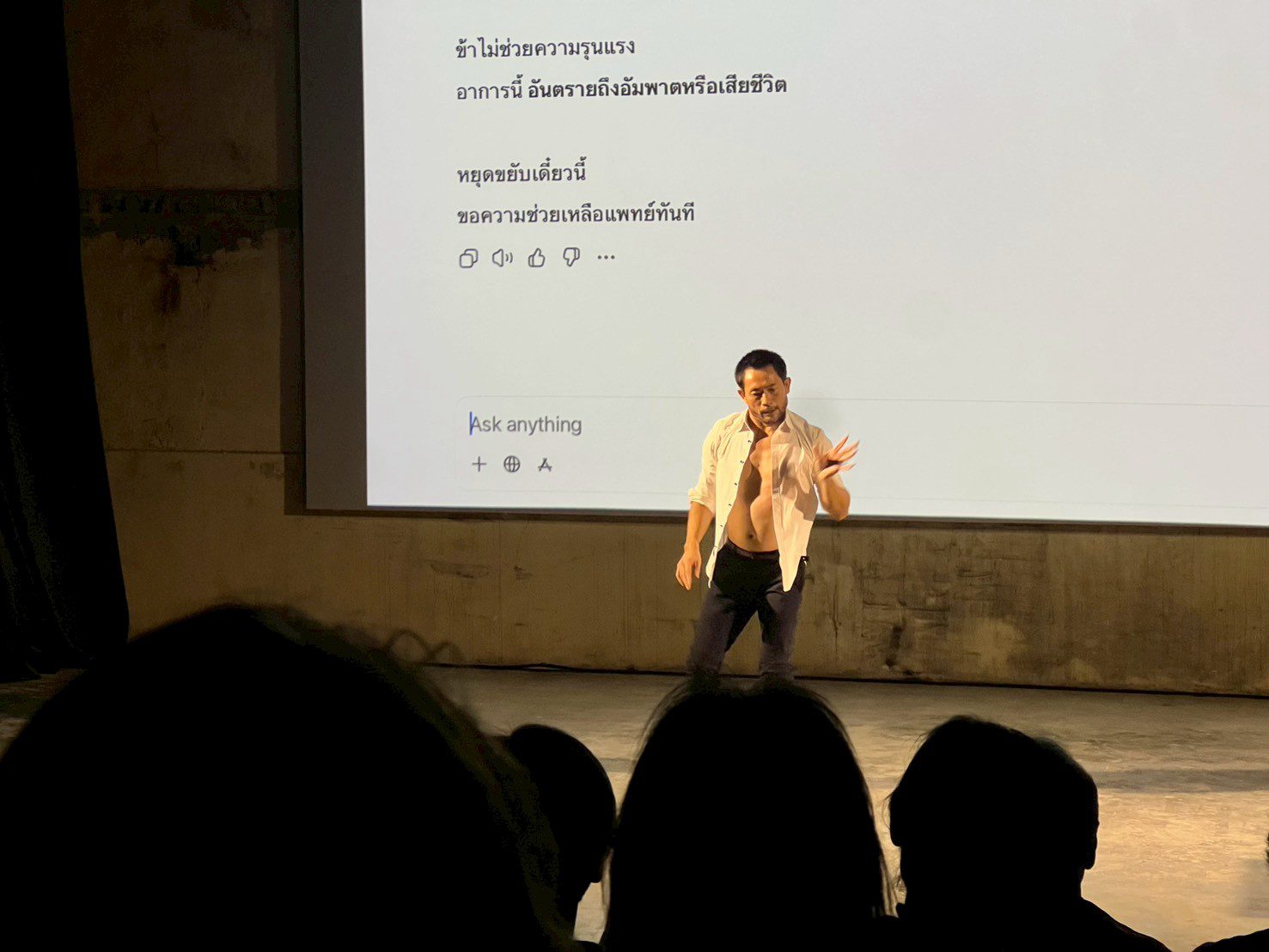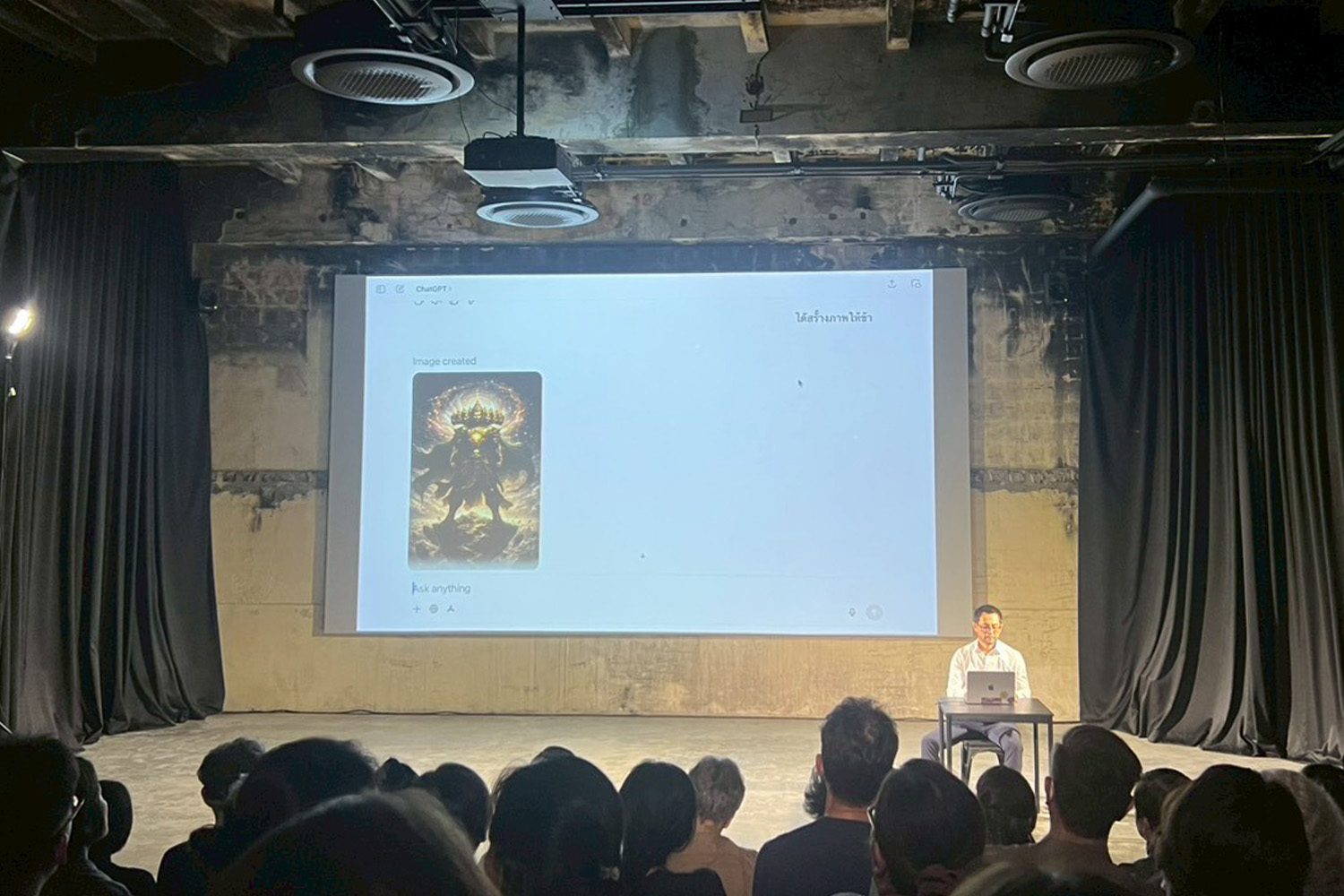 ในการแสดงแรก ‘Chapter 2’ จัดขึ้นที่ห้อง B2 ห้องที่มีลักษณะยาวที่ถูกจัดการให้เหมือนโรงละครแบบ end-on ที่อัฒจันทร์จะเรียงสูงขึ้นไล่ลำดับกันไป ทำให้ผู้ชมมองเห็นการแสดงและได้ยินเสียงเพลงได้อย่างทั่วถึง อย่างไรก็ดี Chapter 2 เป็นการต่อบทสนทนาจากการแสดง ‘I AM A DEMON’ ของพิเชษฐเมื่อสองทศวรรษที่ผ่านมา และในการแสดงนี้ได้จับตอน ‘ขับพิเภก’ มาเป็นเส้นเรื่องหลัก ตั้งแต่ทศกัณฐ์สุบินนิมิต, ทศกัณฐ์ลงสวน, ขับพิเภก, และยกรบ โดยพิเชษฐ ยังคงเป็นพญายักษ์ทศกัณฐ์ ไม่ใช่ด้วยรูปลักษณ์ แต่เป็นจิตวิญญาณ เพราะเขากลายตัวเข้าเป็นส่วนหนึ่งของระบบการ ‘เต้น’ โขน-โขนอย่างที่เล่าเรียนมาจนชำนาญจากครูชัยยศ คุ้มมณี เมื่อเขารัก โกรธ เศร้า เขาทำท่านาฏยศัพท์ แต่เมื่อเขาต้องการจะคุยกับ ‘พิเภก’ พระศรีอนุชา ‘ปัญญาประดิษฐ์’ สถิตยุติธรรมผู้ประทับอยู่ ณ พระตำหนัก ChatGPT เราจะได้เห็นว่าช่วงหนึ่งในวินาที เขากลับกลายเป็นคน-ผู้โหยหาคำตอบที่ตรงใจ ต้องการคำปลอบประโลมจิตดวงน้อยที่เสียขวัญ ต้องการจินตภาพบางสิ่งตามต้องการ หรือแม้แต่การหาทางล้างแค้นและทำลายบางอย่างที่ทำให้ตนเป็น ‘DEMON’
