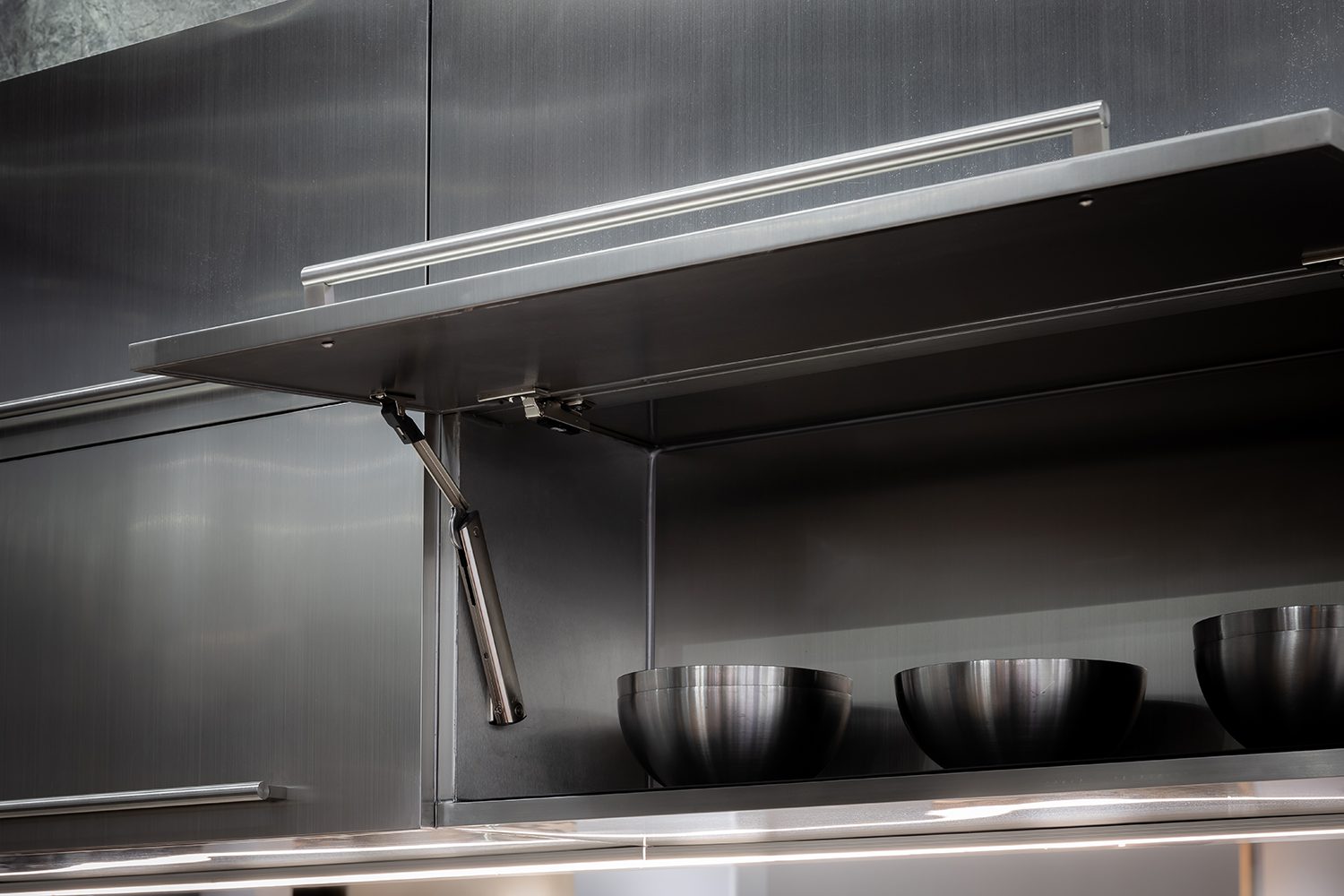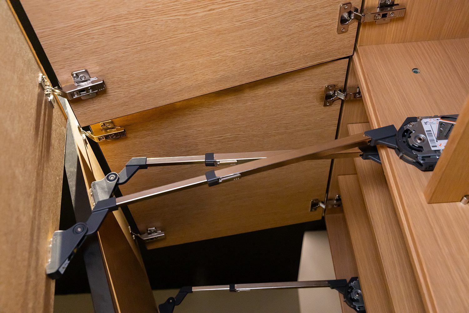 The system divides the cabinet front into two folding sections, making it easier to reach upper storage spaces. Designers are given full flexibility to specify materials and proportions for the cabinet fronts, with the option to integrate SERVO-DRIVE, Blum’s electric opening and closing mechanism. When paired with the brand’s signature soft-close function, even the highest wall cabinets become smooth and accessible—no longer relegated to forgotten storage.