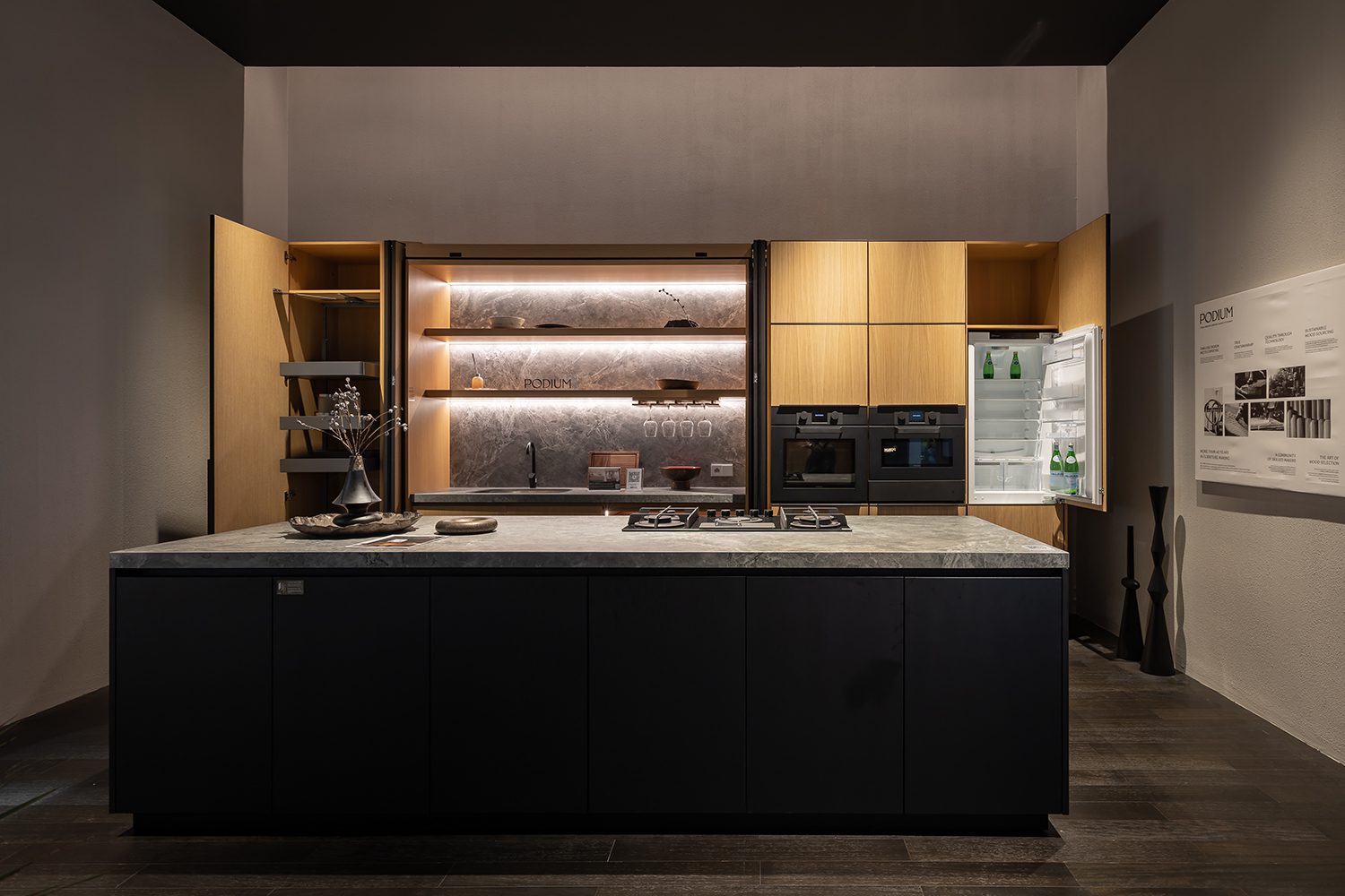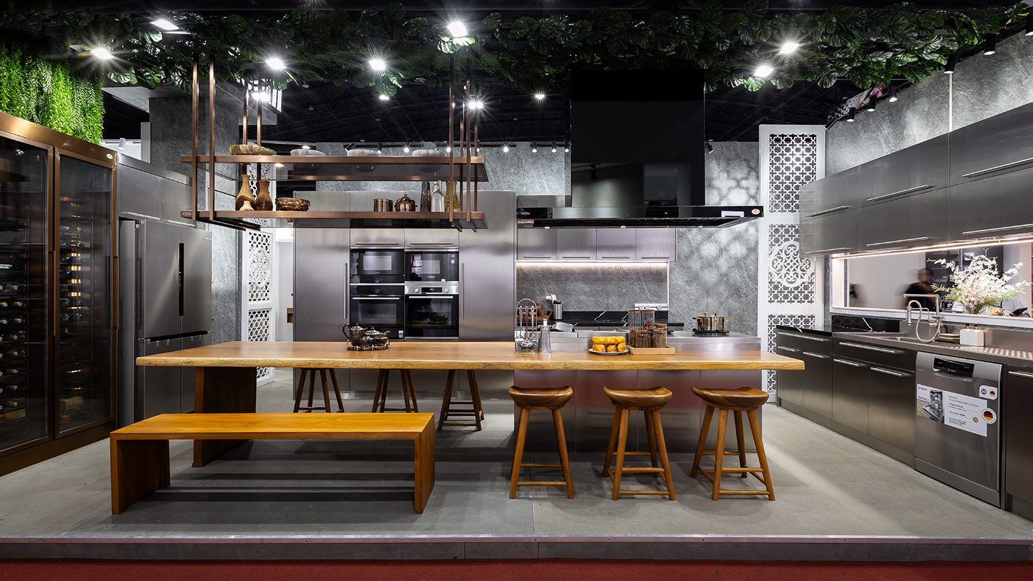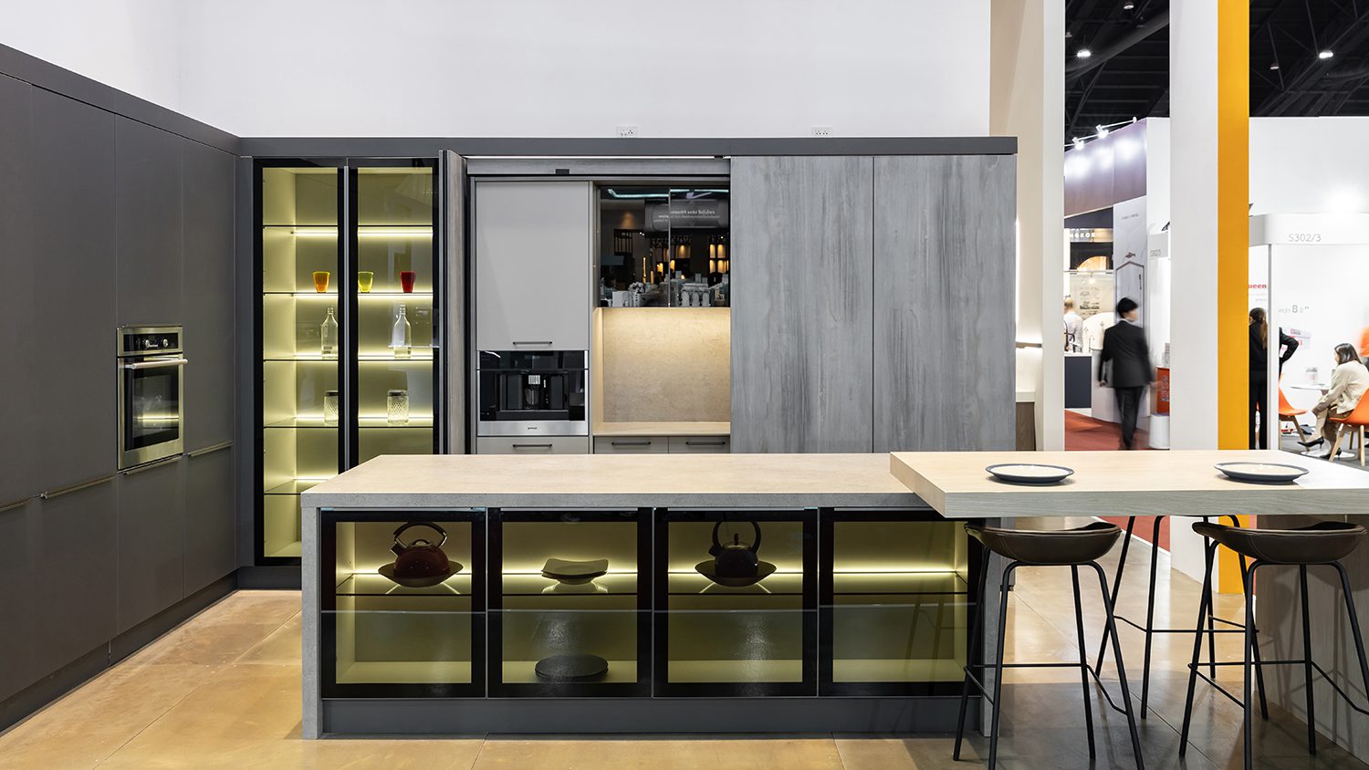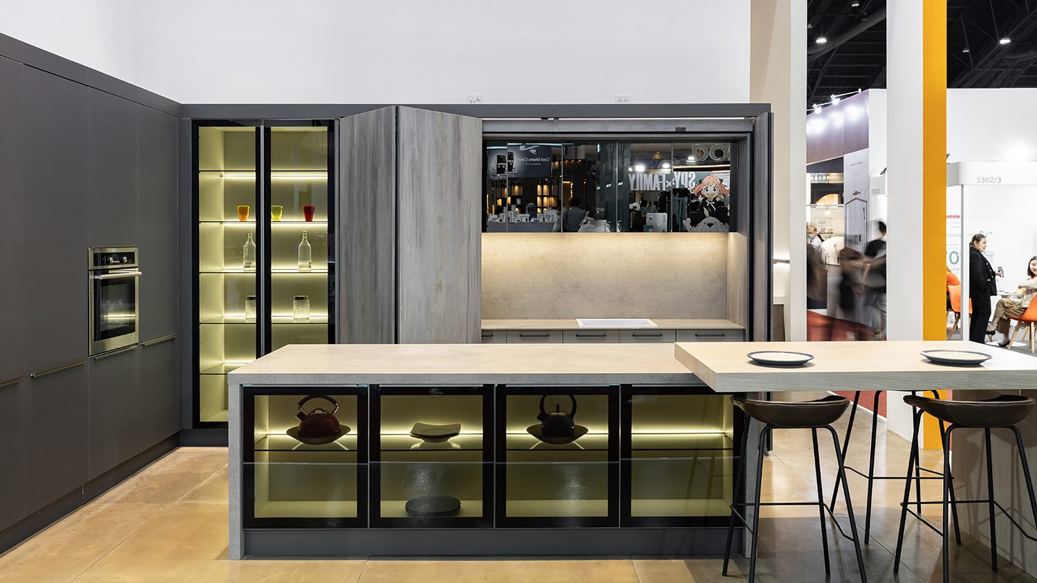 Other featured components included the REVEGO duo+duo pocket door system, the TANDEM drawer runner system, and the 71B9550 hinge model, all discreetly integrated throughout the booth as key elements in a variety of cabinetry. From top-hinged wardrobe doors to the bottom-most drawers of kitchen counters, Blum’s hardware was present throughout, quietly enhancing functionality at every level.