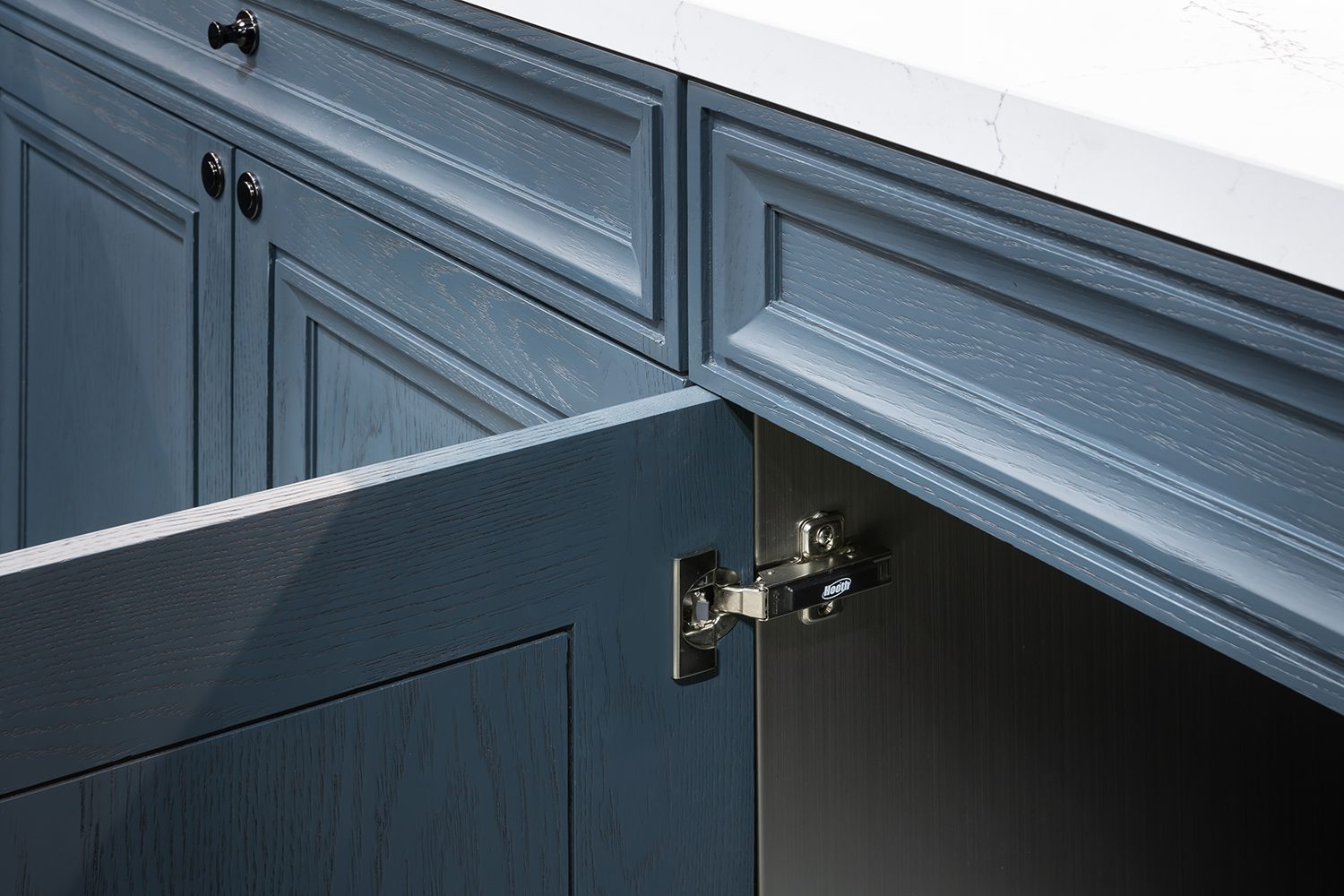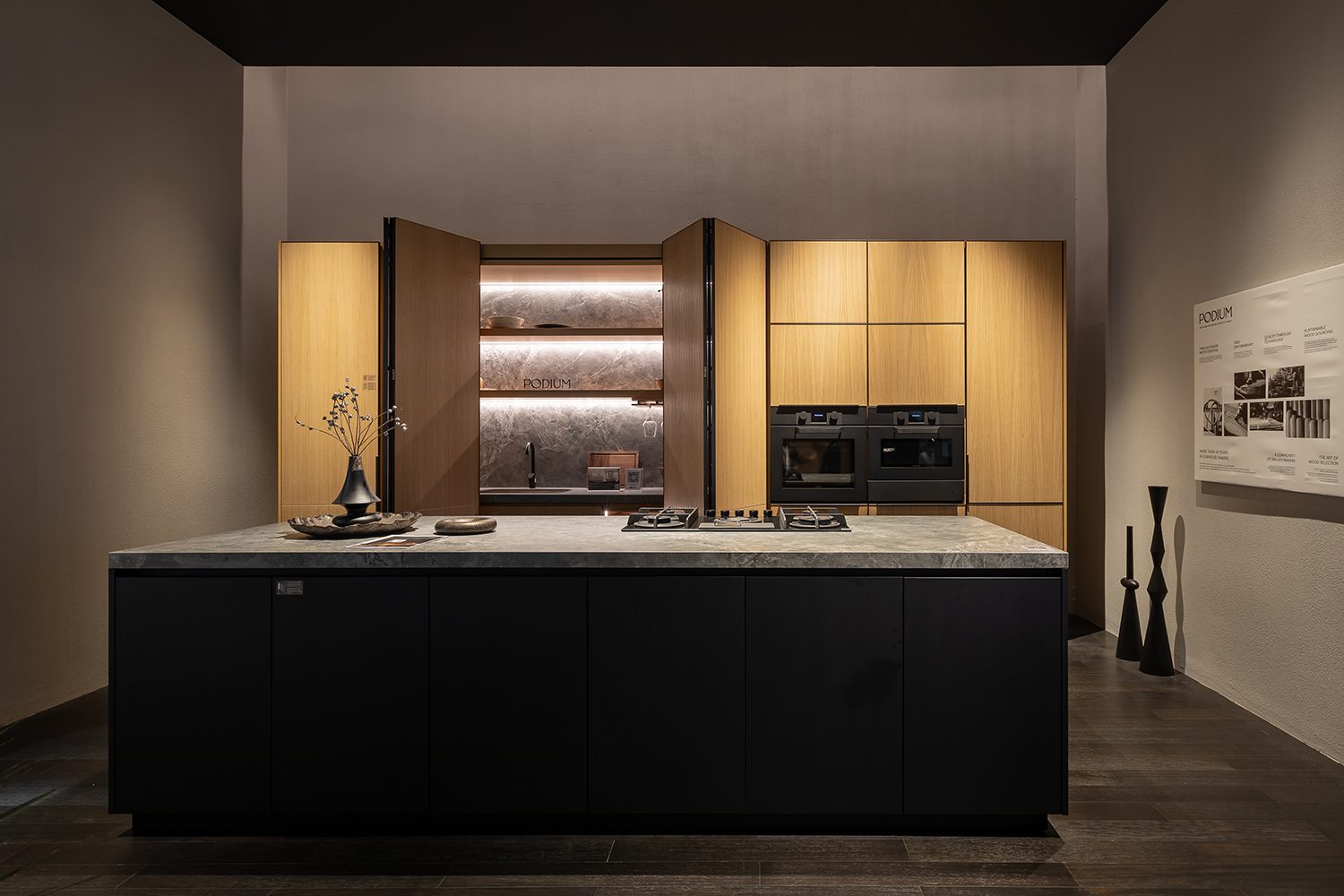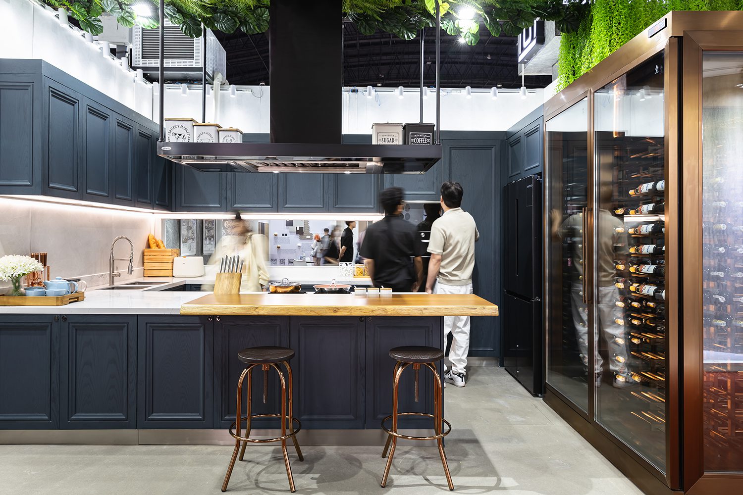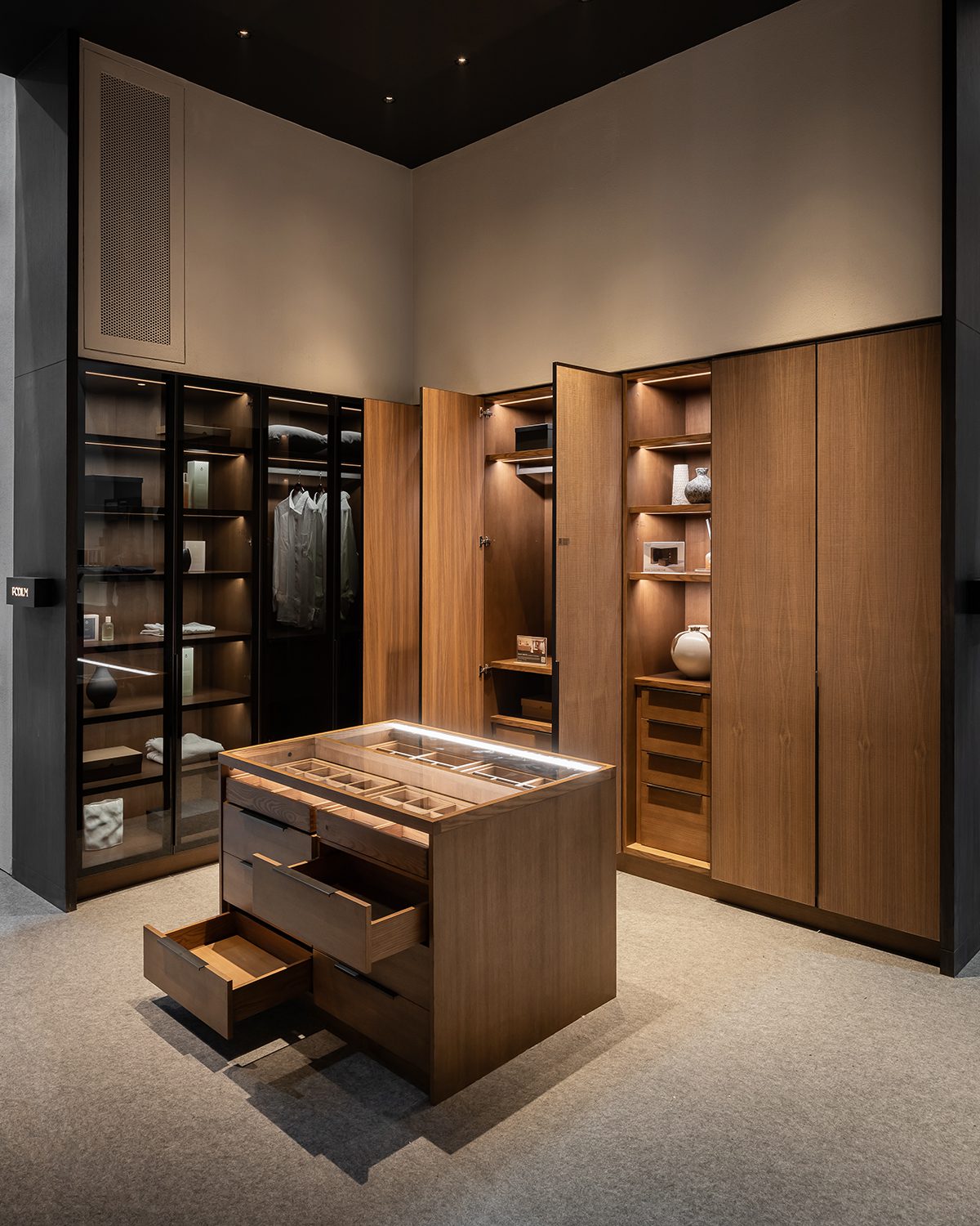 Other featured components included the REVEGO duo+duo pocket door system, the TANDEM drawer runner system, and the 71B9550 hinge model, all discreetly integrated throughout the booth as key elements in a variety of cabinetry. From top-hinged wardrobe doors to the bottom-most drawers of kitchen counters, Blum’s hardware was present throughout, quietly enhancing functionality at every level.