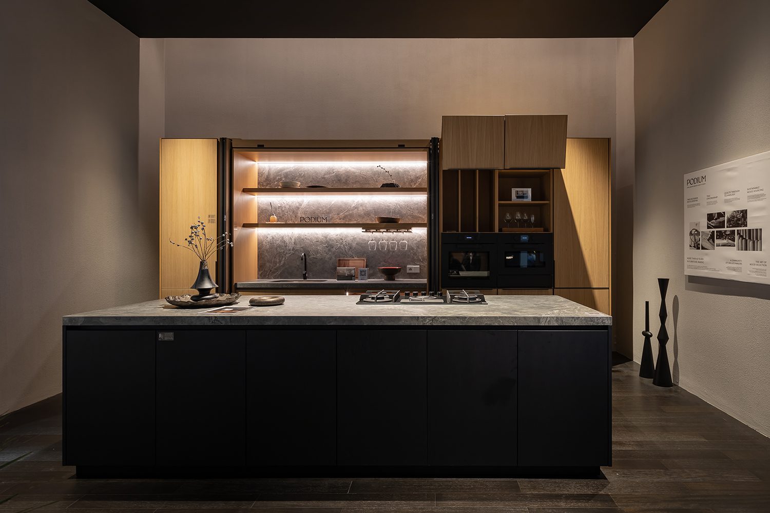 Blum’s product offerings include cabinet hinge systems, lift systems, box systems (drawer components), and runner systems. At the Podium booth, featuring both a kitchen zone and a wardrobe display, Blum took the opportunity to showcase its AVENTOS HF, a bi-fold lift system designed specifically for tall or high-mounted wall cabinets.