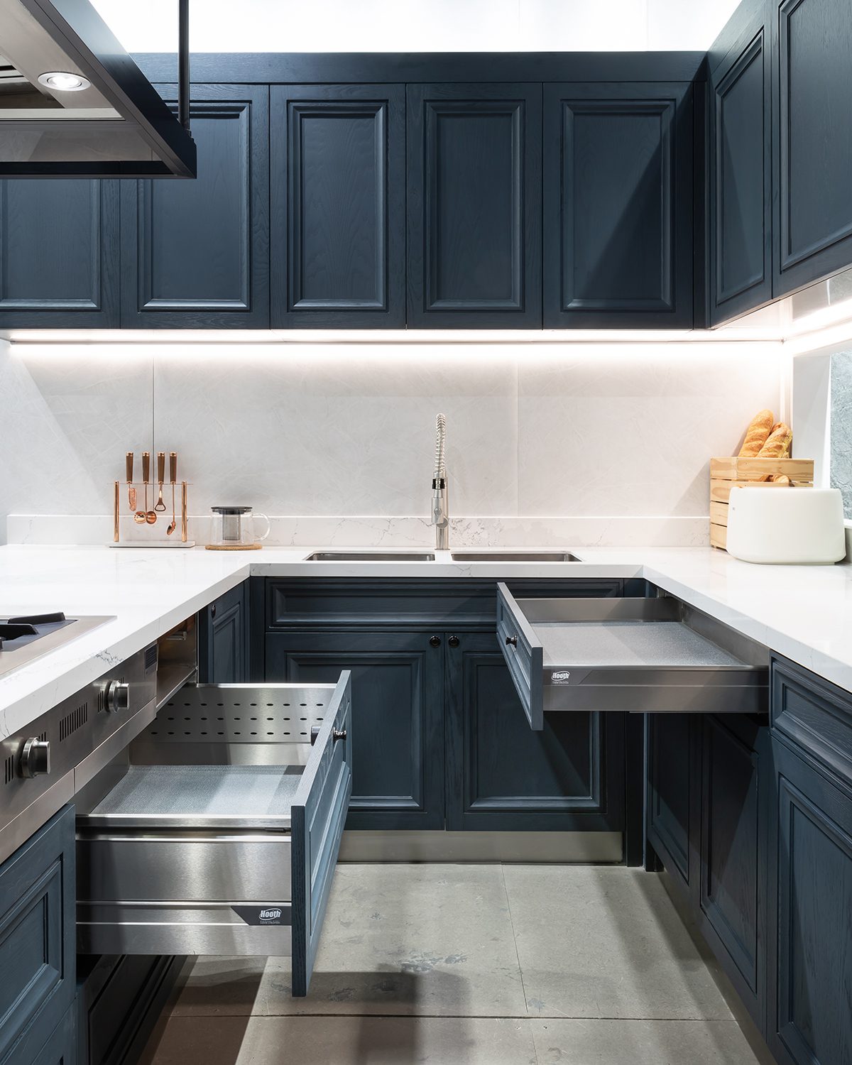 In the kitchen zone, the Hooth booth presented innovations tailored for residential kitchens, featuring high-grade stainless steel as the primary material. Here, Blum’s CLIP top BLUMOTION 107° hinges were selected for their ease of installation, with the CLIP mechanism allowing tool-free door attachment and 3D adjustment enabling precise alignment. The sleek nickel-plated finish paired seamlessly with stainless steel surfaces. Also on display was the AVENTOS HK-xs, a compact stay lift system designed for smaller overhead cabinets, offering an alternative to the bi-fold AVENTOS HF showcased earlier.