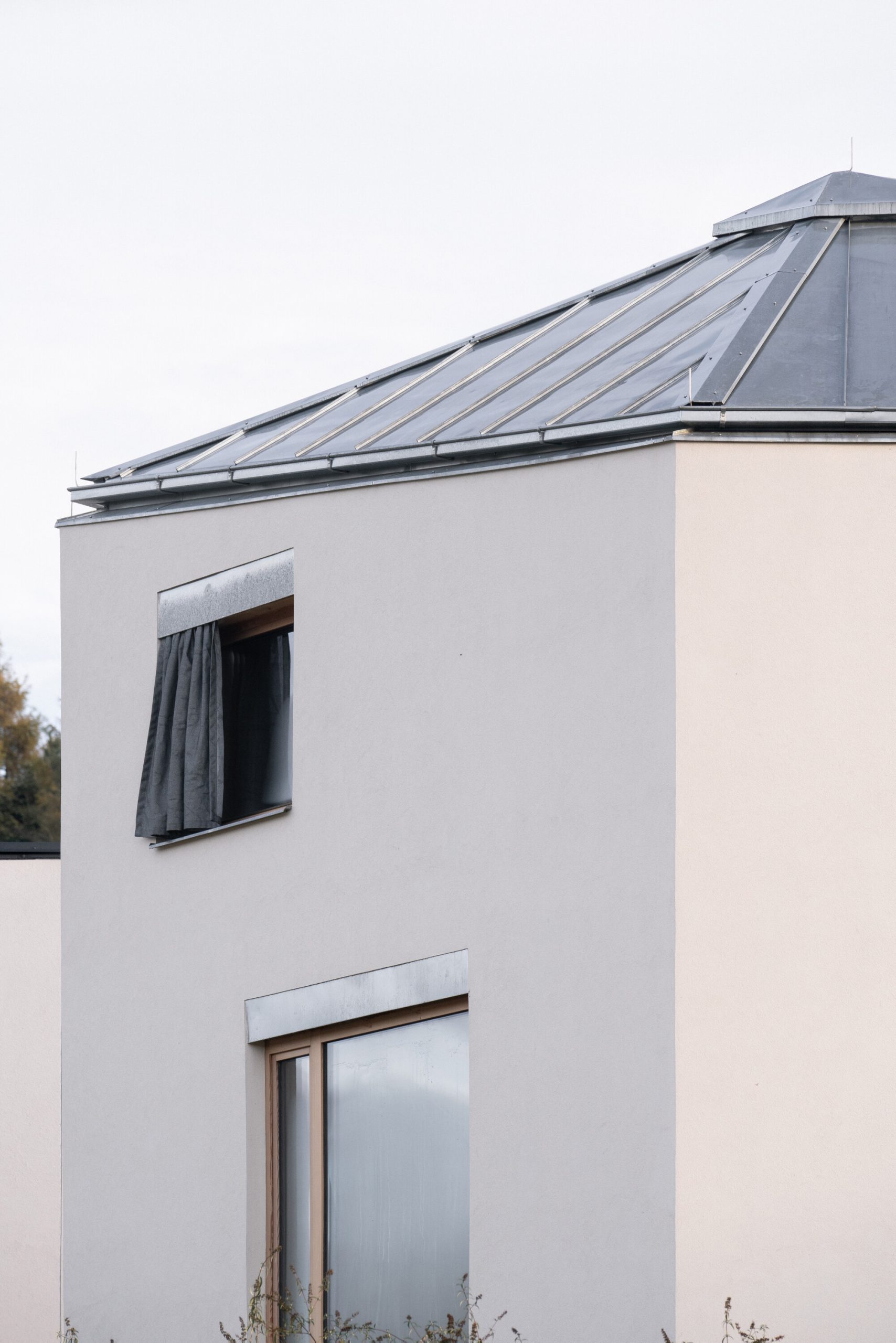 Another key aspect of the design lies in its spatial experience, specifically, the intention to create a dynamic relationship between interior perspectives and the surrounding landscape. The building adopts an asymmetrical pentagonal plan, shaped in response to the site’s topography and the orientation of views in each direction. This configuration allows interior spaces to open outward toward clusters of tall, slender pine trees growing around the property. As the split-level floors rotate incrementally around the pentagonal geometry, each space is afforded a distinct visual perspective, whether inward toward other parts of the house, outward toward the surrounding landscape, or downward into the garden. These views are framed by strategically positioned openings that vary in size, proportion, and placement, carefully calibrated to correspond with each room’s function, the quality of light, and the surrounding environment.