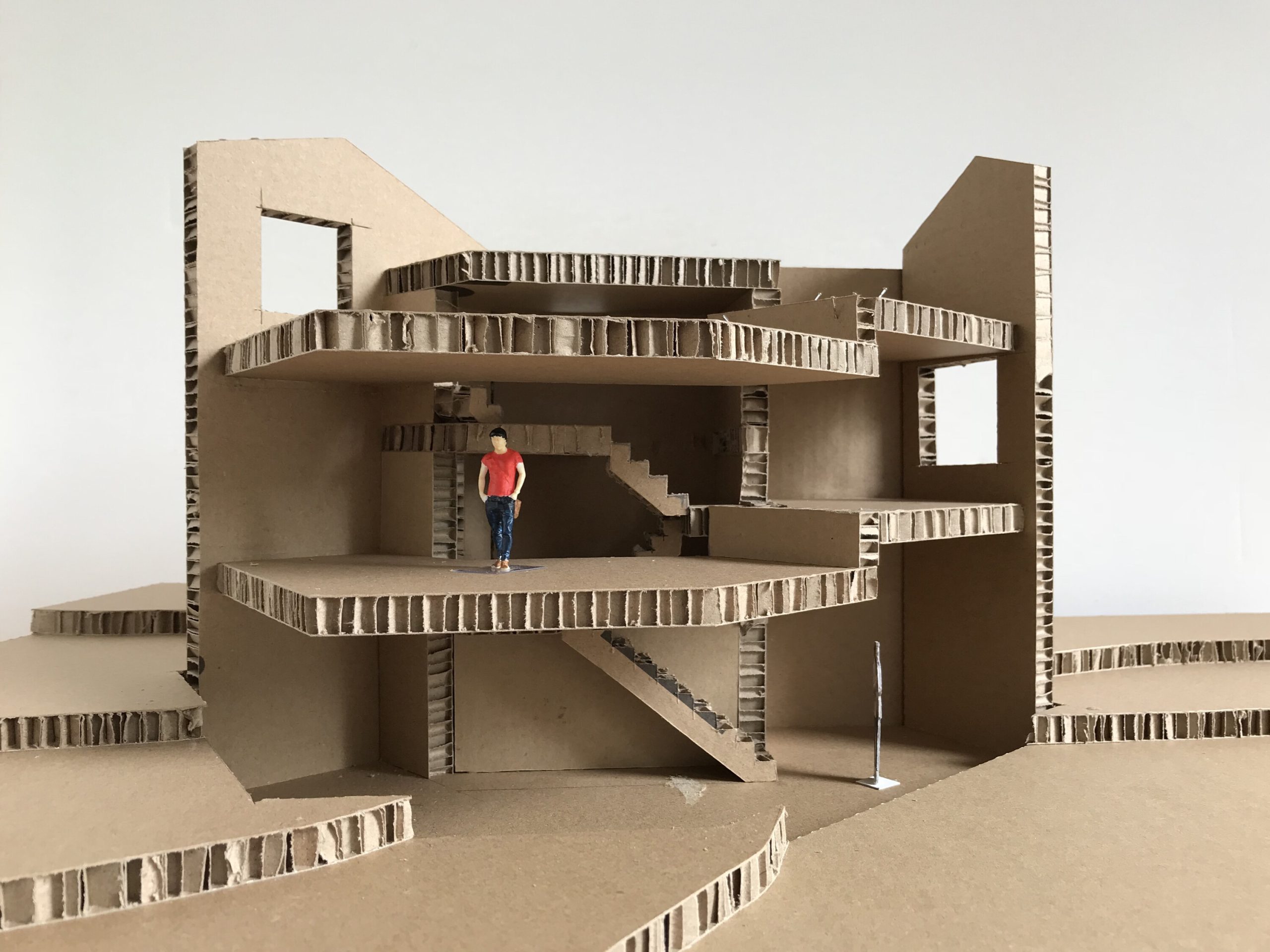 Circulation within House with Seven Floors is more than a means of movement; it serves as a central architectural element that connects and choreographs the entire spatial sequence. At the heart of the pentagonal plan of the ‘cave,’ a triangular steel staircase plays the role of the primary vertical link, guiding the eye and body through a continuous, upward spiral across all seven levels. This fluid ascent eliminates the need for conventional corridors, thereby preserving usable floor space. The stairwell works in concert with the exposed concrete walls, which serve as the structural spine of the building. Together, these three elements—wall, stair, and void—interlock with distinct roles: the concrete forms the architectural backbone, the stairwell reads as a sculptural centerpiece, and the central void acts as a conduit for light, articulating the house’s conceptual core: the Vertical Cave of Light.