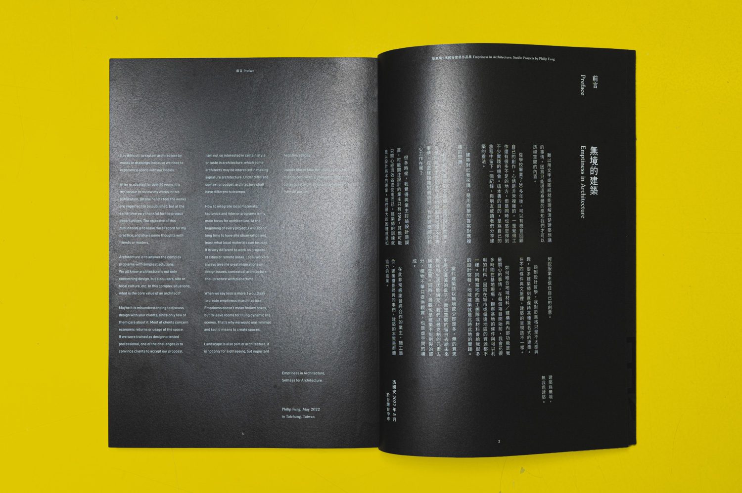 This passage appears in the foreword to Emptiness in Architecture, a bilingual volume (Chinese and English) published by Garden City Publishers (田園城市生活風格書店) in Taiwan. The book brings together over two decades of work by Philip Fung (馮國安), the Hong Kong-born architect who founded Elsedesign in Taiwan. Fung’s formative years included time at Herzog & de Meuron, and he now serves as an assistant professor in the Department of Architecture at Tunghai University. Across six chapters: Duality, Formless, Complexity, Livelihood, Ideology, and a concluding Reflection, the book traces Fung’s approach to architecture and furniture design.