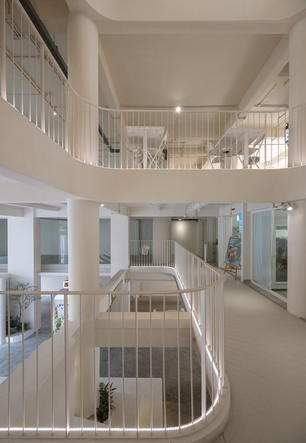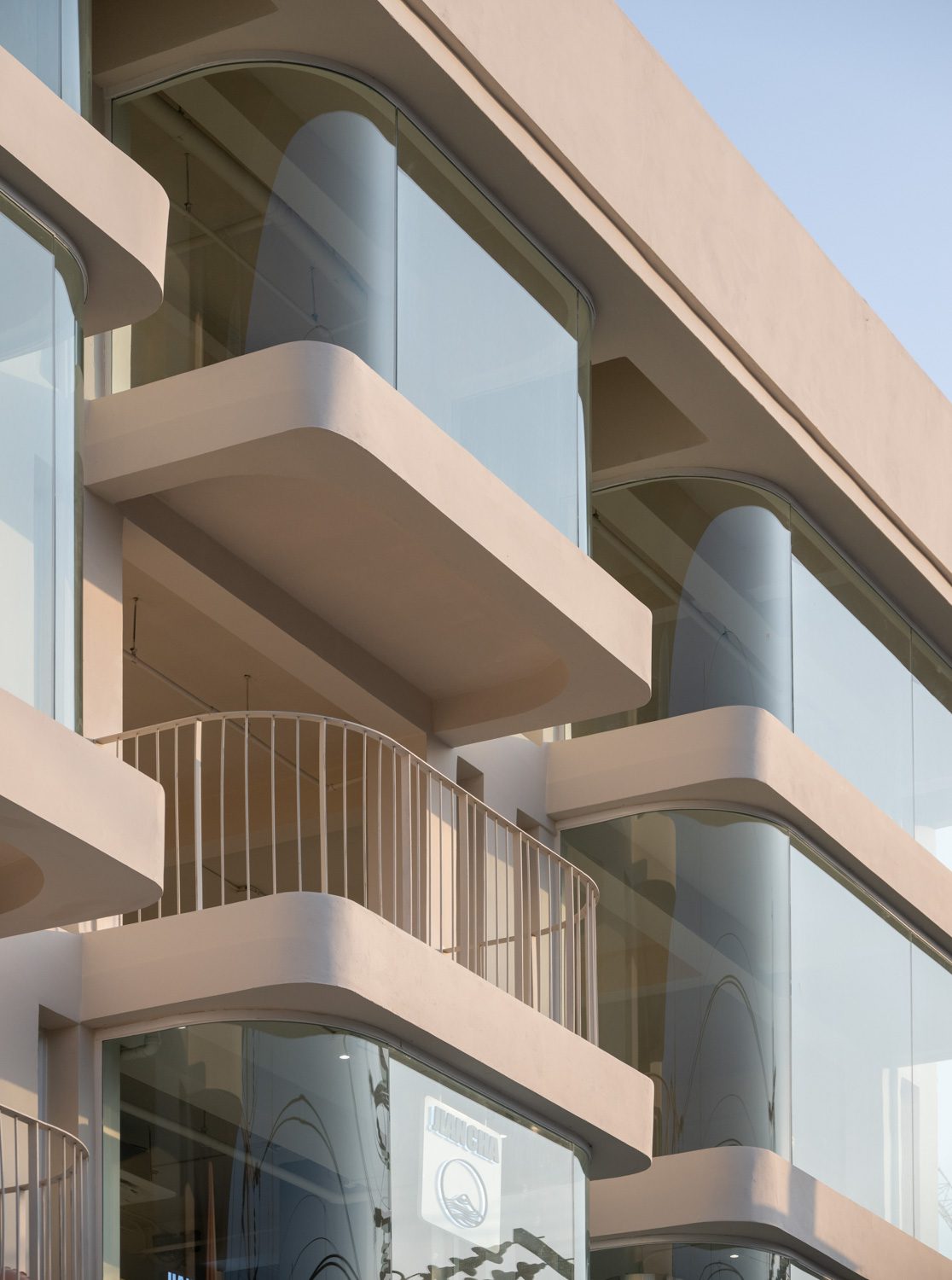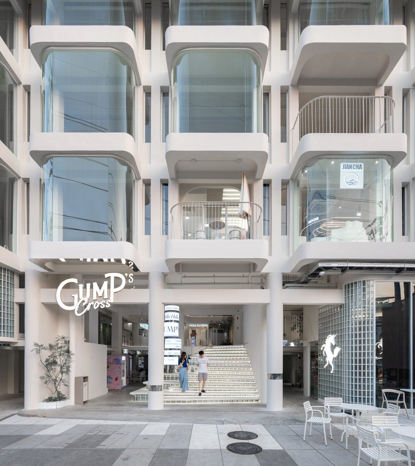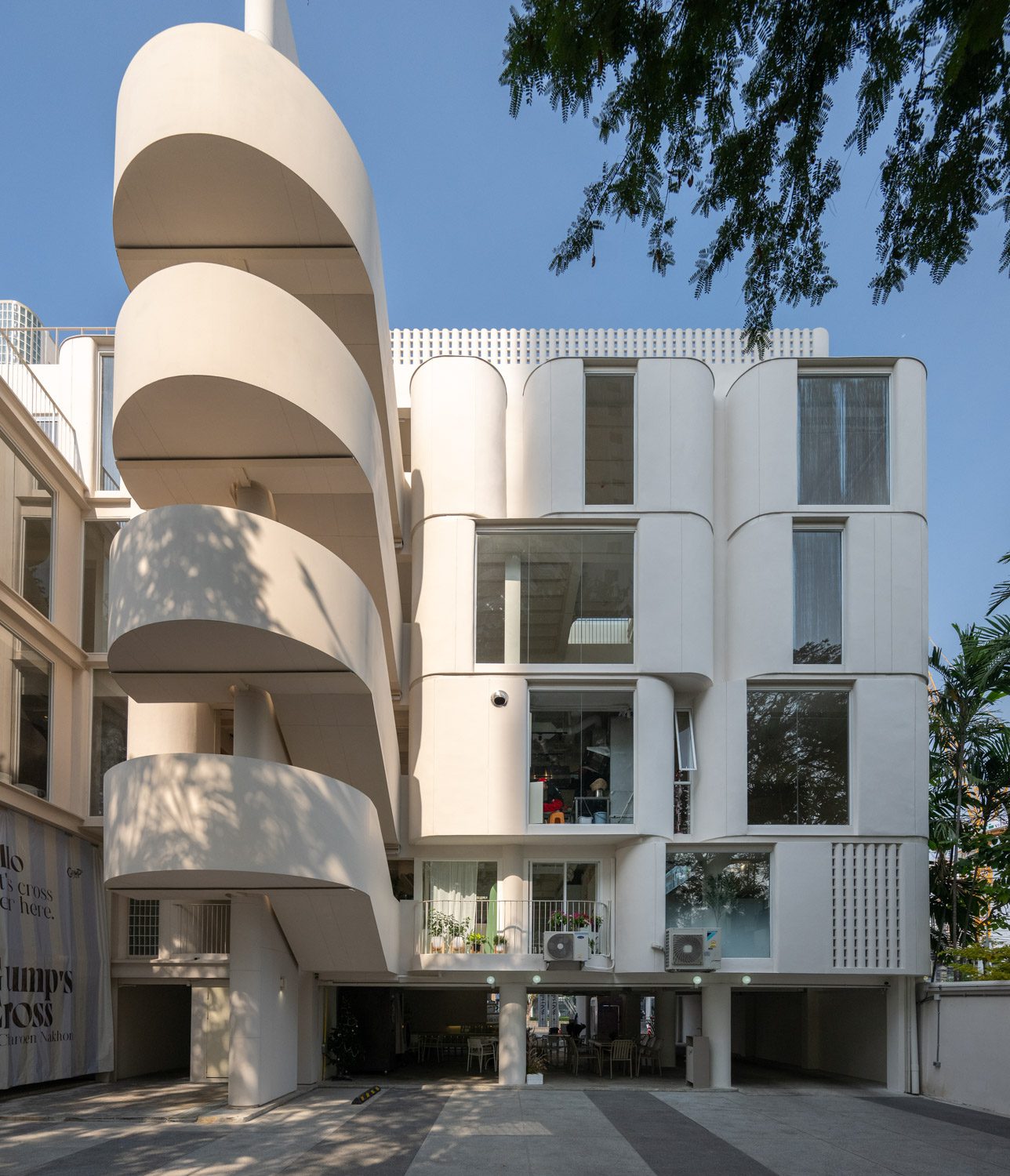GUMP’s Cross was conceived as a building with a dual façade, presenting itself to the city on both the front and rear. The front façade, which faces Charoen Nakhon Road, serves as a dynamic display for the retail spaces within. A series of softly curved glass bays offer glimpses into the diverse interiors and activities of each shop, creating a sense of vitality and movement. This design approach emerged from a close study of the original structure, which revealed traces of a former balcony system. Over time, commercial use led to permanent modifications. Cement walls were added to support large signage and advertisements, effectively sealing off the original openness. In this renovation, those cement walls were removed and replaced with the new curved glass balconies, reviving the building’s sense of openness and interaction.