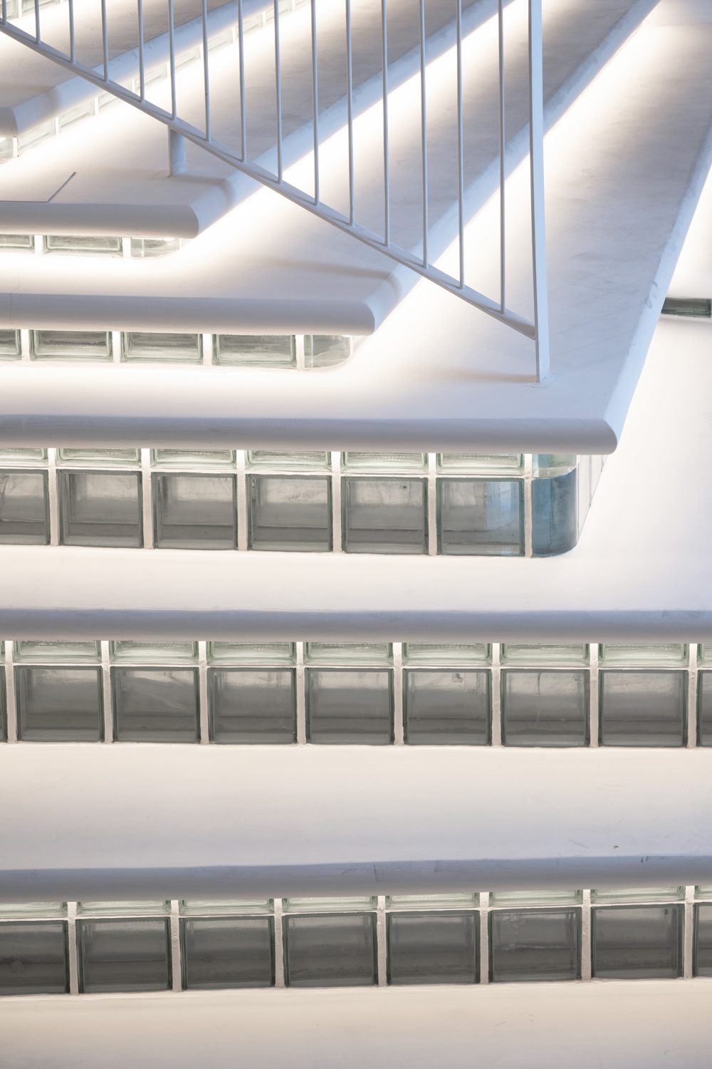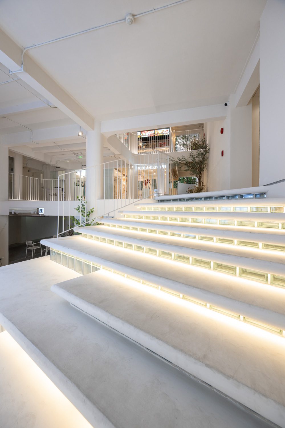 “We can guide a user’s movement through light,” explains Ekaphap. “People tend to avoid dark corners or spaces where they can’t see what’s inside. That’s why we use light as a way-finding tool, or transparency through glass and glazing, to reveal what’s just beyond.” This principle informed the decision to use glass blocks for the large staircase at the front of the building. Due to its substantial mass, there was a risk the staircase could block light and cast shadows, making the space feel dim and uninviting. Using translucent materials, therefore, became an effective solution. Additional openings were also introduced to let in more daylight, reducing reliance on artificial lighting during daytime hours. These strategically placed apertures create a luminous sequence of spaces, inviting users to explore or linger throughout the building. One of the most prominent interventions was the addition of a large skylight. Not only does it flood the upper floors with natural light, but it also draws the eye, and the feet, upward toward the rooftop. This uppermost level was transformed into a gathering terrace, now shared with a vinyl bar, offering a relaxed destination for evening hangouts under the open sky.
