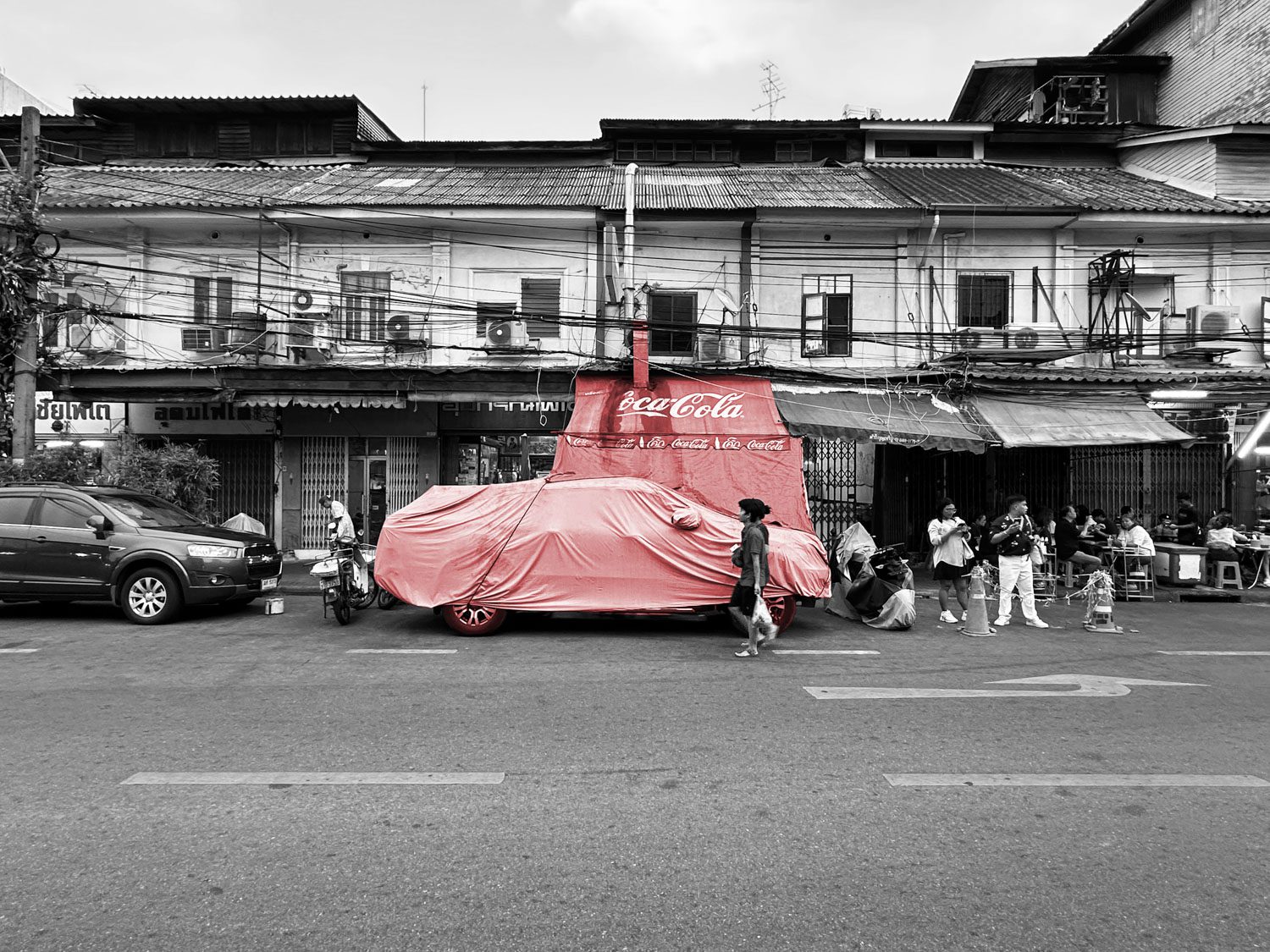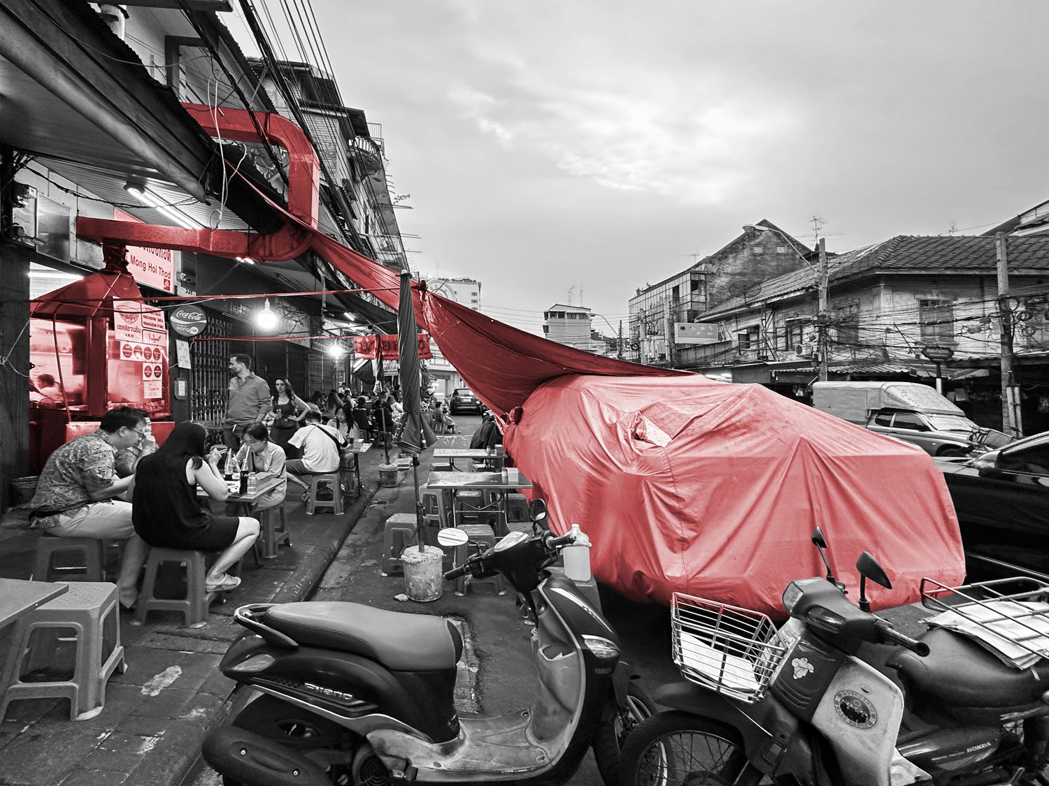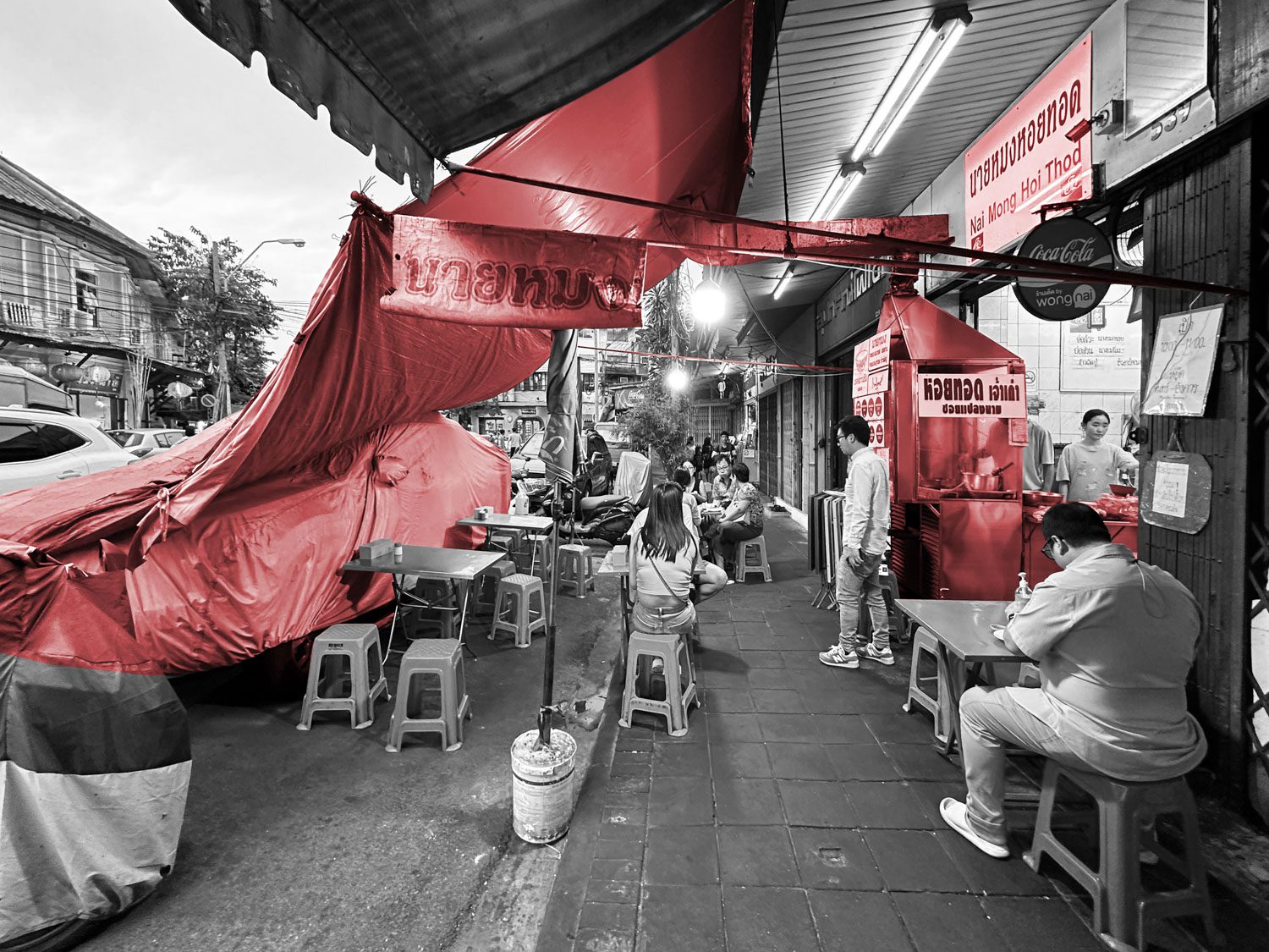 In Thailand, shophouses are a popular building typology for both living and retail. Many shophouse owners widen their frontage by stretching canvas awnings over the sidewalk as temporary roofs. One eatery has taken this strategy to the extreme, annexing the parking bay in front of its shop and sheathing it with PVC tarpaulin, thereby providing shade, ventilation, and a lively semi-outdoor dining area. This adaptation reflects the flexibility and creativity of Thai street-food culture and tropical urbanism.