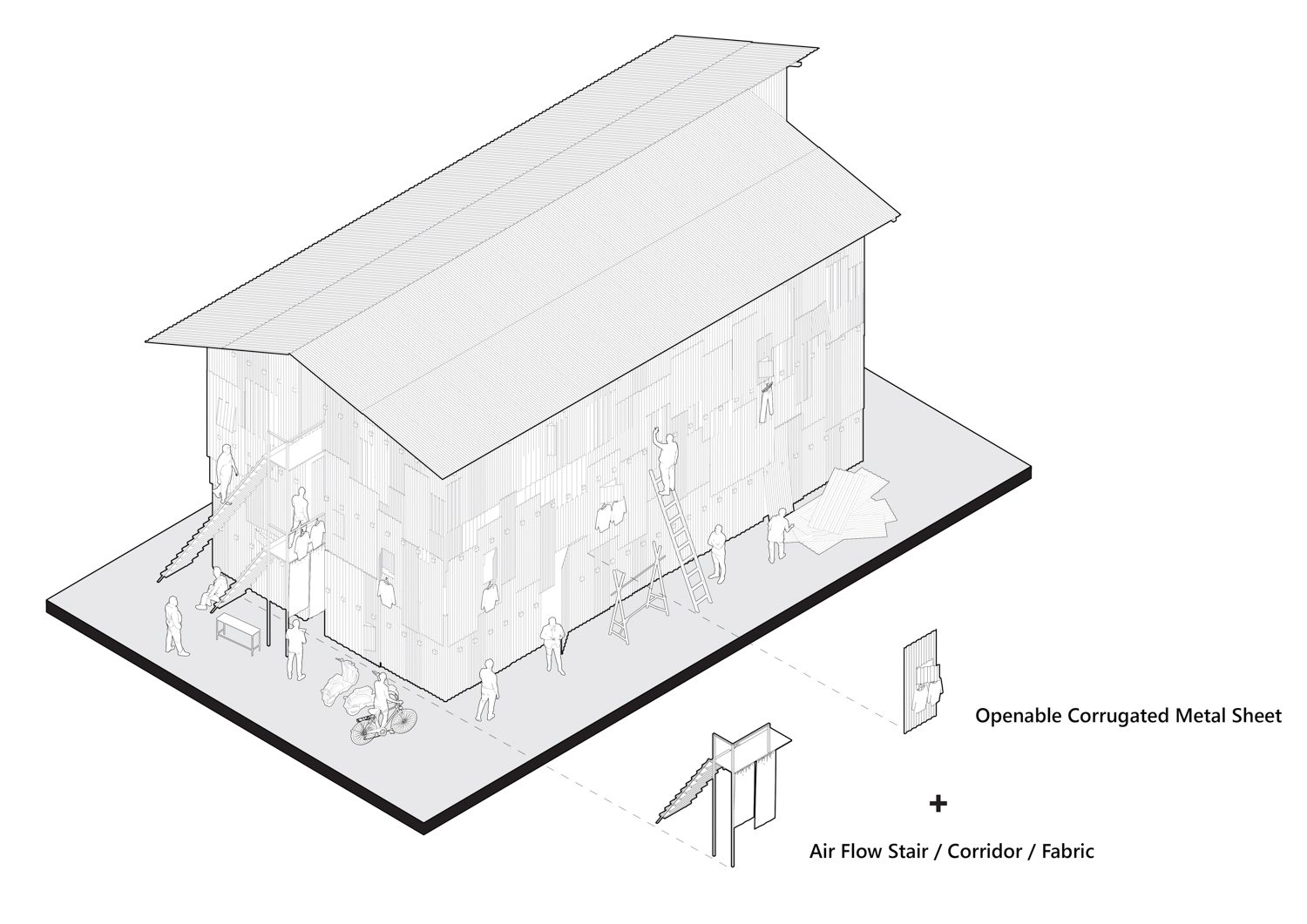 The structure emphasizes affordability, airflow, and natural daylight. Its exterior walls are clad in metal sheets, punctured with randomly placed holes created by the residents themselves. These perforations allow fresh air and sunlight to enter the building easily. The materials are inexpensive and readily available in local markets, making the construction process more accessible while maintaining the quality of short-term living. This simple method reduces the need for electric ventilation and artificial lighting, resulting in an energy-efficient and climate-responsive living space. A central walkway runs through the middle of the building and is supported by scaffolding. This corridor enhances airflow and lighting on both sides, increases the number of rooms, and provides a communal space where residents can gather and connect.