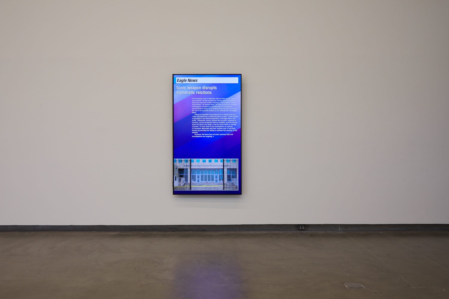 The exhibition then turns to the work of Sung Tieu, who directs our attention to a digital billboard bearing the headline Sonic weapon disrupts diplomatic relations (2024). The piece recalls an incident in 2016 at the Hotel Nacional in Havana, Cuba, where diplomats and their families reported symptoms of hearing loss, dizziness, and headaches attributed to ultrasonic waves whose source could not be identified. Occurring within a socialist nation formerly under communist rule, the episode came to be known as ‘Havana Syndrome,’ after the city where it was first documented. The incident resulted in a temporary downgrading of diplomatic relations between the United States and Cuba.