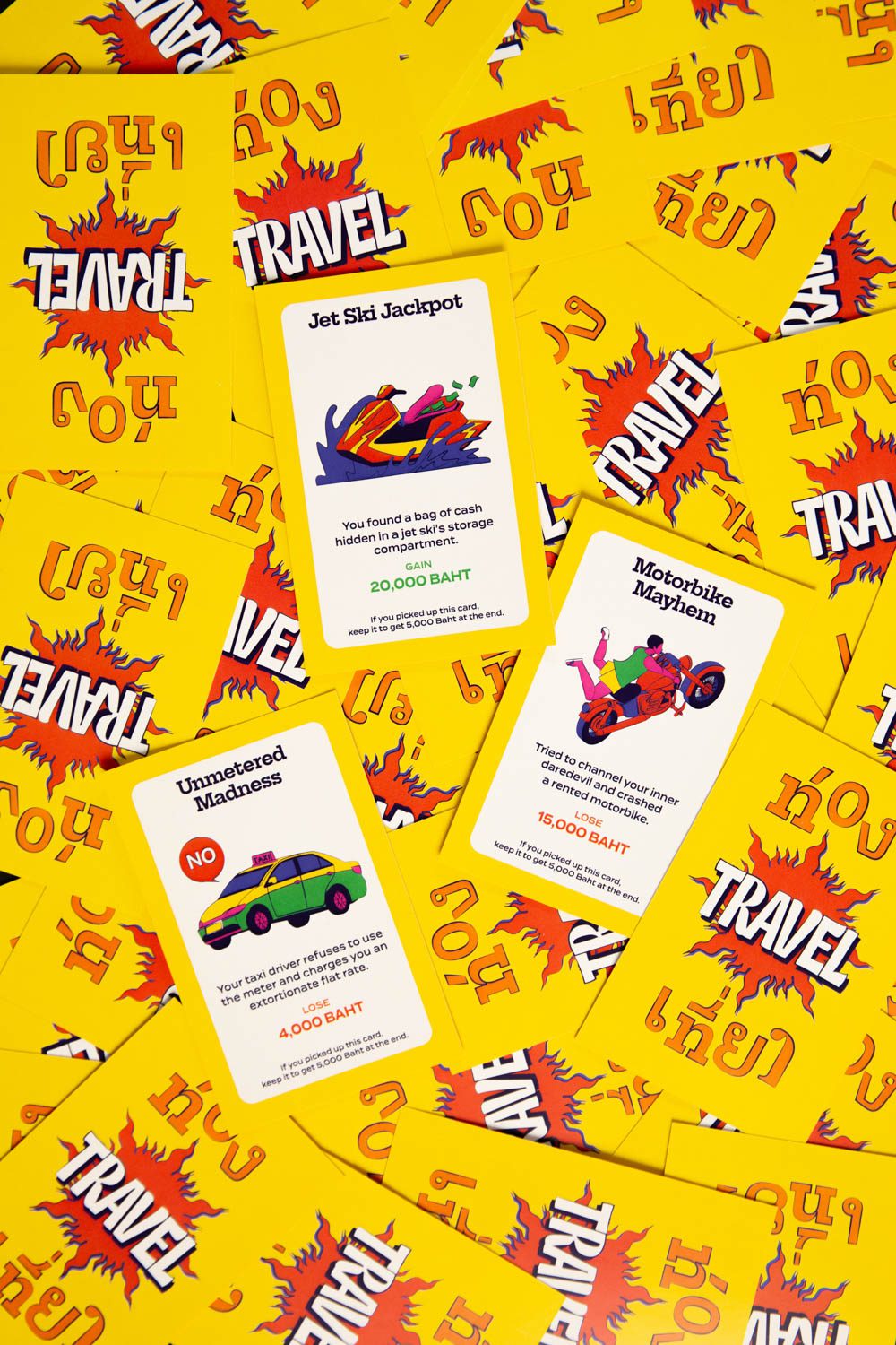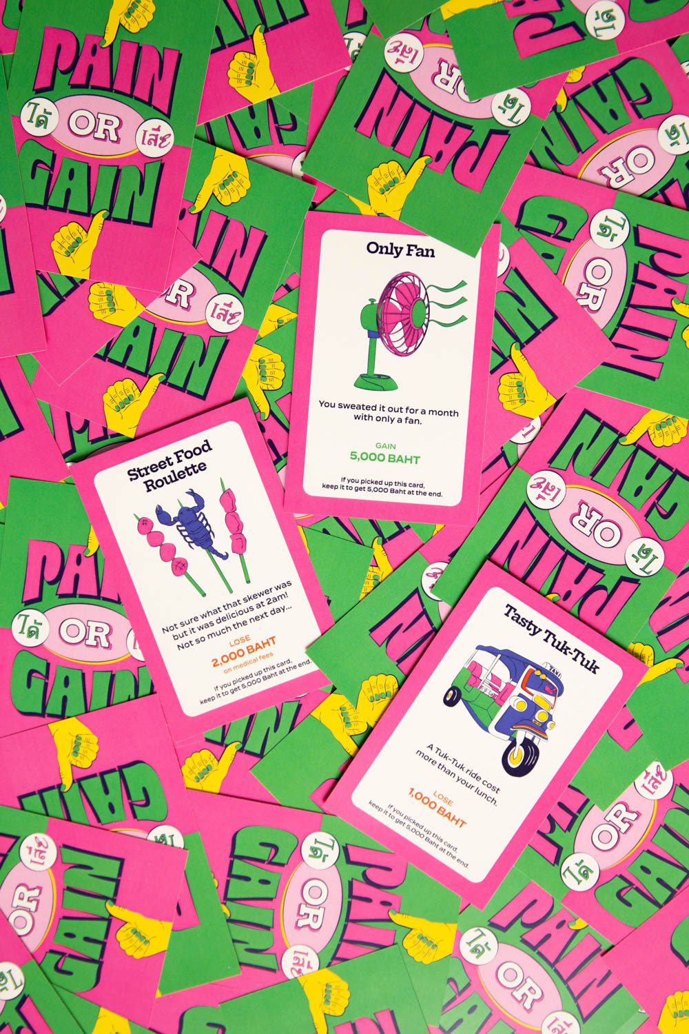 From concept to execution, Bangkok Pains comes complete with all the components of a classic board game: an instruction manual, a game board, player tokens, cash, and four categories of special cards (Career, Property, Pain or Gain, and Travel), along with a single credit card that stands as a symbol of debt. Along the way, players who manage to accumulate enough money can choose to pay off their card, while those hit with unexpected expenses may request a new card and take out additional cash. Bankruptcy, however, is not an option: every player must endure the bittersweet comedy of life in Bangkok until the year, and the game, reaches its end.