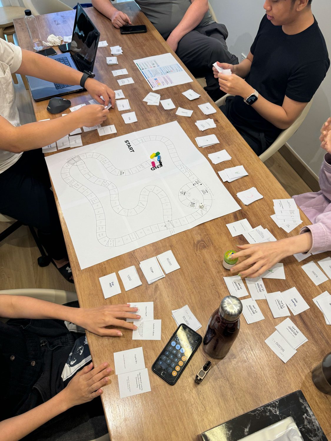 Invisible Ink chose to define the game’s ‘pains’ in two principal ways. The first is rent, a fixed expense drawn from the Property card at the very start. The second is the near-constant draw of Pain or Gain cards, where the hazards are all too familiar: a shattered phone screen, a surprise common area bill from the condo juristic person, or even losing a turn after missing an MRT stop because you were glued to your phone. At a certain point, every player must also decide whether to take an extended holiday, foregoing their salary but exempt from paying rent. However, from firsthand experience at a recent event where the game was played, it was clear that very few chose the holiday route. Almost everyone was intent on amassing as much money as possible.