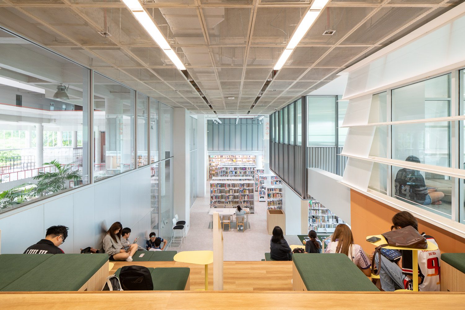 Turning left from the entrance leads to the second zone, a double-volume space that visually connects the ground floor and the mezzanine. This area accommodates reading activities alongside quieter group interactions, allowing conversations without disturbing others. The collection here spans a wide range of subjects across all eight academic disciplines taught within the faculty. The space encourages an informal, exploratory mode of reading. Students from any field can freely pick up books beyond their own discipline, reflecting the library’s educational philosophy of integrated and self-directed learning through cognitive engagement. At the heart of this zone, the main reading area merges seamlessly with the central staircase that links the two levels. Seating is interwoven into the wide stair treads, transforming the steps themselves into a landscape of reading nooks. This design invites users to interpret their own ways of sitting in relation to the architecture, whether perched on the 20 x 40-centimeter steps or reclining on the cushions provided.