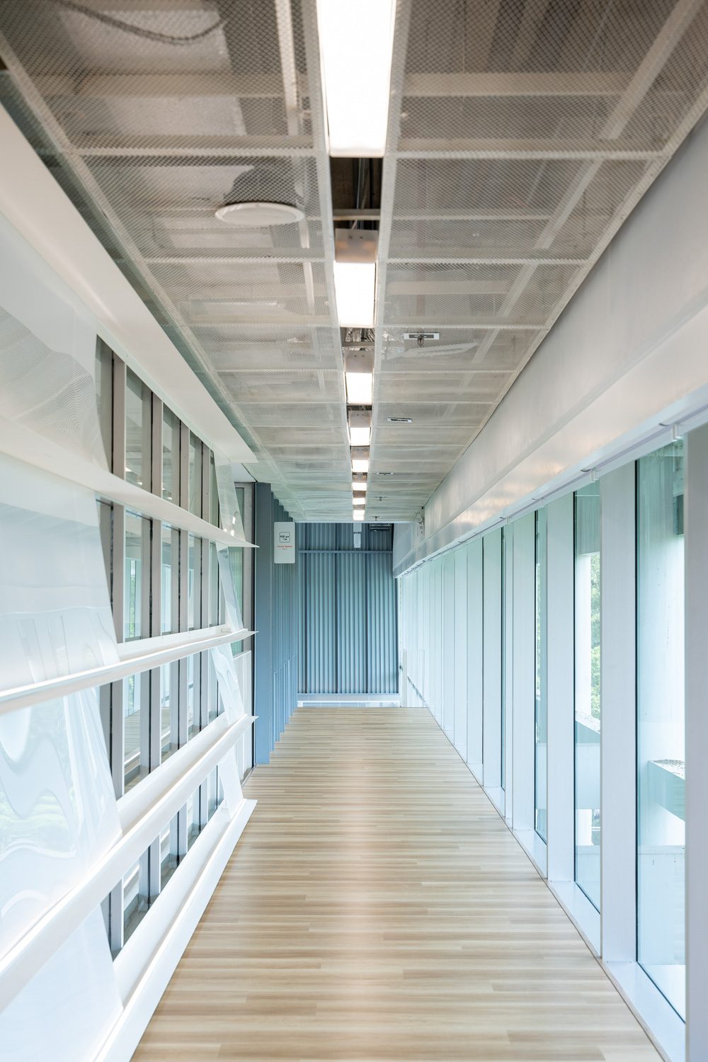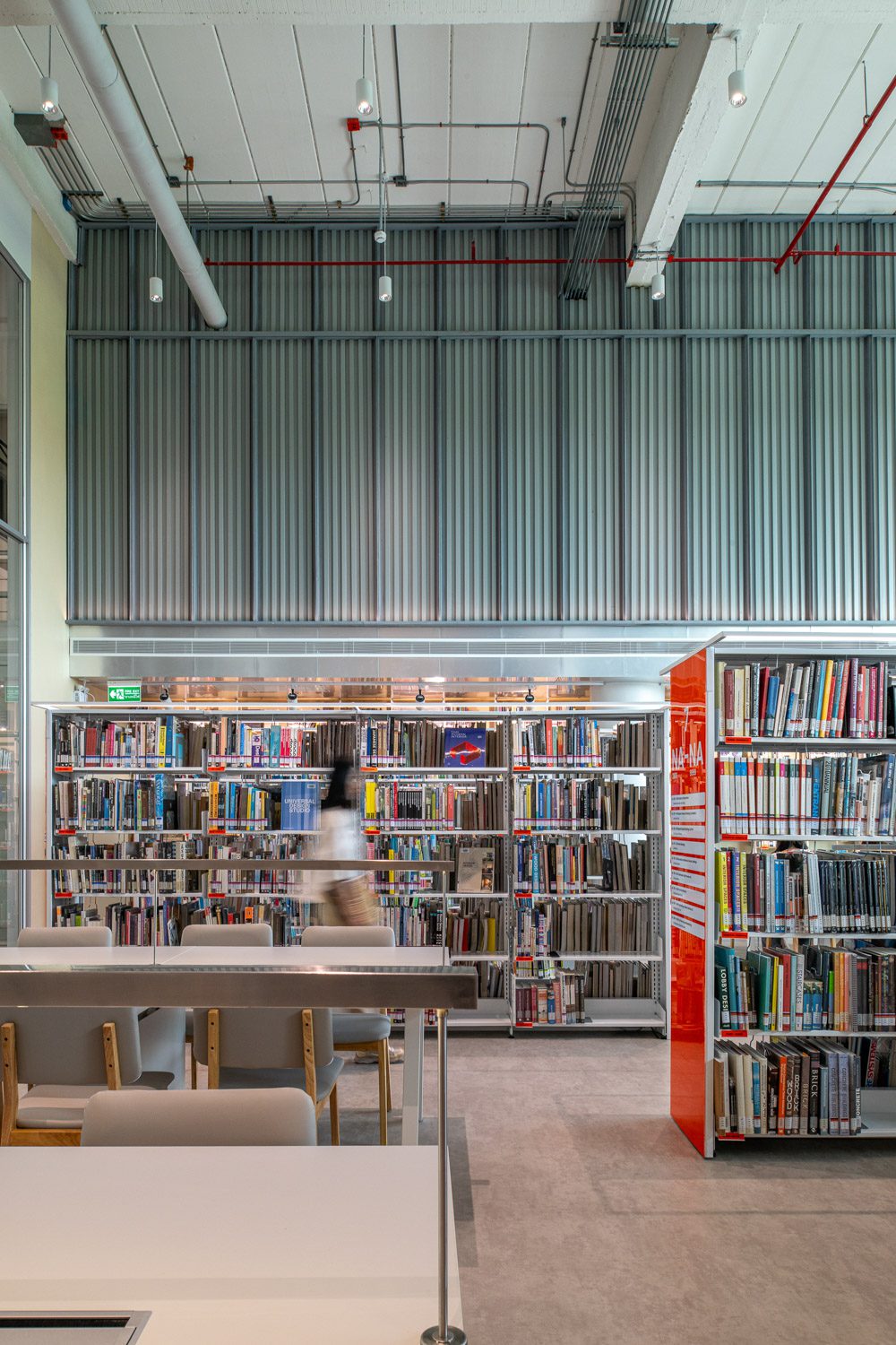 The first material is corrugated steel panels, which form much of the interior wall surfaces. These metal sheets, finished in varying textures and degrees of opacity, define areas that require clear separation or heightened concentration. Their solidity provides a sense of enclosure and focus, subtly guiding users toward quieter, more introspective zones.