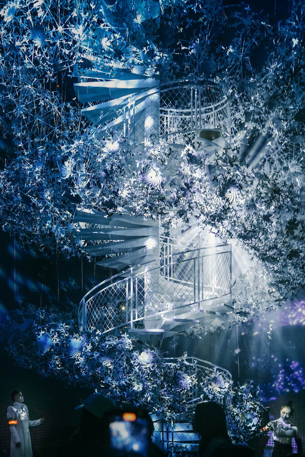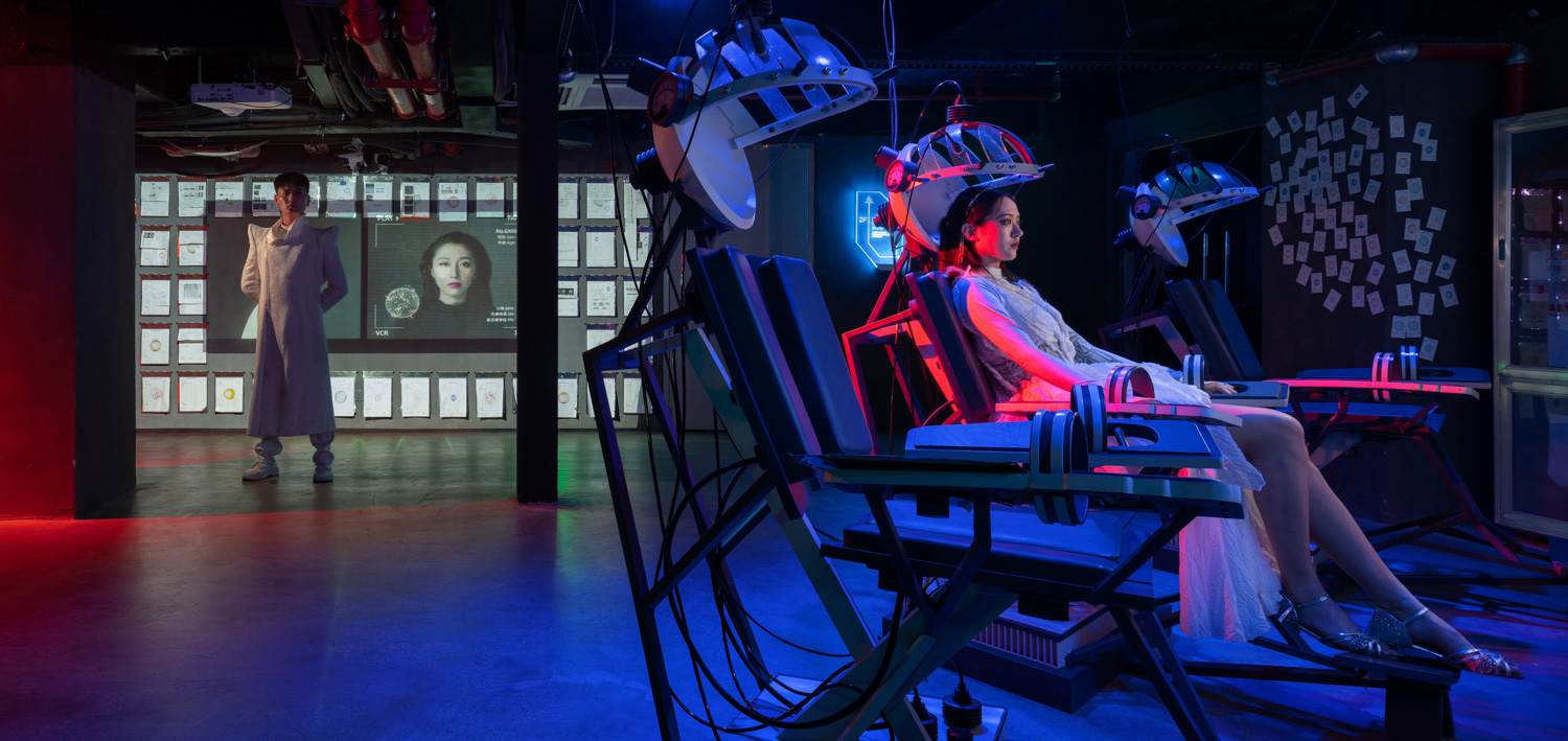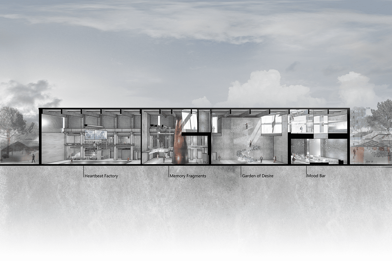 The interior of the main building within the Theatrical District therefore departs entirely from the model of a traditional theater defined by a fixed stage surrounded by rows of seating. Instead, space is fragmented and distributed into a sequence of spatial episodes, each offering a different experience shaped by movement and circulation. Performances are conceived as immersive and participatory, allowing both the acts themselves and the architectural setting to become narrative agents. Audiences are invited to immerse themselves in the performance, as if stepping directly into the unfolding narrative. This immersive quality is achieved through a careful orchestration of architectural materials such as glass and metal, the deliberate modulation of spatial compression and expansion, and the integration of art and performance technologies, such as sound design, holographic lighting, projections cast onto threads, and 3D projection systems. Among the project’s highlights is the Heart-beat Factory, a space that functions as a theatrical stage and choreography venue during the day, before transforming into a social club at night, animated by light, sound, and a dramatic ‘floating stage.’ This elevated stage incorporates a large LCD screen that can be raised and lowered, adapted from the factory’s original cranes and cable systems. Re-engineered for contemporary use, these industrial remnants allow the stage to operate seamlessly across both daytime and nighttime programs.
