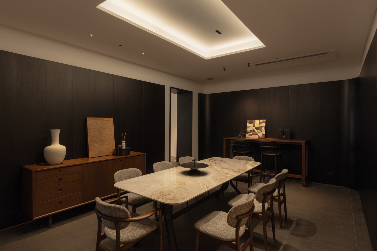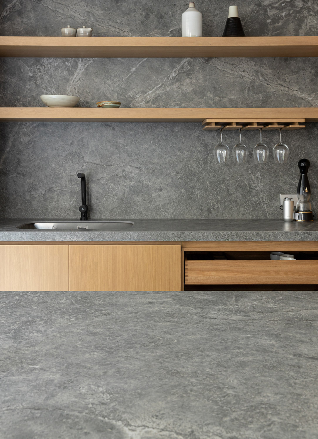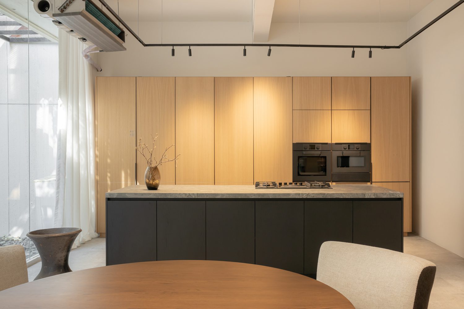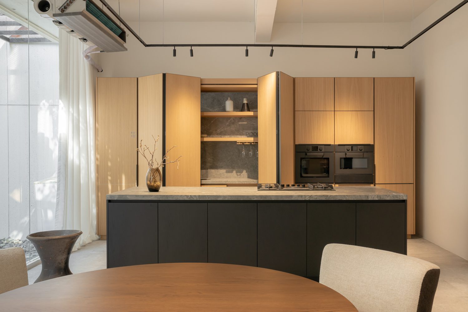 A striking contrast emerges upon entering the ENSO room, an open space on the western side defined by a 3.5-meter ceiling. Conceived to evoke the atmosphere of an afternoon gathering, the room embraces a more dramatic interplay of light and shadow. Its sense of refinement is supported by Blum’s Pocket Door system, which allows the kitchen frontage to disappear seamlessly from view in an instant. This is paired with stone surfaces from COTTO LiFE, developed to diffuse light softly rather than scatter it through glare, creating a balanced dialogue with the surrounding wooden furniture.