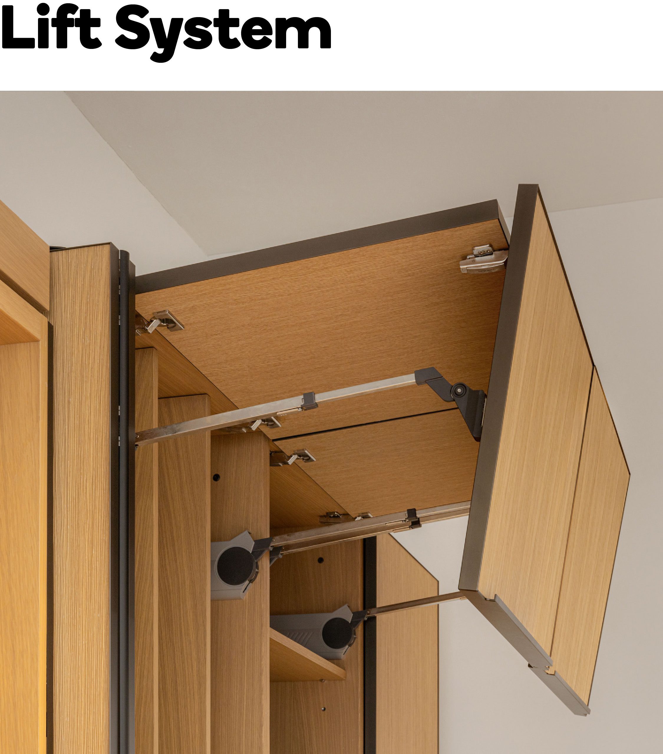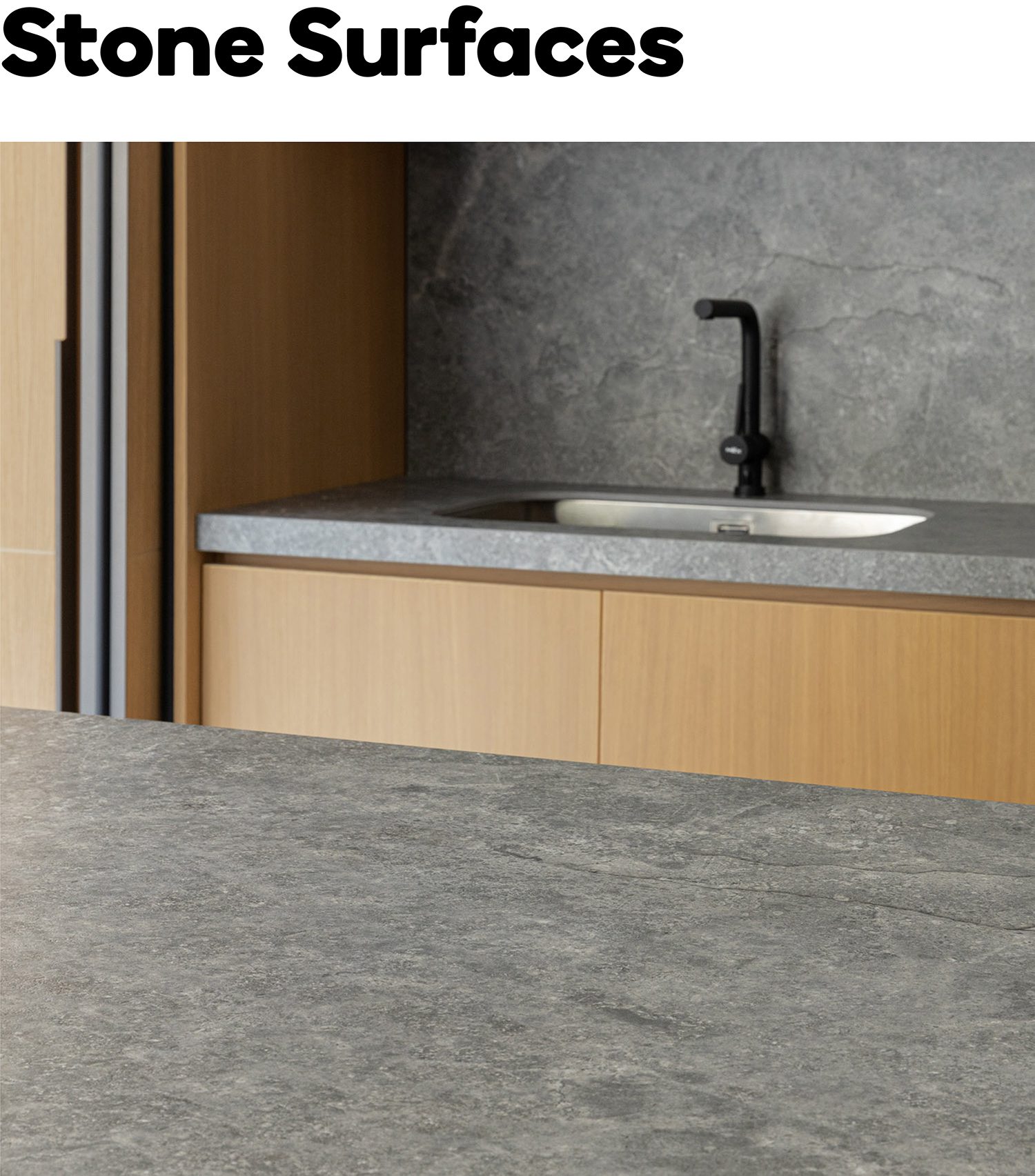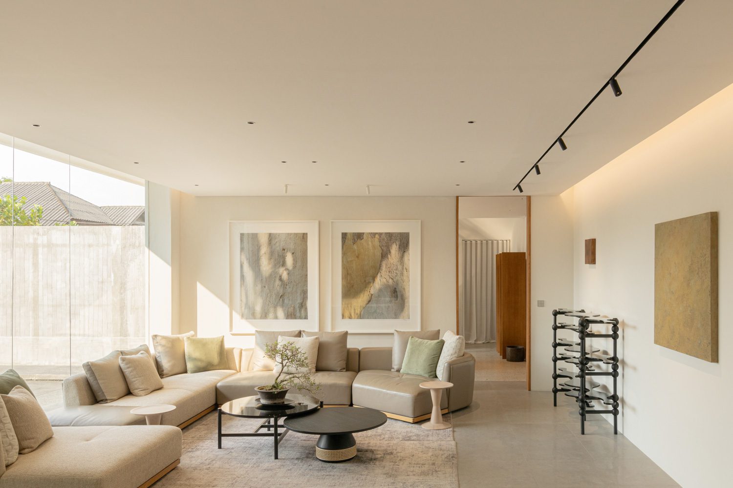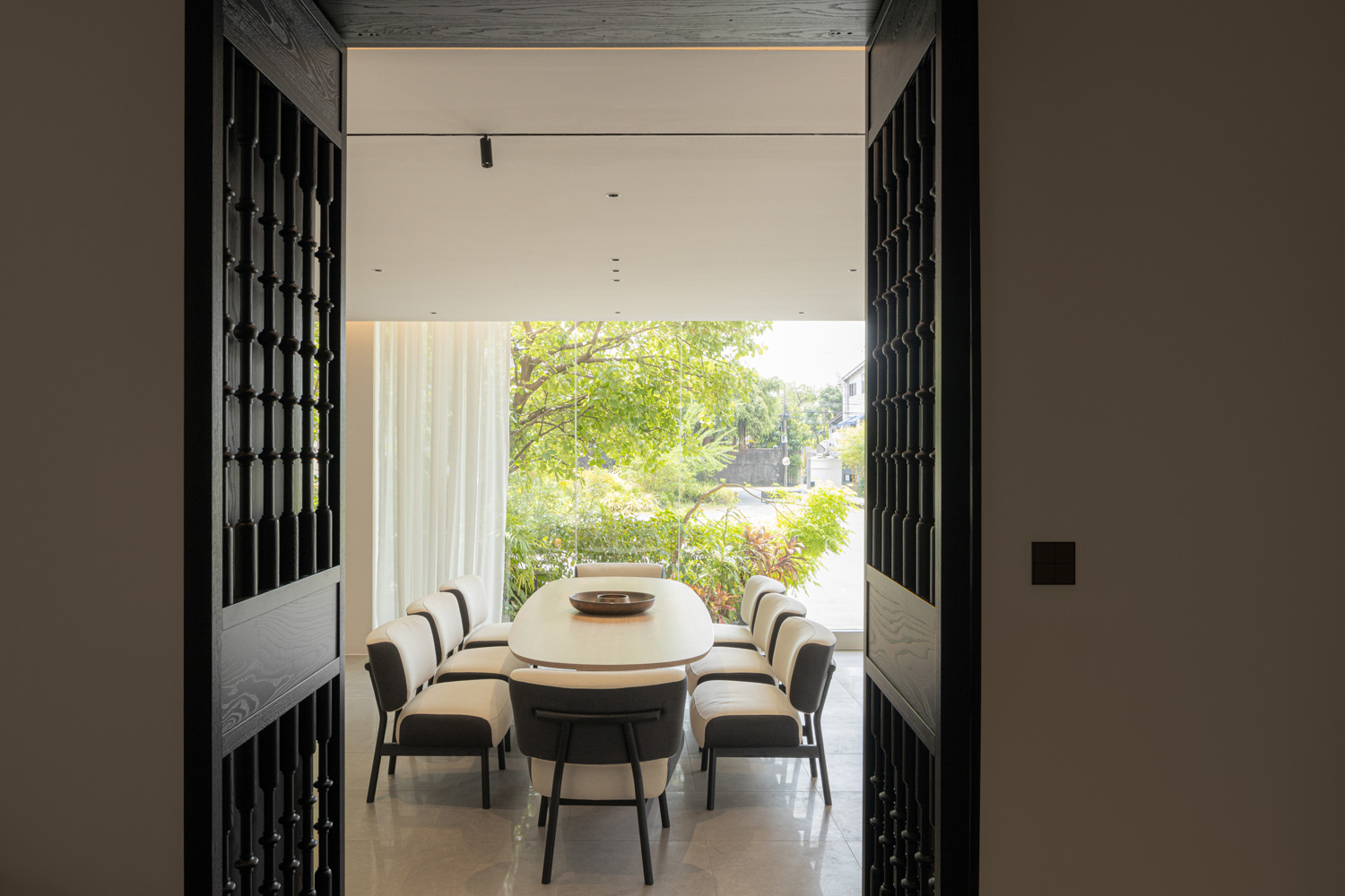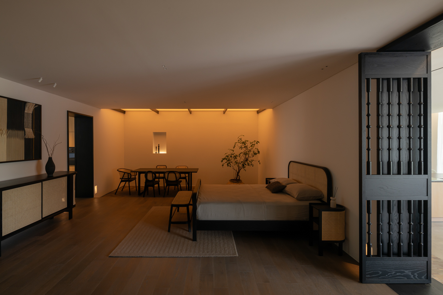 A striking contrast emerges upon entering the ENSO room, an open space on the western side defined by a 3.5-meter ceiling. Conceived to evoke the atmosphere of an afternoon gathering, the room embraces a more dramatic interplay of light and shadow. Its sense of refinement is supported by Blum’s Pocket Door system, which allows the kitchen frontage to disappear seamlessly from view in an instant. This is paired with stone surfaces from COTTO LiFE, developed to diffuse light softly rather than scatter it through glare, creating a balanced dialogue with the surrounding wooden furniture.
