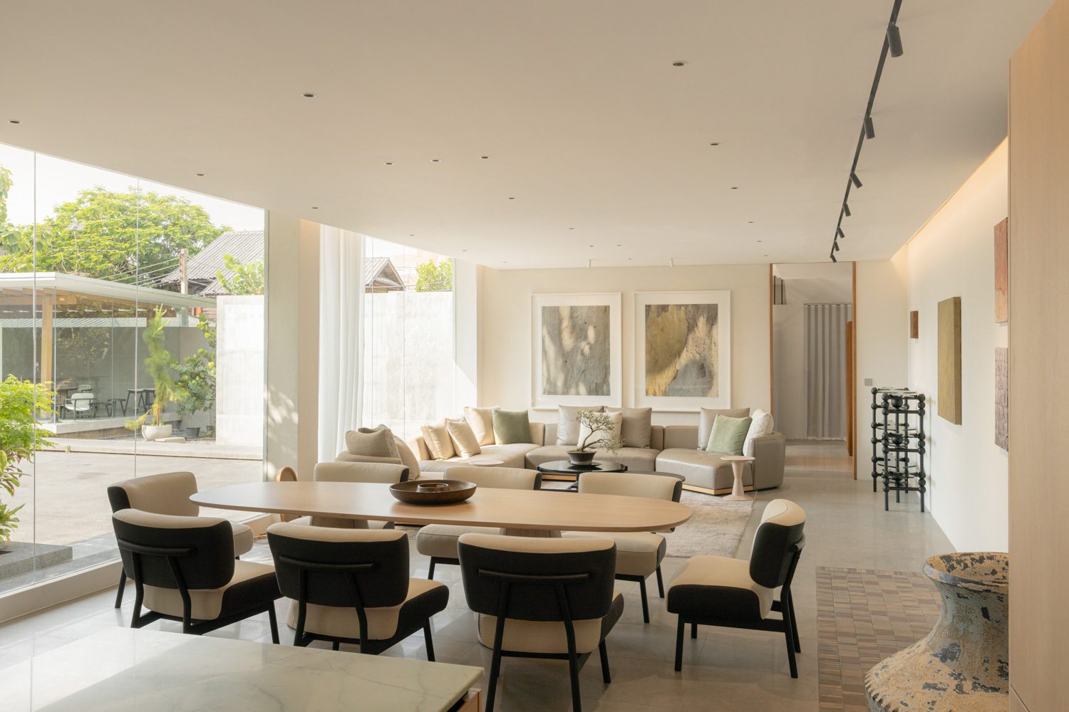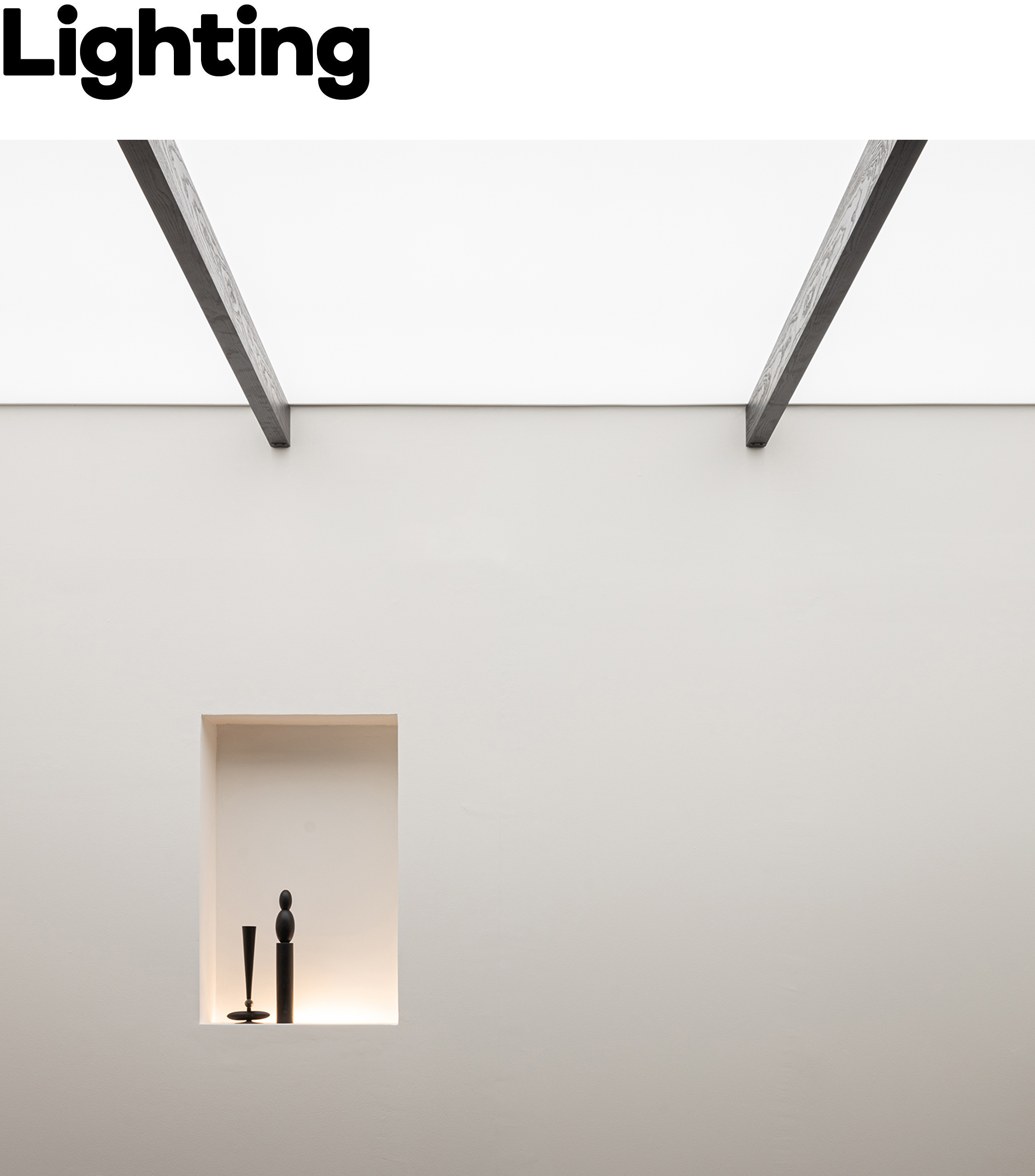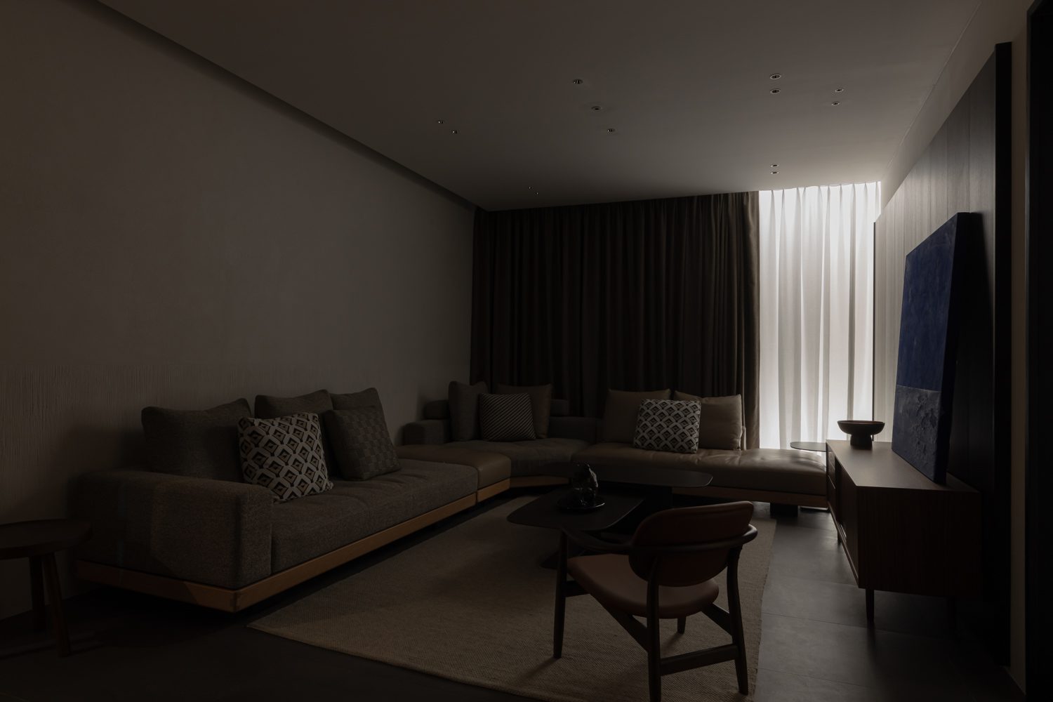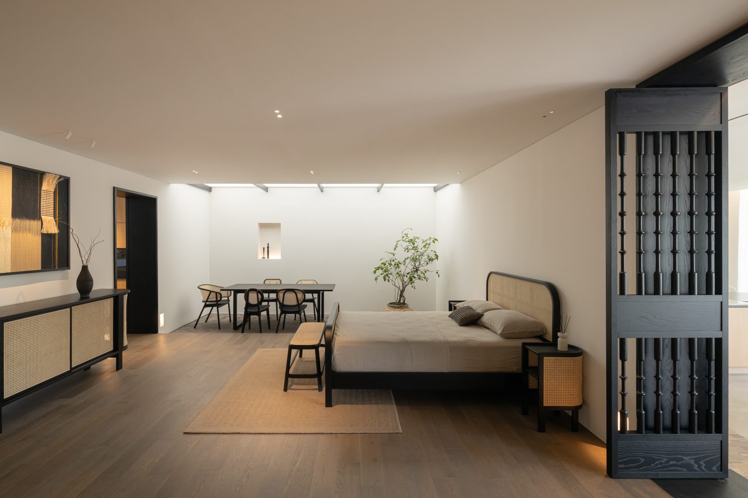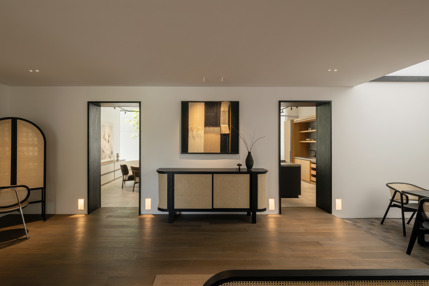 Upon entering the first room on the eastern side, visitors encounter a key transition marked by a long expanse of glazing that welcomes the morning light in full. The gentle sunlight that washes across the space in the early hours softens the sharpness of contrast, allowing the tactile warmth of the wood to come through with particular naturalness. Here, PODIUM introduces a 3,500K light temperature from ENDO Lighting, a soft white tone that lends the room a sense of liveliness, while narrowly angled spotlights, positioned with precision, draw out the grain of the wood and bring the texture of Homework Fabrics’ pet-friendly textiles into focus with quiet sophistication.