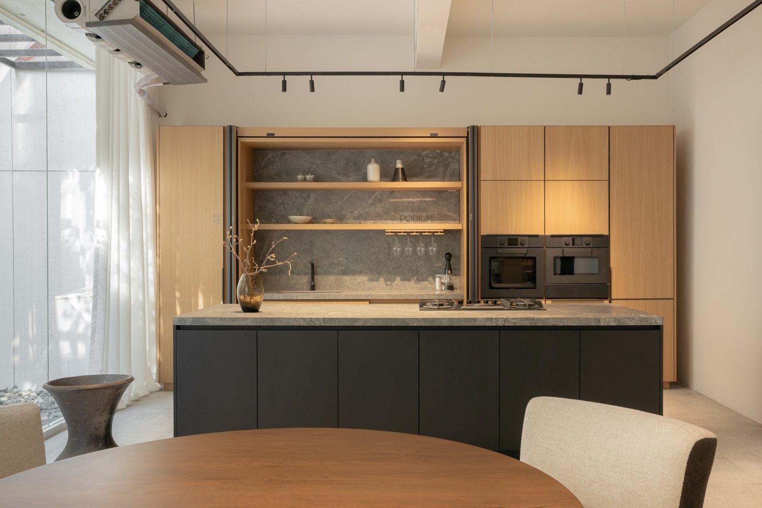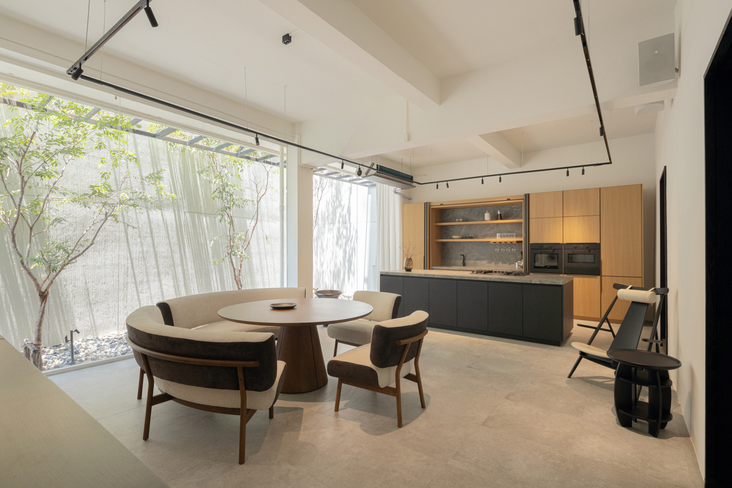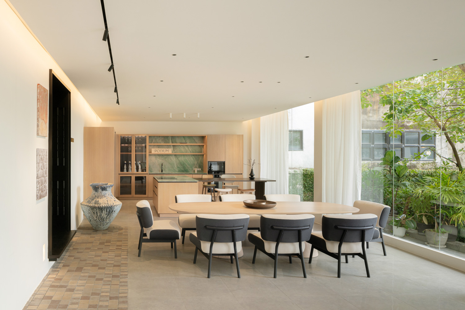 The central premise of the renovation lies in an attempt to create varied states of perception through architectural elements, from ceiling height and spatial width to the changing direction of natural light as it shifts throughout the day. The effect is not unlike the calibrated lighting of a stage set, where each angle is carefully adjusted to cast emphasis on the lead character in a given scene. Rather than illuminating every corner with uniform clarity, PODIUM chooses instead to highlight selected focal points through lighting fixtures designed to bring its own ‘protagonists’ into sharper view. Key brand partners form an important part of this composition, from ENDO Lighting, with its expanded spectrum of color rendering and refined fixture design, to the contemporary textile qualities of Homework Fabrics, the fluid functionality of Blum’s fittings, and innovative stone surfaces from COTTO LiFE. Together, these elements help visitors more readily envision possibilities before them through scenes drawn from the rhythms of everyday living.