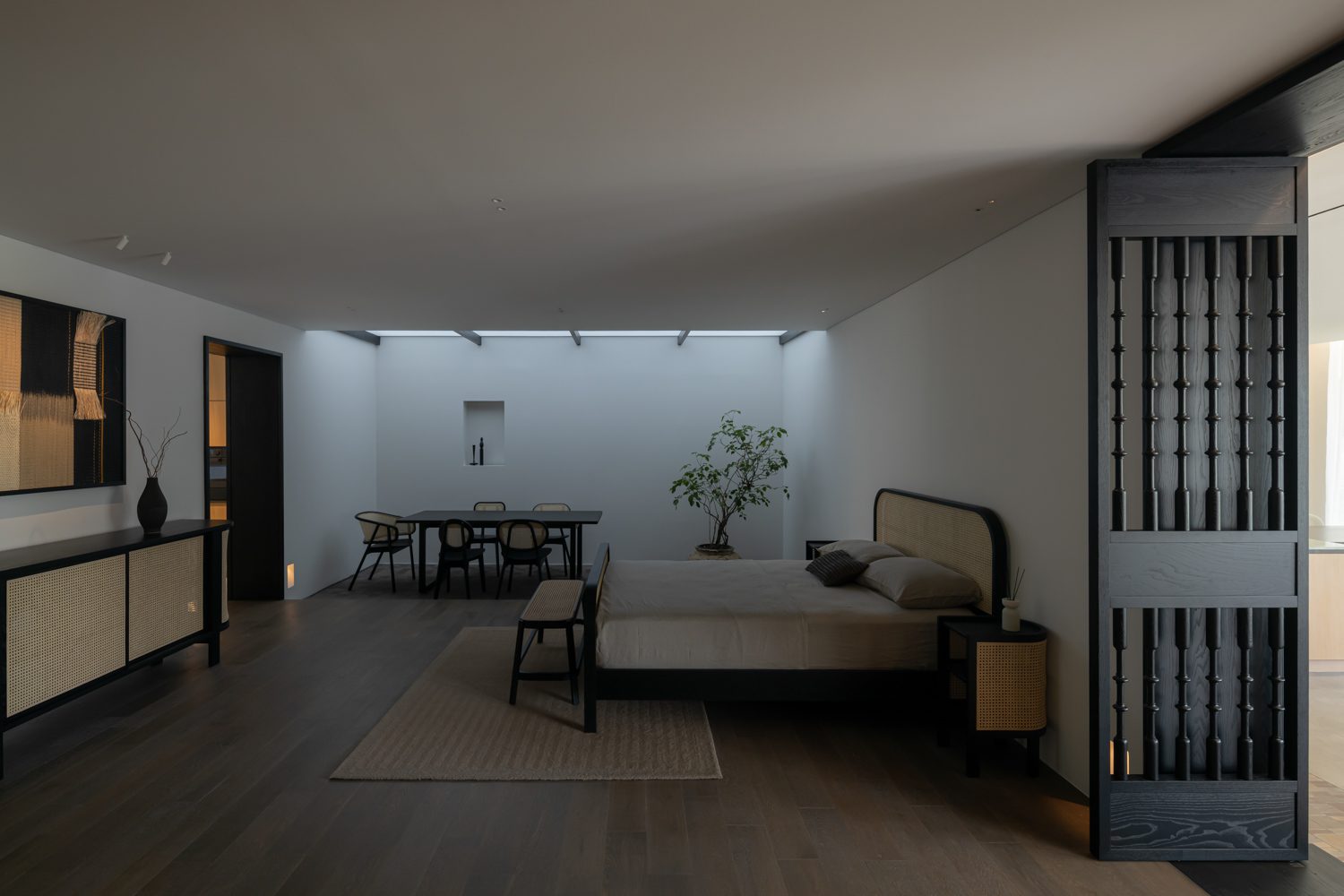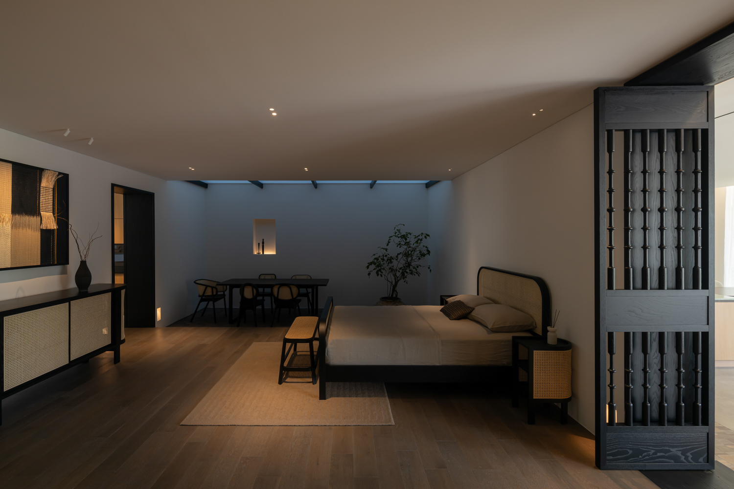 The sequence continues with the CANE room, conceived as a calm and enclosed setting. Its ceiling is lowered to just 2.5 meters, creating an atmosphere that brings the sliced bentwood and woven rattan pieces of the CANE collection into sharper prominence. As one of PODIUM’s signature collections and among the original designs that have carried the Thai brand onto the international stage, CANE is given a setting that feels both intimate and deliberate. Though enclosed, the room incorporates a subtle play of light through ENDO Lighting’s Synca collection, which simulates the shifting qualities of natural daylight over the course of the day. This is further complemented by the rhythm of doors articulated with turned wood detailing, reinforcing the strength of the brand’s Thai design DNA.